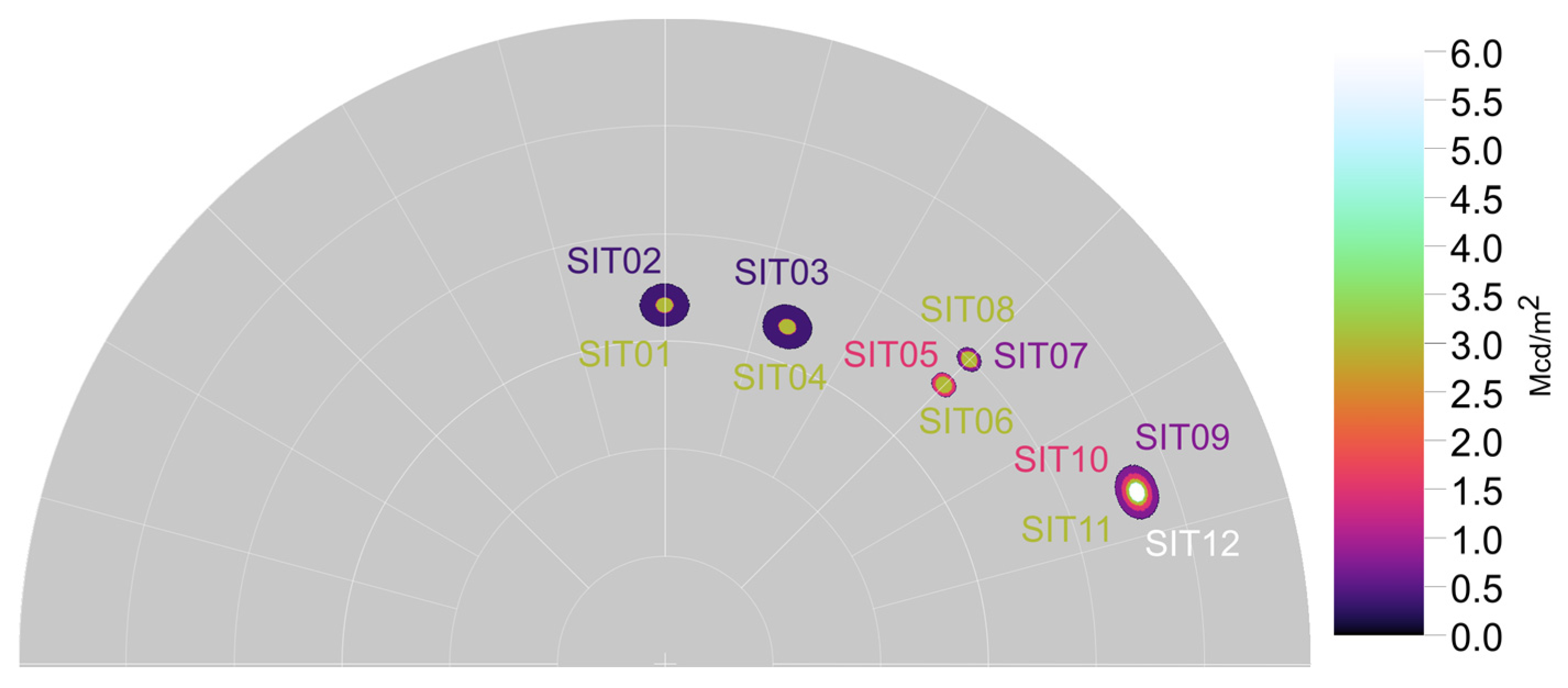 Glare source positions, sizes, and luminance values for main glare situations SIT01–SIT12.