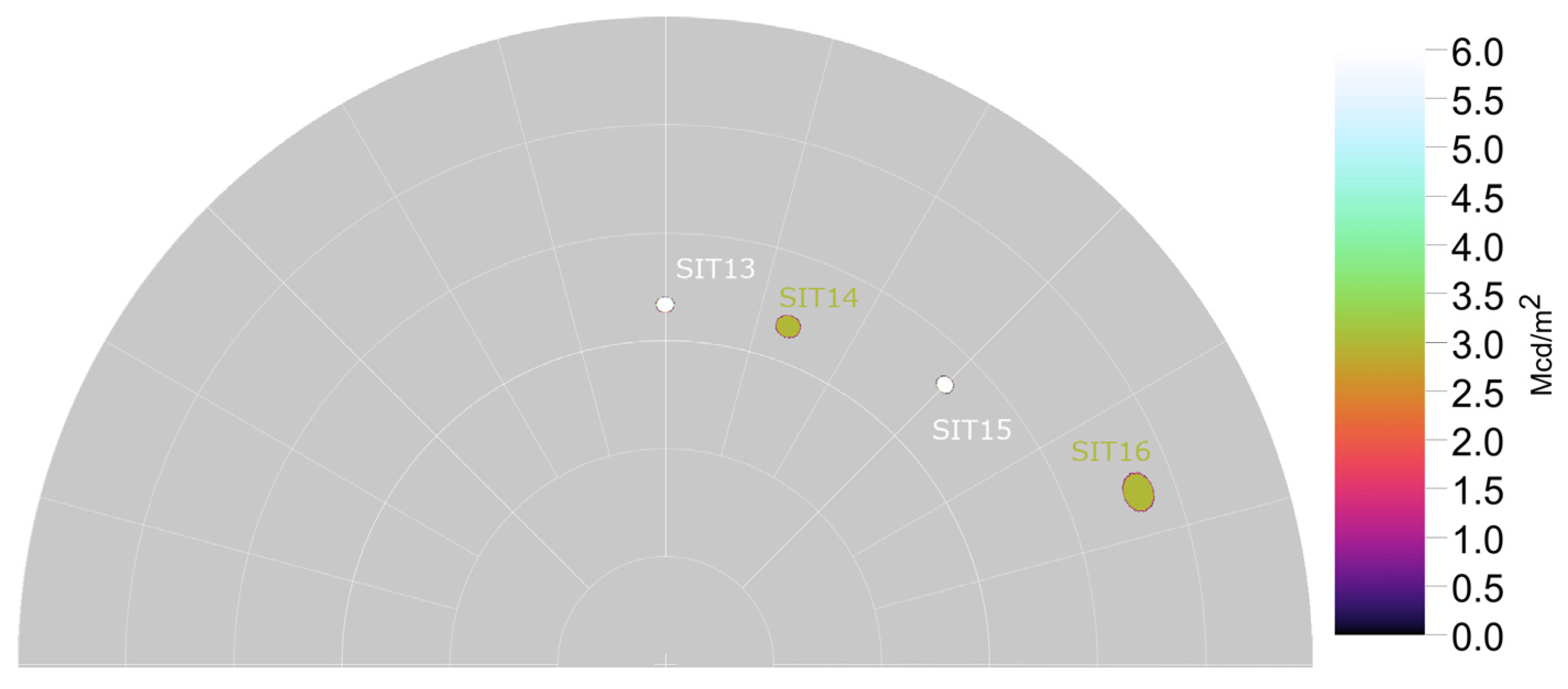 Glare source positions, sizes, and luminance values for additional, high-glare situations SIT13–SIT16.