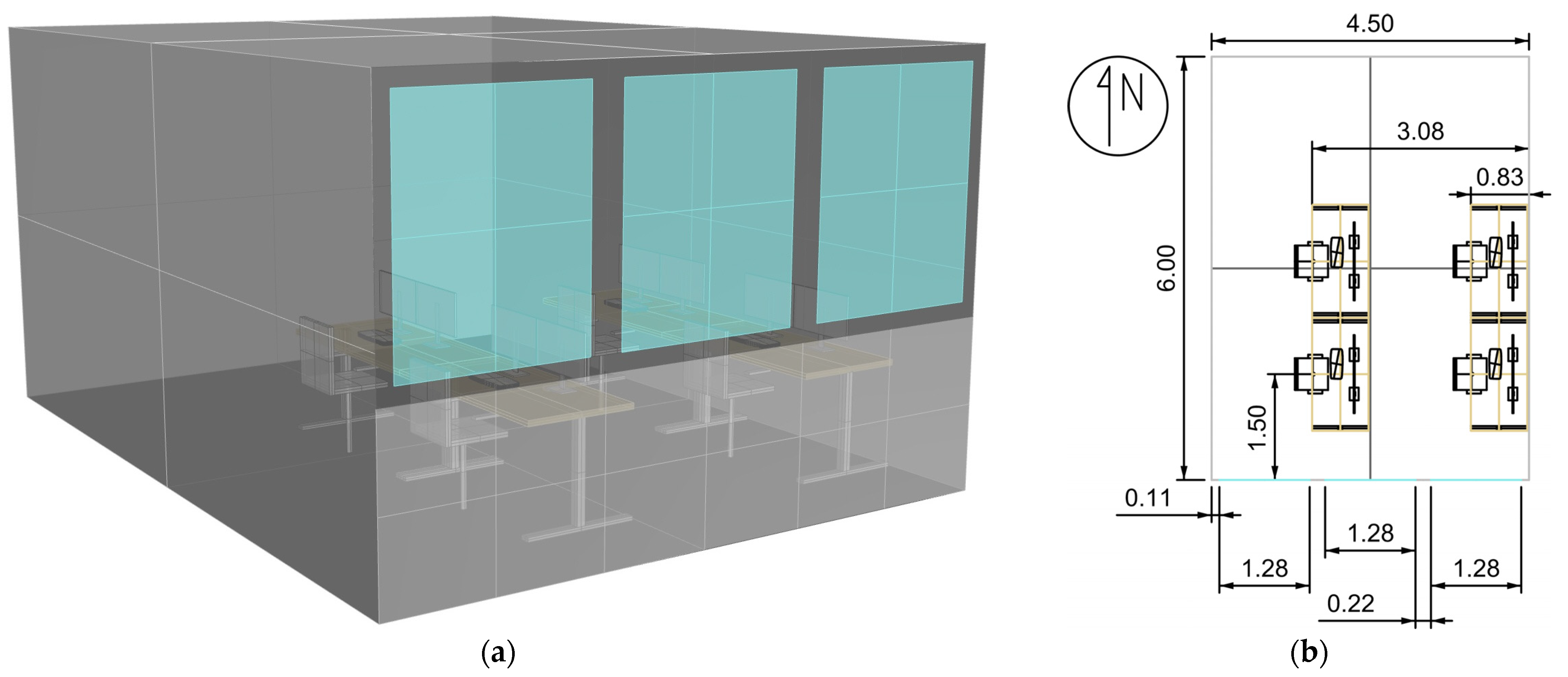 Three-dimensional model used for the annual daylight simulations: (a) perspective view, (b) floor plan.