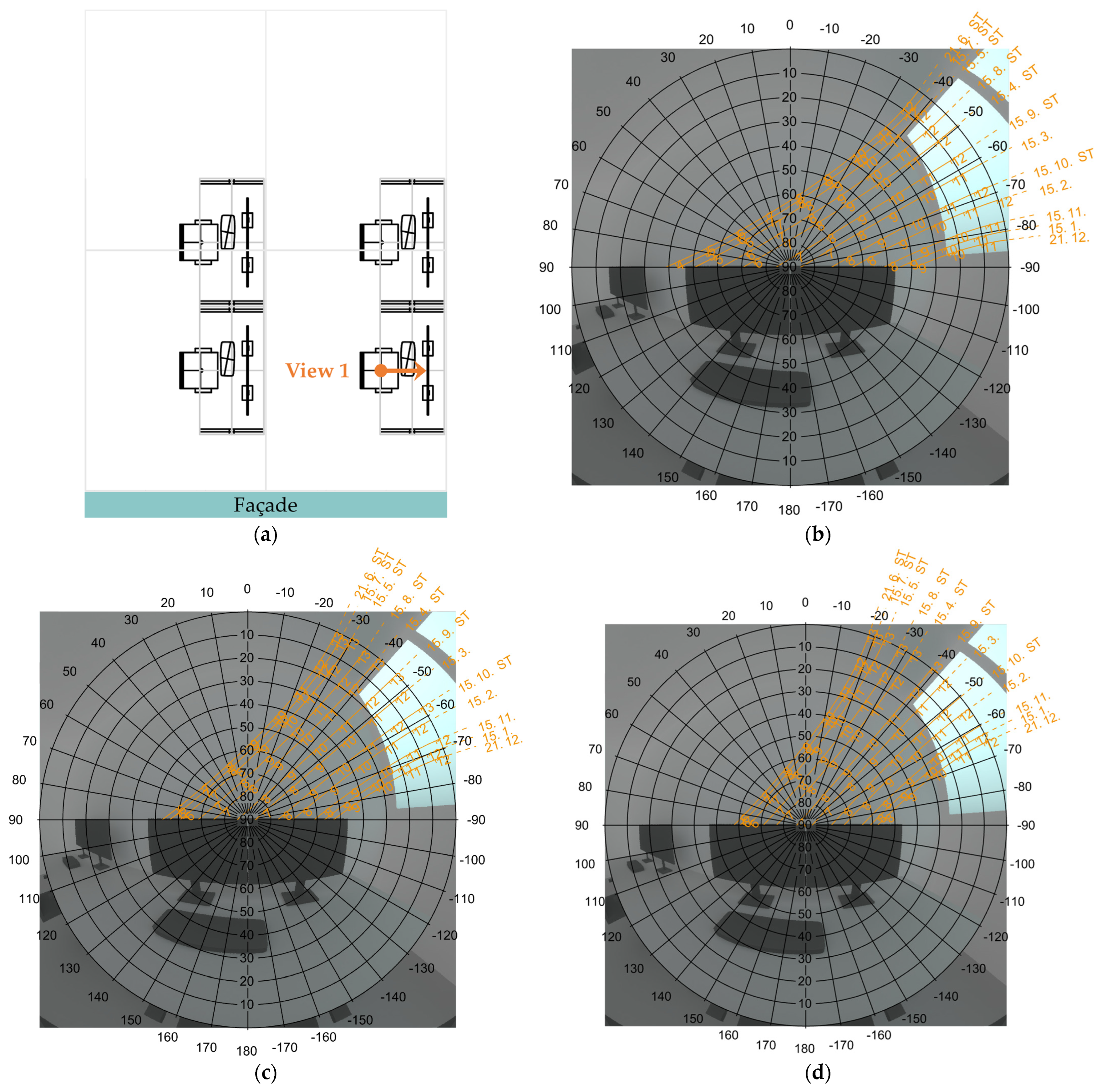 Location and view from viewpoint 1. This view represents a typical view at the workplace next to the wall with view direction parallel to the façade for a sitting person (view height = 1.20 m): (a) location of viewpoint 1 in the room floor plan; (b) view with solar paths for location Stockholm; (c) view with solar paths for location Stuttgart; (d) view with solar paths for location Rome.