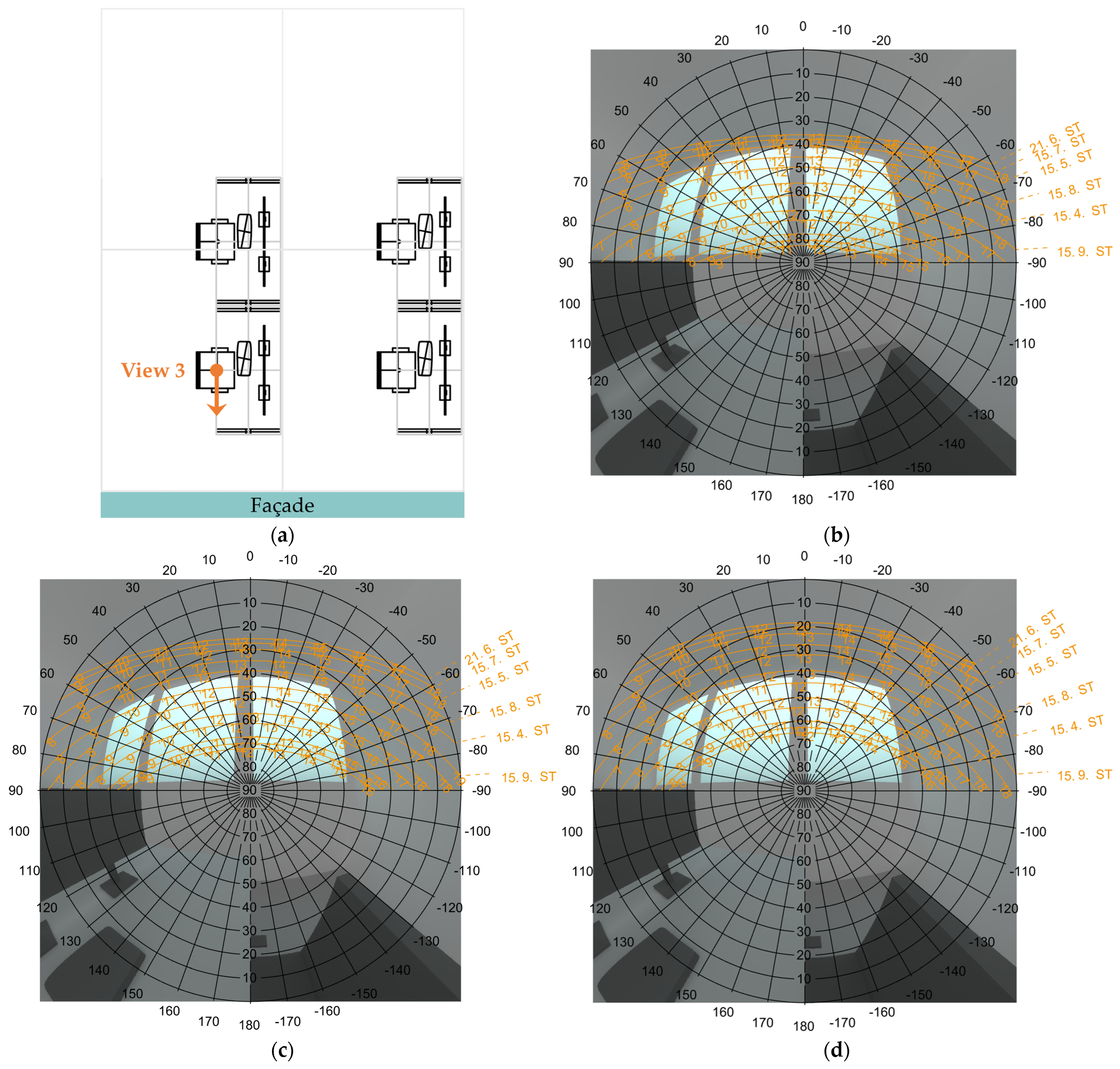 Location and view from viewpoint 3. This view represents a view from the workplace in the middle of the room with view direction perpendicular to the façade for a sitting person (view height = 1.20 m): (a) location of viewpoint 3 in the room floor plan; (b) view with solar paths for location Stockholm; (c) view with solar paths for location Stuttgart; (d) view with solar paths for location Rome.
