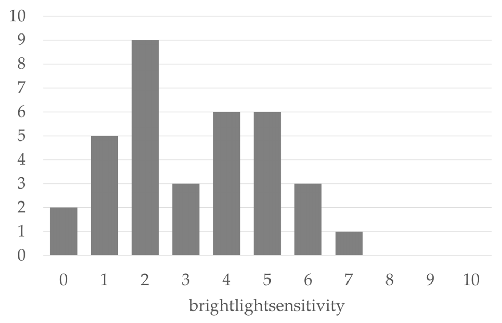 Distribution of self-reported sensitivity to bright light (11-point Likert Scale).