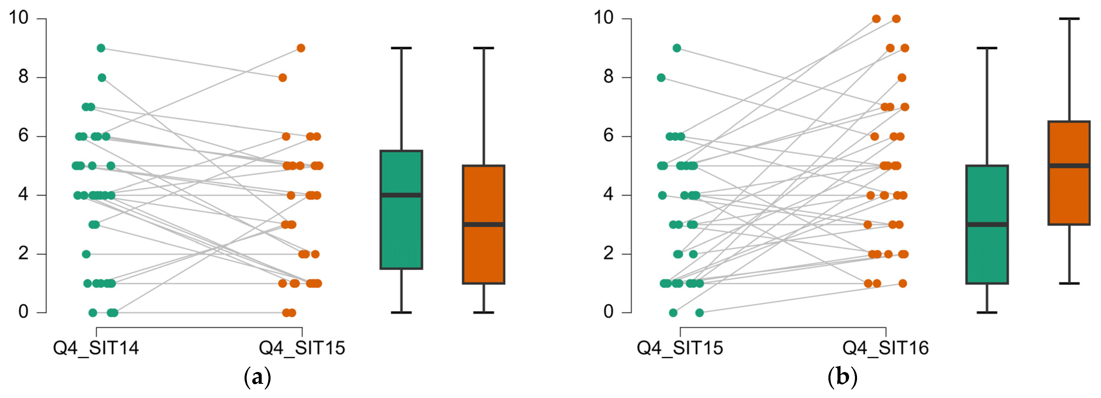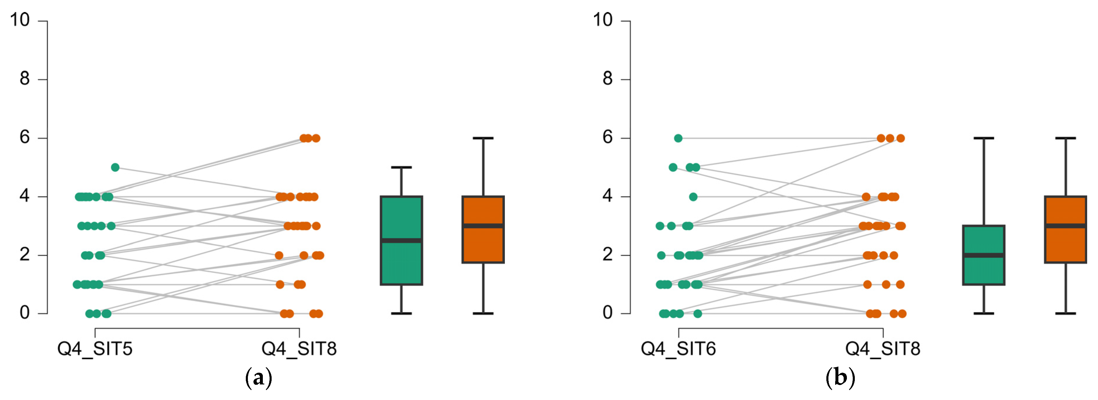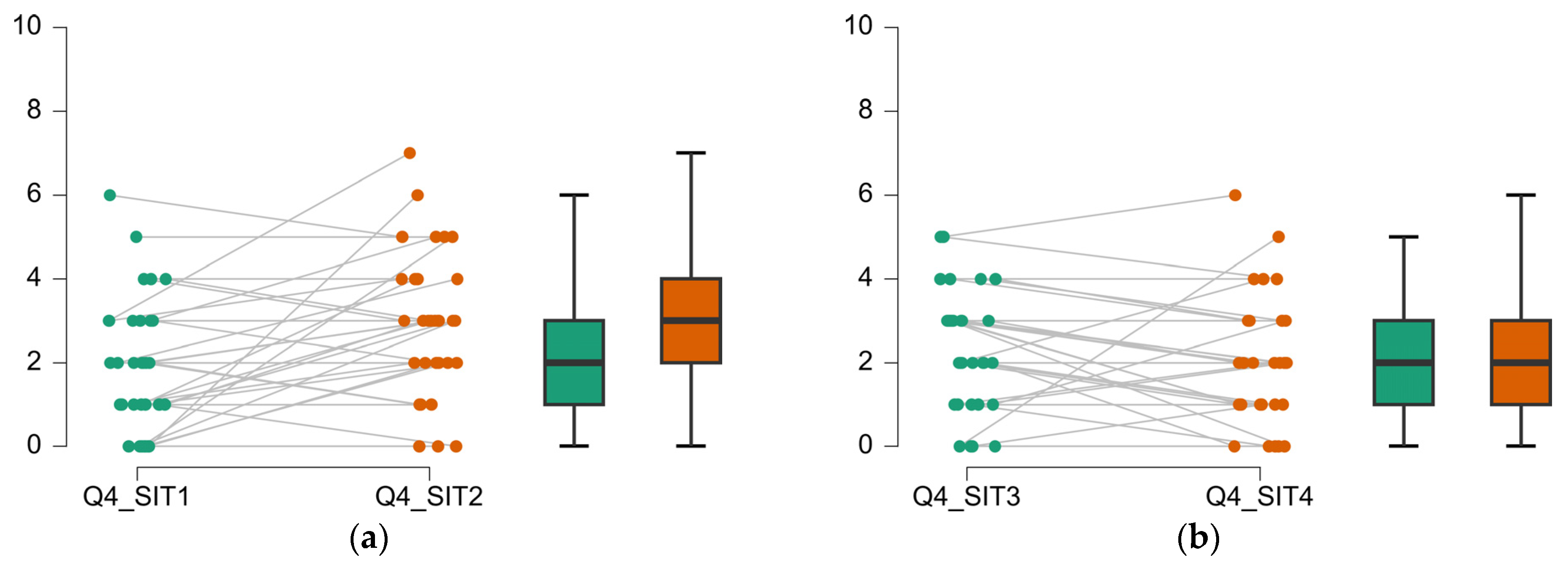 Situations where the subjects’ assessment contradicts the DGP evaluations: (a) SIT02 causing significantly higher glare than SIT01, while DGP predicts the opposite; (b) DGP predicts higher glare for SIT04 than for SIT03, while user assessments show no significant difference in perceived glare.