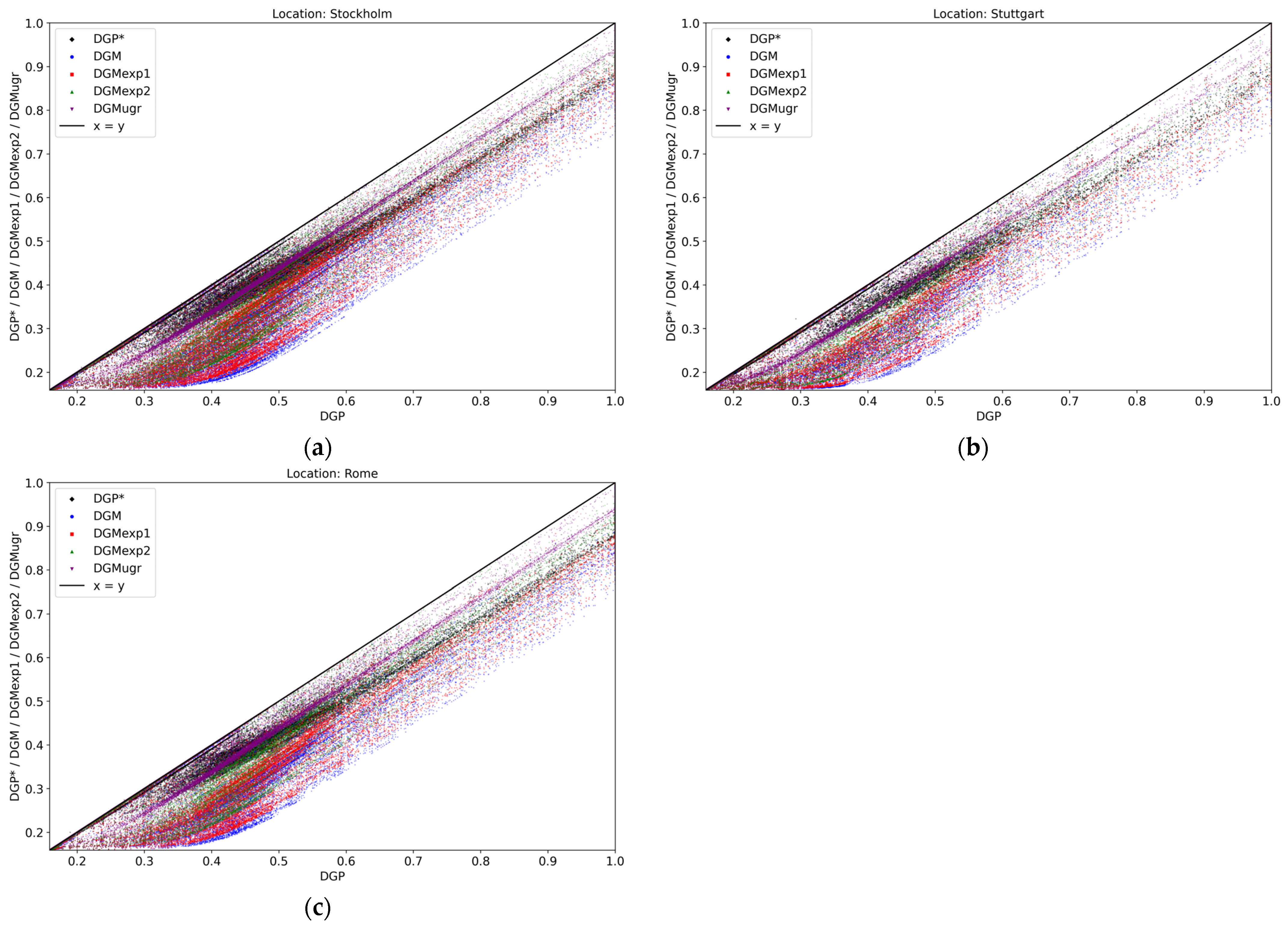 Results including all three viewpoints and all 17 window systems, subdivided by location: (a) Stockholm; (b) Stuttgart; (c) Rome.