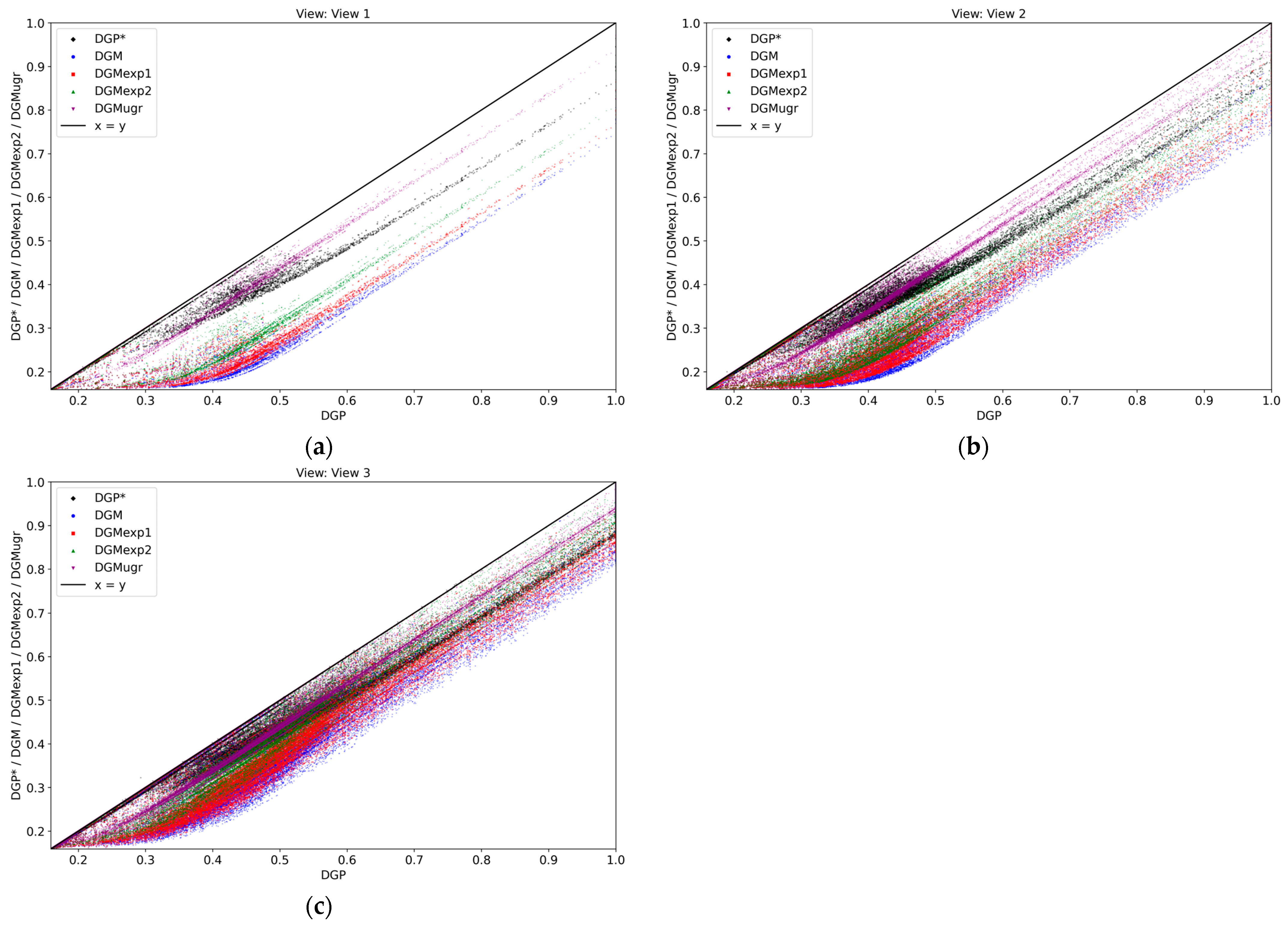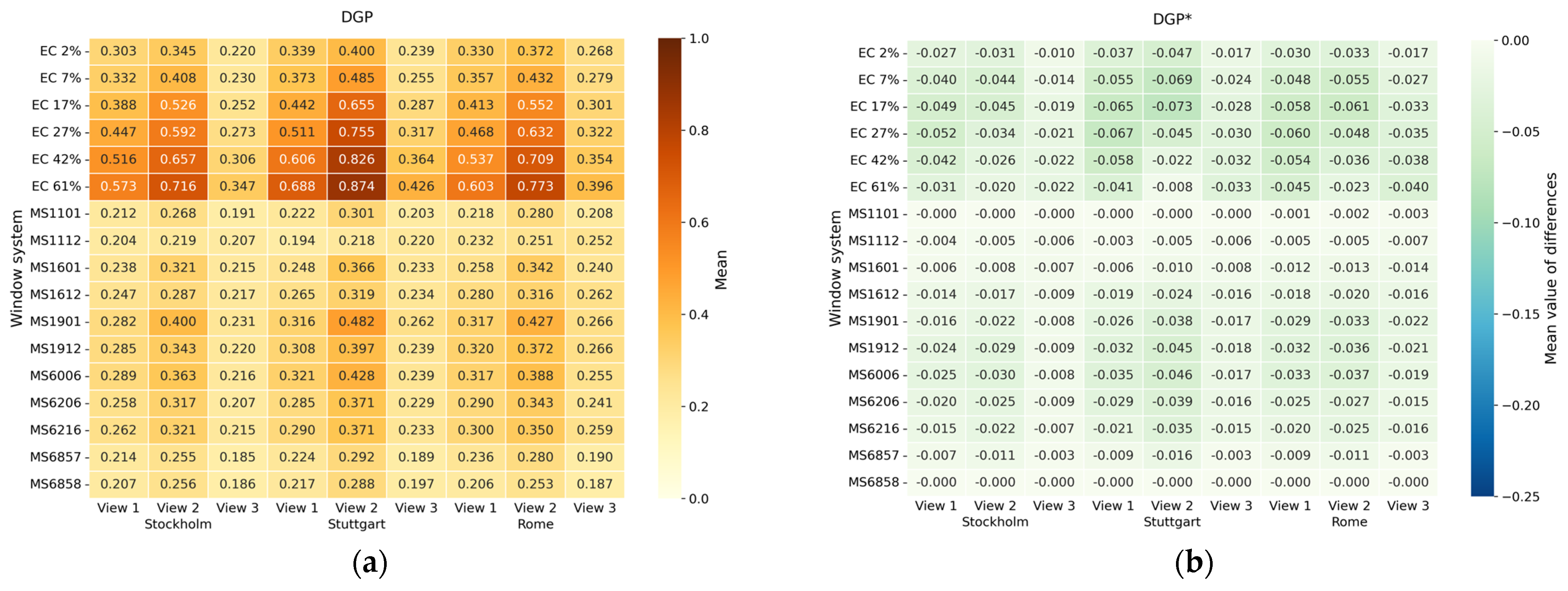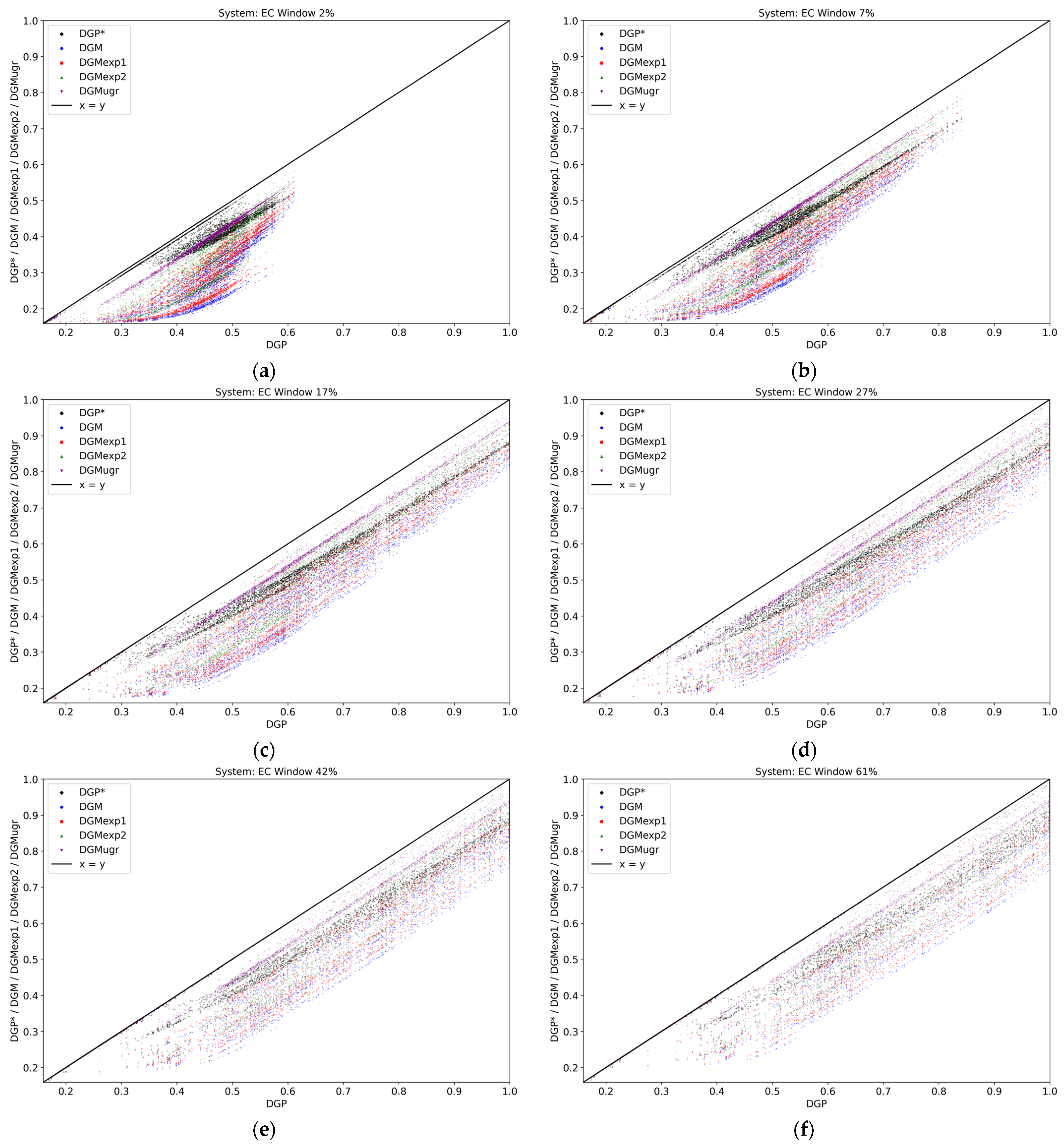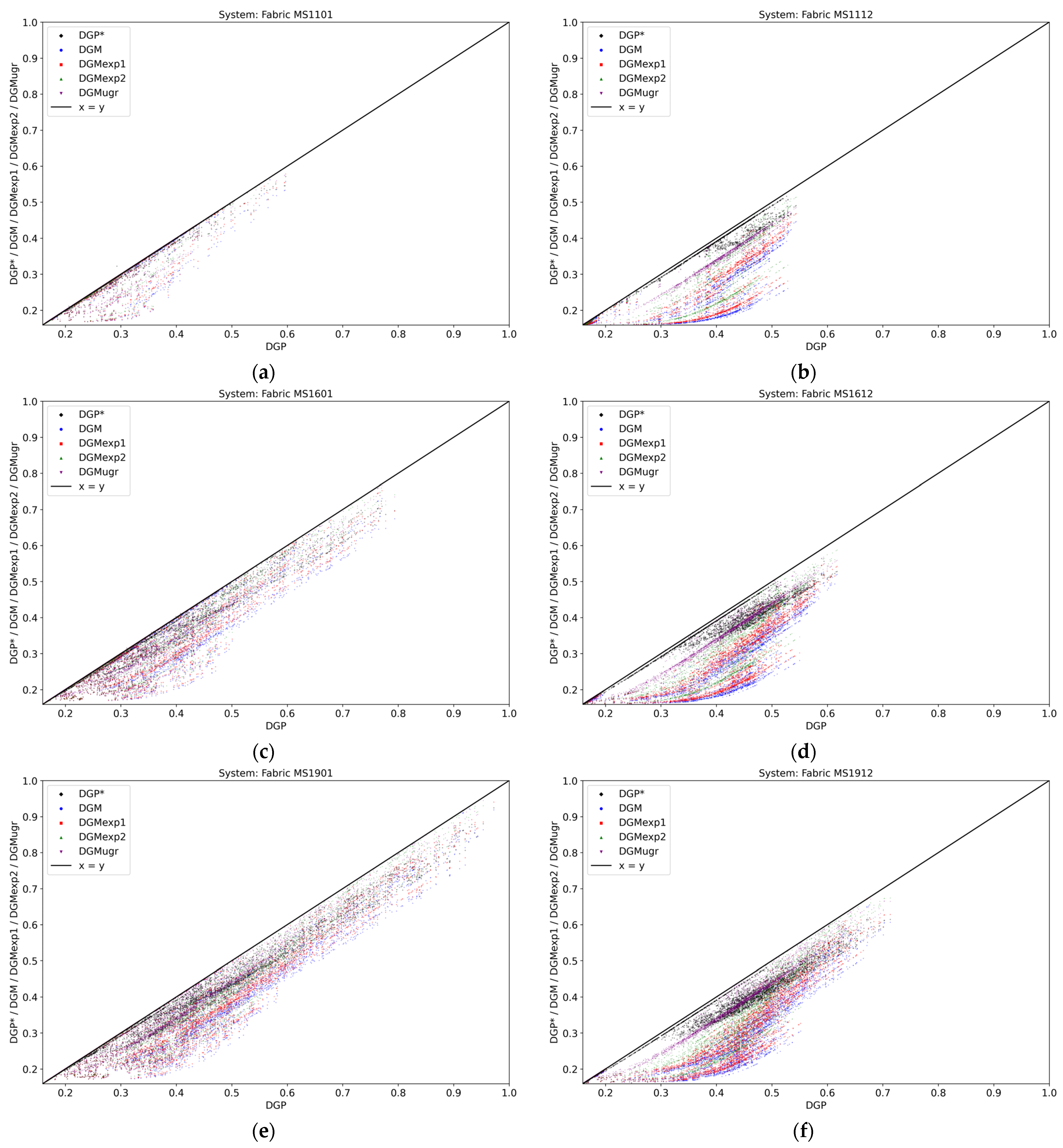 Mean DGP values and mean value of differences from DGP for modified metrics: (a) mean DGP for all system/location/view combinations; (b) mean difference for DGP* (with blur); (c) mean difference for DGM; (d) mean difference for DGMexp1; (e) mean difference for DGMexp2; (f) mean difference for DGMugr.