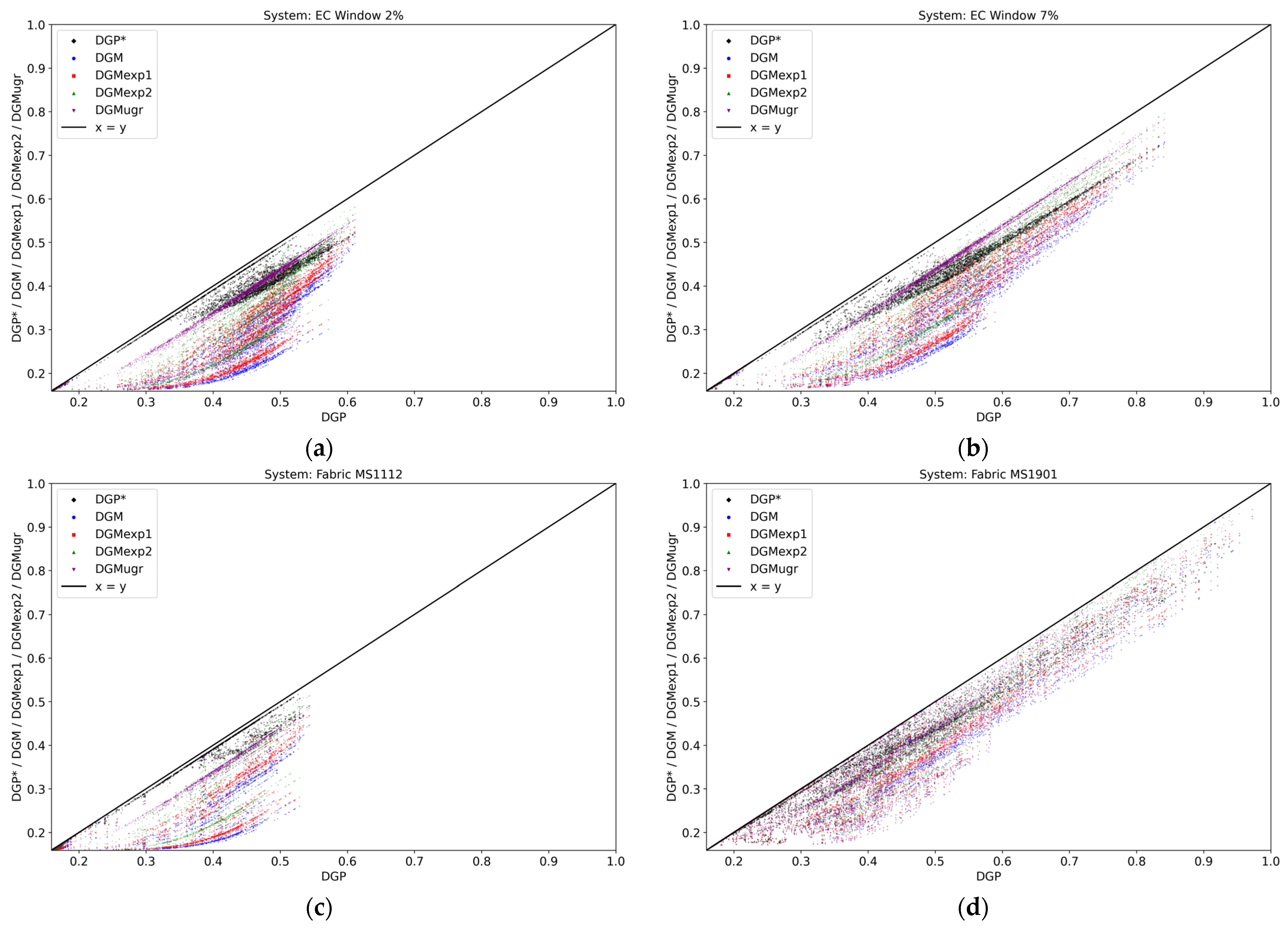 Selected results including all three locations and three viewpoints, subdivided by window system: (a) EC window, τn-n = 0.02; (b) EC window, τn-n = 0.27; (c) Fabric MS1112, OF 1%, τn-h = 0.010; (d) Fabric MS1901, OF 5%, τn-h = 0.052.