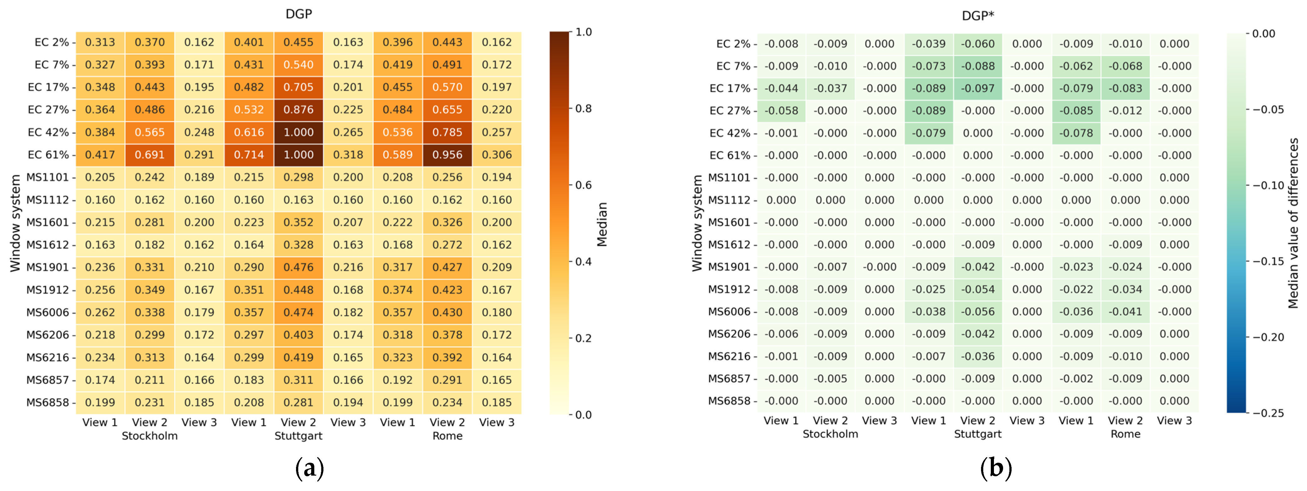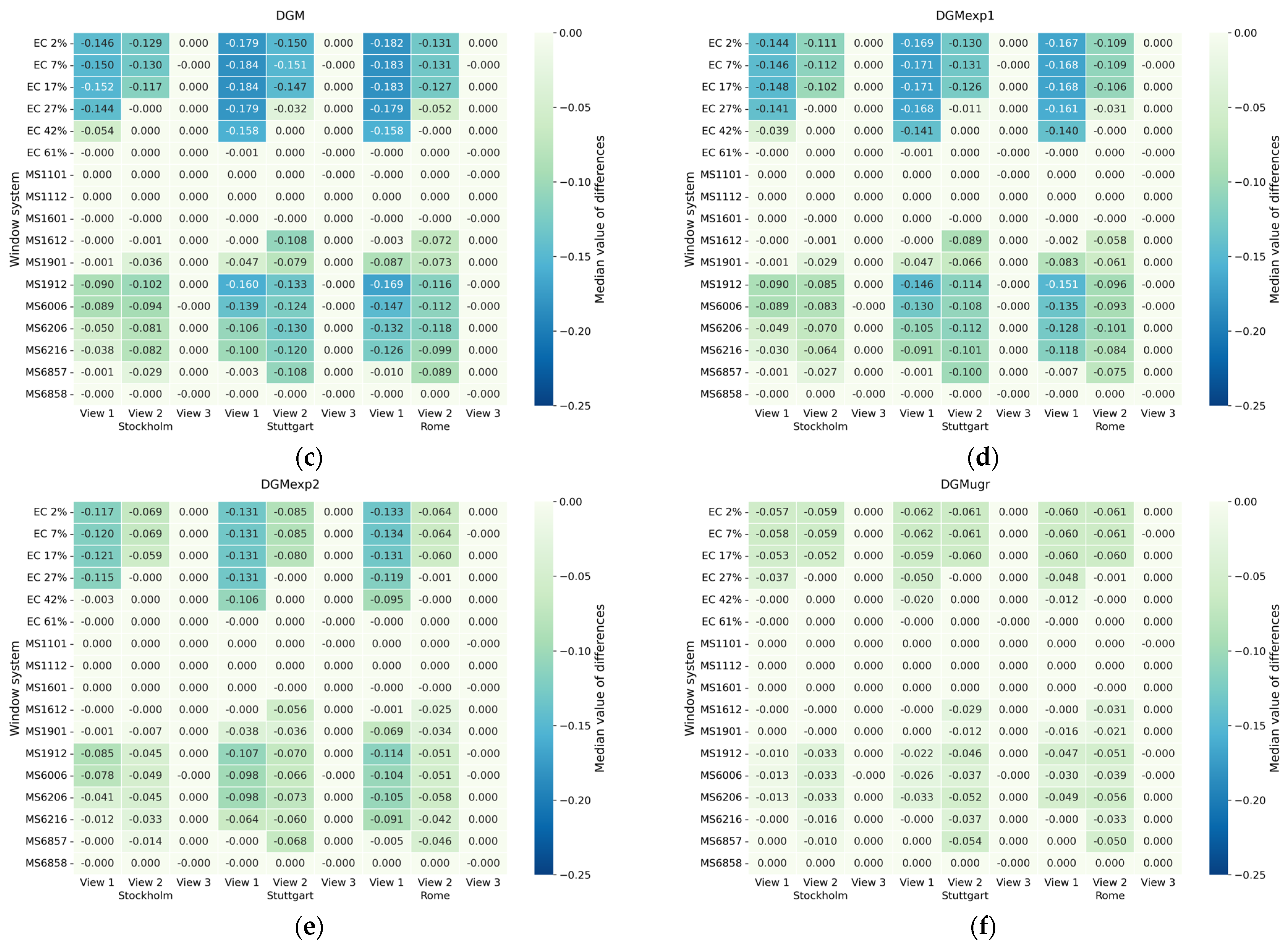 Median DGP values and median value of differences from DGP value for modified metrics: (a) median DGP for all system/location/view combinations; (b) median difference for DGP* (with blur); (c) median difference for DGM; (d) median difference for DGMexp1; (e) median difference for DGMexp2; (f) median difference for DGMugr.