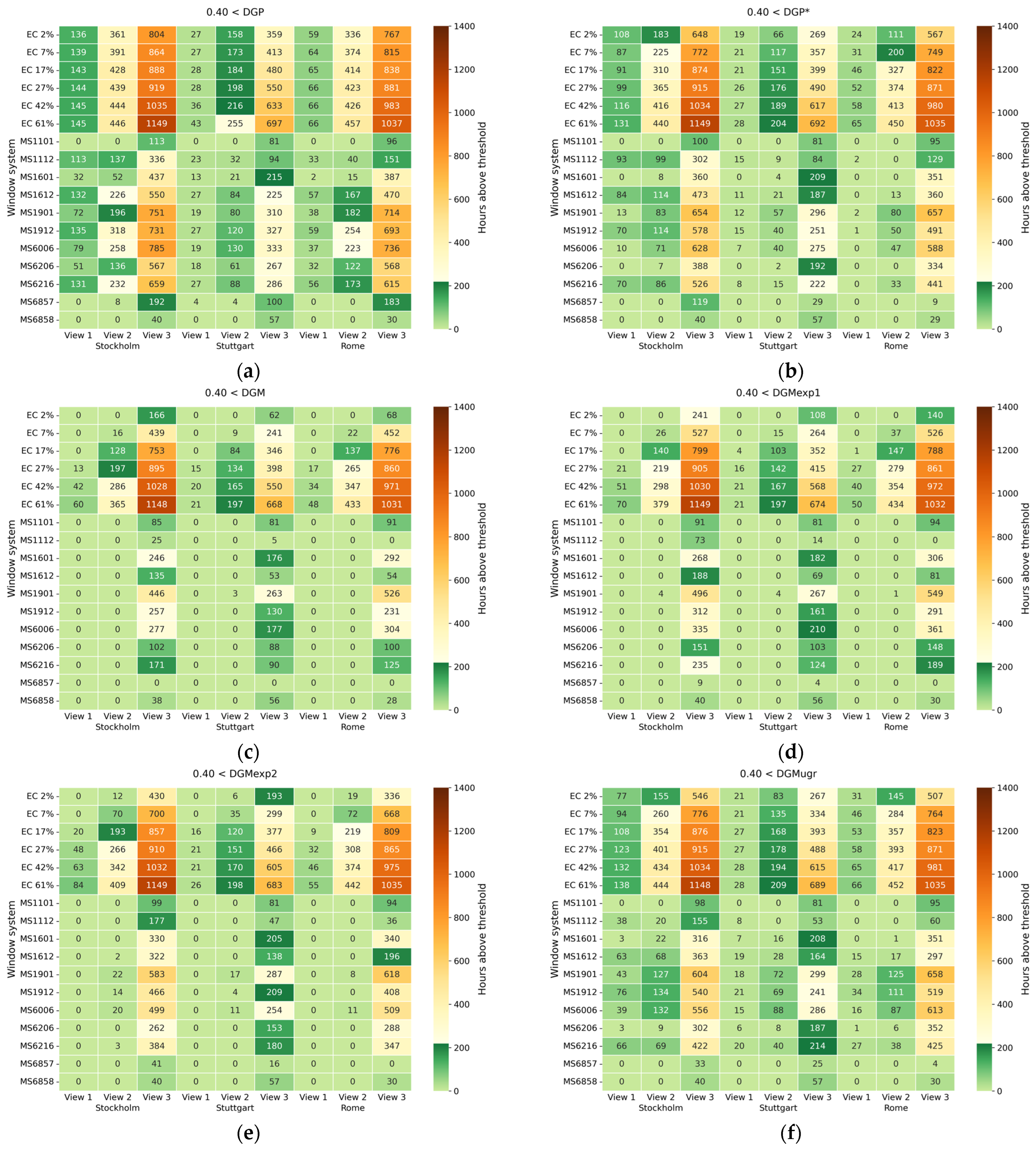 Number of hours where the respective metric exceeds the threshold of 0.40: (a) DGP; (b) DGP* (with blur); (c) DGM; (d) DGMexp1; (e) DGMexp2; (f) DGMugr.