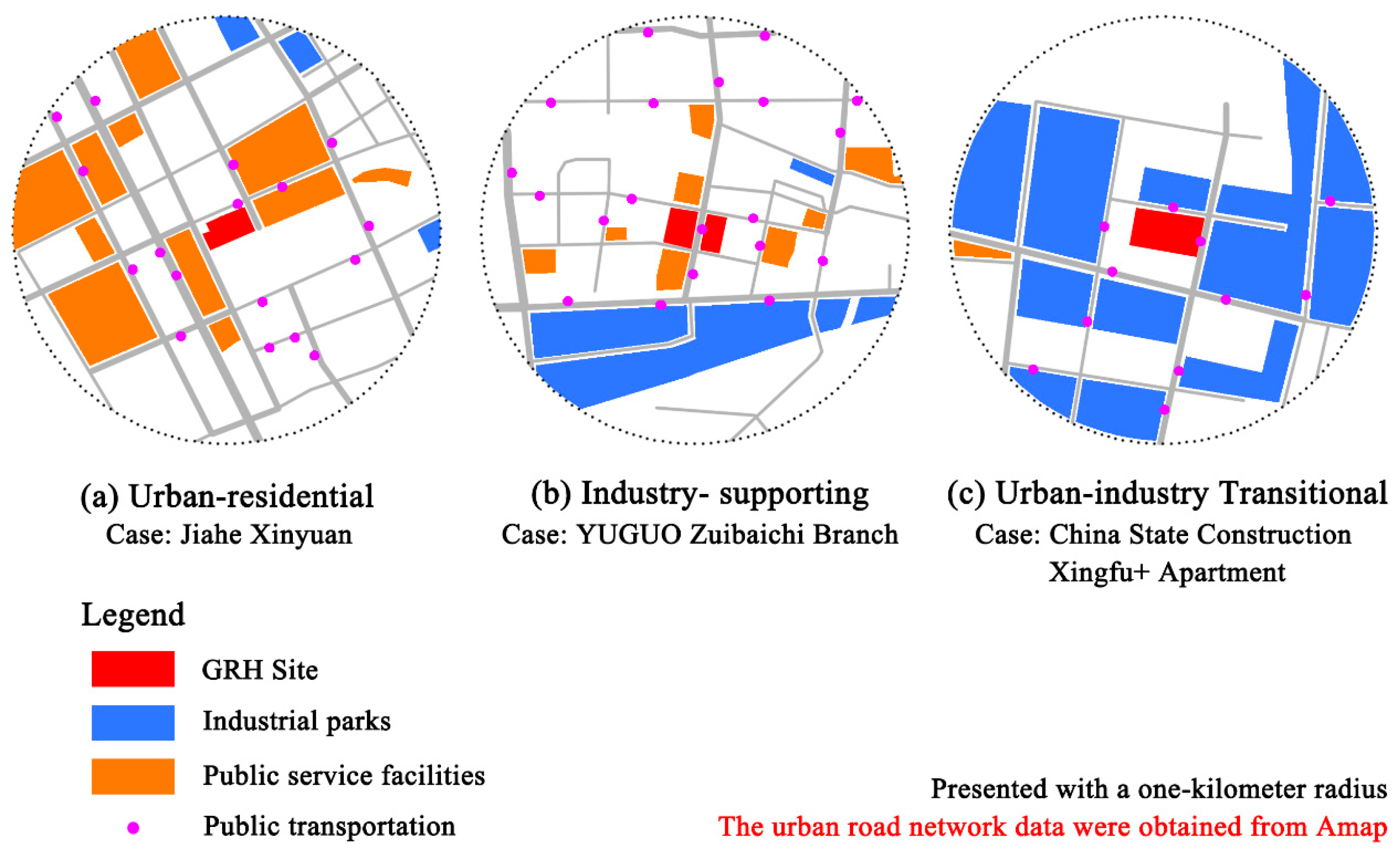 | Urban-industry Transitional | Non-adjacent to industrial parks Mostly distributed on one side of GRH | Moderate diversity Moderate convenience | Moderate bus routes Moderate accessibility |