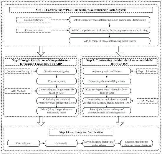 The research methodology consists of four steps, as illustrated in Figure 1. In step 1, a WPEC competitiveness influencing factor system is established through a literature review and expert interviews, resulting in a framework comprising five criterion layers and twenty-eight influencing factors. Step 2 involves applying the Analytic Hierarchy Process (AHP) to construct judgment matrices, which facilitates the calculation of relative weights and the execution of consistency tests to quantify the weight of each factor in competitiveness and identify key factors influencing competitiveness. Subsequently, step 3 utilizes Interpretive Structural Modeling (ISM) to analyze the logical relationships among factors by constructing adjacency and reachability matrices, which decompose complex interactions into a Multi-level Hierarchical Structural Model to reveal the impact pathways of competitiveness influencing factors. Finally, step 4 integrates the results from AHP and ISM through Influencing factor analysis and Impact Pathway Analysis, combined with case selection and a case study, to identify the core drivers of whole-process engineering consulting competitiveness and formulate targeted enhancement strategies.