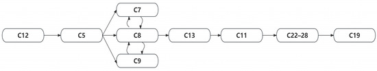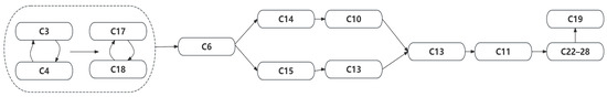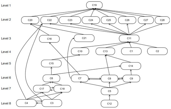 Hierarchical Topology Diagram. Note: Arrows represent directional influence relationships between factors (C1–C28) across levels: the starting end of an arrow corresponds to the influencing factor, while the terminal end refers to the factor being affected.