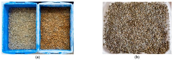 Weigh different proportions of sodium borate (0.5%, 1.0%, 1.5%, 2.0%), sodium hexametaphosphate (0.5%, 1.0%, 1.5%, 2.0%), and polycarboxylic acid (0.5%, 1.0%, 1.5%, 2.0%), dissolve them in water, and stir for 10 min until completely dissolved. Then add sodium silicate at the specified concentrations (3%, 6%, 9%, 12%, 15%) and continue to stir for 20 min until fully dissolved. The soaking and air-drying procedures are illustrated in Figure 2. As shown in Figure 2, pour the resulting slurry into a container with flawed excavated-mass aggregates, with the liquid surface 20 mm higher than the aggregates. After soaking for 14 days, remove the aggregates, spread them out, and air-dry for 14 days. Then rinse the surface of soluble crystals and air-dry them for use in testing the crushing index and water absorption rate. For the SEM test, select flawed excavated-mass aggregates (BA, i.e., baseline flawed excavated-mass aggregates) and reinforced aggregates (BA15) treated with 15% reinforcing slurry, and prepare them into specimens smaller than 10 mm × 10 mm × 10 mm. Dry them at 60 °C for 2 days and then spray gold for testing. For the MIP test, use flawed excavated-mass aggregates (NA, i.e., natural aggregate) and reinforced aggregates (BA3, BA9, BA15) treated with 3%, 9%, and 15% reinforcing slurry. The sample treatment method is the same as that for SEM, but no gold spraying is required.