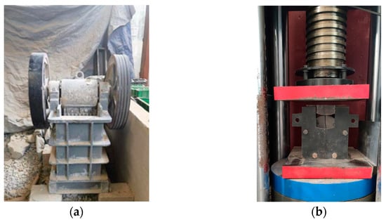 Microstructural characterization was conducted using several techniques. Scanning Electron Microscopy (SEM) analysis was performed using an FEI Quanta FEG250 microscope at an accelerating voltage of 8 kV and magnifications of 1000×, 5000×, and 10,000×. Mercury Intrusion Porosimetry (MIP) measurements were performed using a McMurtry AutoPore V 9600 instrument, capable of measuring pore sizes from 3 nm to 500 μm. Back-Scattered Electron (BSE) imaging was implemented on a TESCAN MIRA4 microscope operating at 15 keV, with a working distance of 15.52 mm and a magnification of 500×. For BSE analysis, ten images were captured per sample with a pixel size of 0.545 μm. Impact crusher and compression testing equipment are shown in Figure 3.
