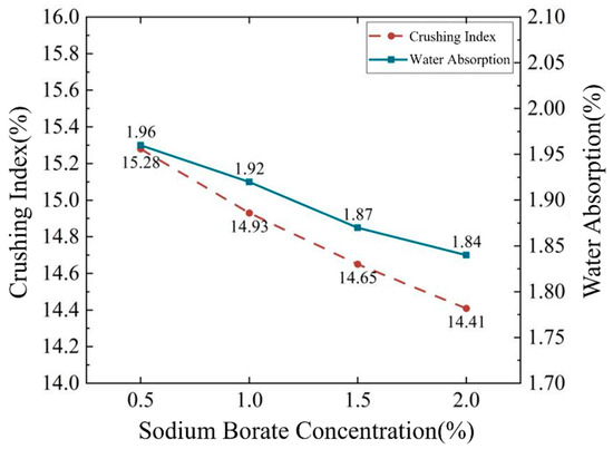Effect of sodium borate concentration on crushing index and water absorption of defective aggregates.