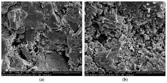 Figure 8 shows the scanning electron microscope (SEM) image of the flawed excavated-mass aggregates after repair. As shown in Figure 8, the surface of the flawed excavated-mass aggregates is generally uneven, with numerous micropores and fissures. Some diagenetic crystals of the flawed excavated-mass aggregates are short, randomly arranged, and have a loose structure, surrounded by a large number of pores and cracks. The surface smoothness of the reinforced aggregate is significantly improved, with no obvious pores or fissures. Obvious columnar and rod-shaped silicon oxide crystals are densely arranged on the surface, with a dense accumulation of silicon oxide crystals near the pores. It can be seen that the silicon oxide crystals effectively fill the pores and voids of the flawed excavated-mass aggregates, optimize the pore structure of the aggregate, and improve the physical and mechanical properties of the flawed excavated-mass aggregates.