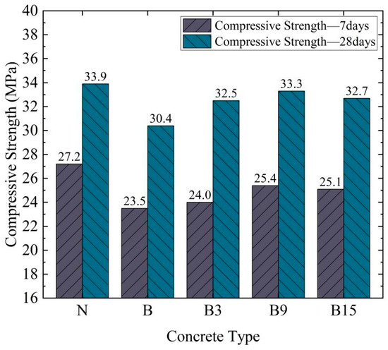 As shown in Figure 12, natural aggregate concrete exhibits a compressive strength of 27.2 MPa at 7 days and 33.9 MPa at 28 days. Flawed excavated-mass aggregate concrete shows compressive strengths of 23.5 MPa at 7 days and 30.4 MPa at 28 days, which are 3.7 MPa and 3.5 MPa lower than those of natural aggregate concrete at 7 and 28 days, respectively. The 28-day compressive strength of B9 (33.3 MPa) is comparable to that of natural aggregate concrete (33.9 MPa). The 7-day compressive strengths of B3, B9, and B15 are 24.0 MPa, 25.4 MPa, and 25.1 MPa, representing increases of 0.5 MPa, 1.9 MPa, and 1.6 MPa compared to the 7-day compressive strength of flawed excavated-mass aggregate concrete. The 28-day compressive strengths of B3, B9, and B15 are 32.5 MPa, 33.3 MPa, and 32.7 MPa, showing increases of 2.1 MPa, 2.9 MPa, and 2.3 MPa compared to the 28-day compressive strength of flawed excavated-mass aggregate concrete.