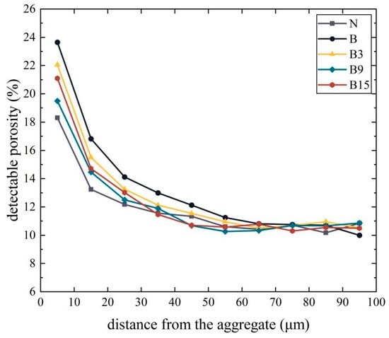 Figure 13 illustrates the variation in porosity of the interfacial transition zone (ITZ) of various concretes with increasing distance from the aggregate surface. As can be seen, the porosity of the ITZ is higher closer to the aggregate surface. This is mainly because a water film forms around the aggregate during hydration, resulting in a higher water-cement ratio in the mortar closer to the aggregate surface, and a higher content of large crystalline hydrates. Furthermore, due to the incompatibility between the aggregate and the mortar, the porosity of the mortar closer to the aggregate surface is higher. Within the ITZ range, the ITZ porosity of natural aggregate concrete is the lowest. The ITZ porosity decreases sequentially from B, B3, to B9, indicating that immersion in a strengthening slurry can reduce the ITZ porosity. The higher the concentration of the strengthening slurry, the more significant the reduction in ITZ porosity. This is because the unreacted silicate on the strengthened aggregate surface directly undergoes a secondary crystallization reaction with calcium hydroxide produced by cement hydration in the ITZ, generating calcium silicate hydrate (C-S-H) gel, which promotes cement hydration and effectively reduces the ITZ porosity, improving the microstructure of the ITZ. However, the ITZ porosity of B15 is slightly higher than that of B9. This may be because after the silicate attached to the strengthened aggregate surface has fully reacted with the Ca(OH)2 produced by cement hydration, some crystal residue remains. These silicate crystals are formed by the dehydration and hardening of sodium silicate. The hardening of sodium silicate is a slow process; the sodium silicate on the surface first dehydrates and hardens to form crystals, while the interior of the sodium silicate still contains a large amount of uncured sodium silicate, which contains moisture. After this portion of water slowly evaporates, it leaves a large number of pore structures inside the silicate crystals, resulting in a slight increase in the ITZ porosity of B15.