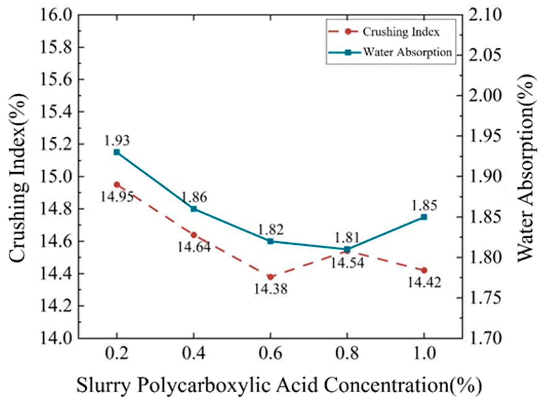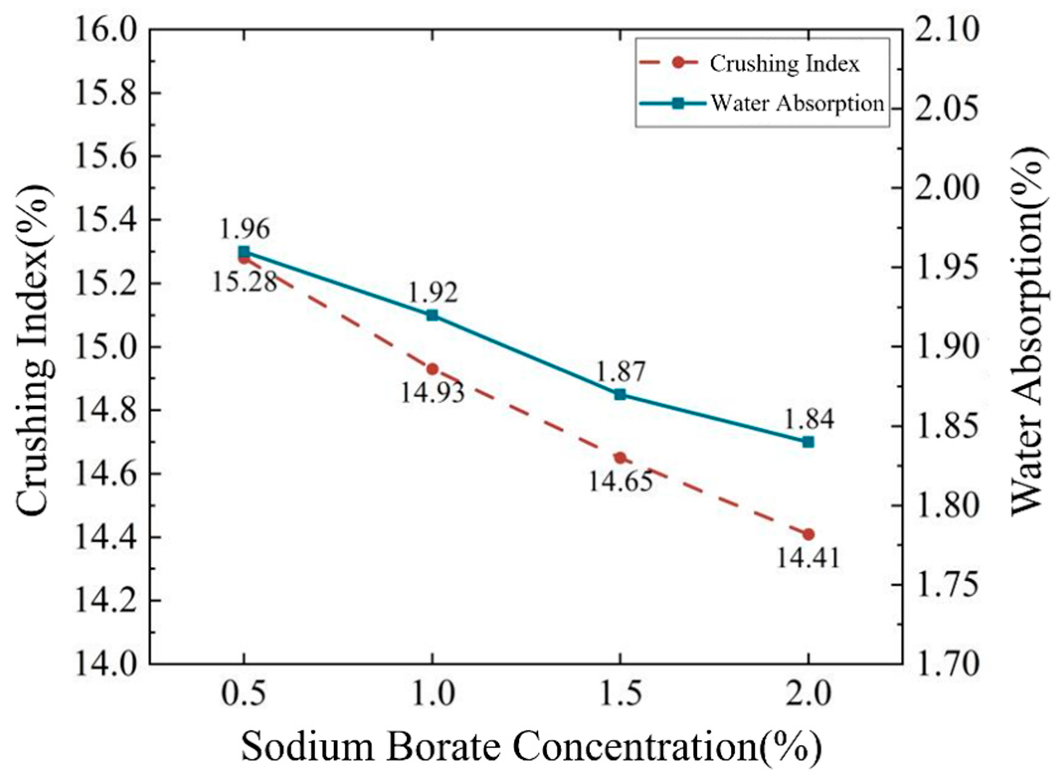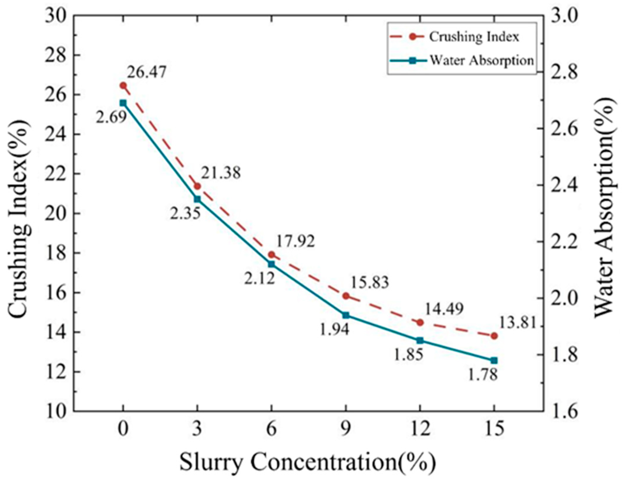 - The crushing value and water absorption of flawed excavated-mass aggregates decrease continuously with increasing concentration of the strengthening slurry. Higher concentrations of strengthening slurry lead to a greater amount of sodium silicate entering the aggregate’s interior, resulting in more silica crystals forming during air-drying through dehydration, and a more pronounced filling effect on the pore structure of the defective aggregates.