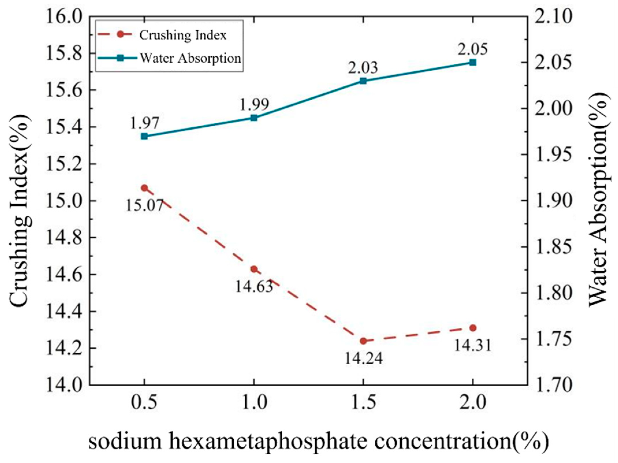 - Sodium borate, sodium hexametaphosphate, and polycarboxylic acid substances are used to modify sodium silicate, producing a strengthened slurry primarily composed of sodium silicate. The reinforcement effect on flawed excavated-mass aggregates is optimized by expanding the penetration pathways and increasing the strength of the crystals. Sodium borate forms a composite network structure with silicon-oxygen tetrahedra, while sodium hexametaphosphate interlocks with silicon–oxygen tetrahedra to enhance the strength of silicon dioxide crystals. Polycarboxylic acid substances improve the stability of the sodium silicate system, reduce its size, and increase its wettability on defective aggregates.