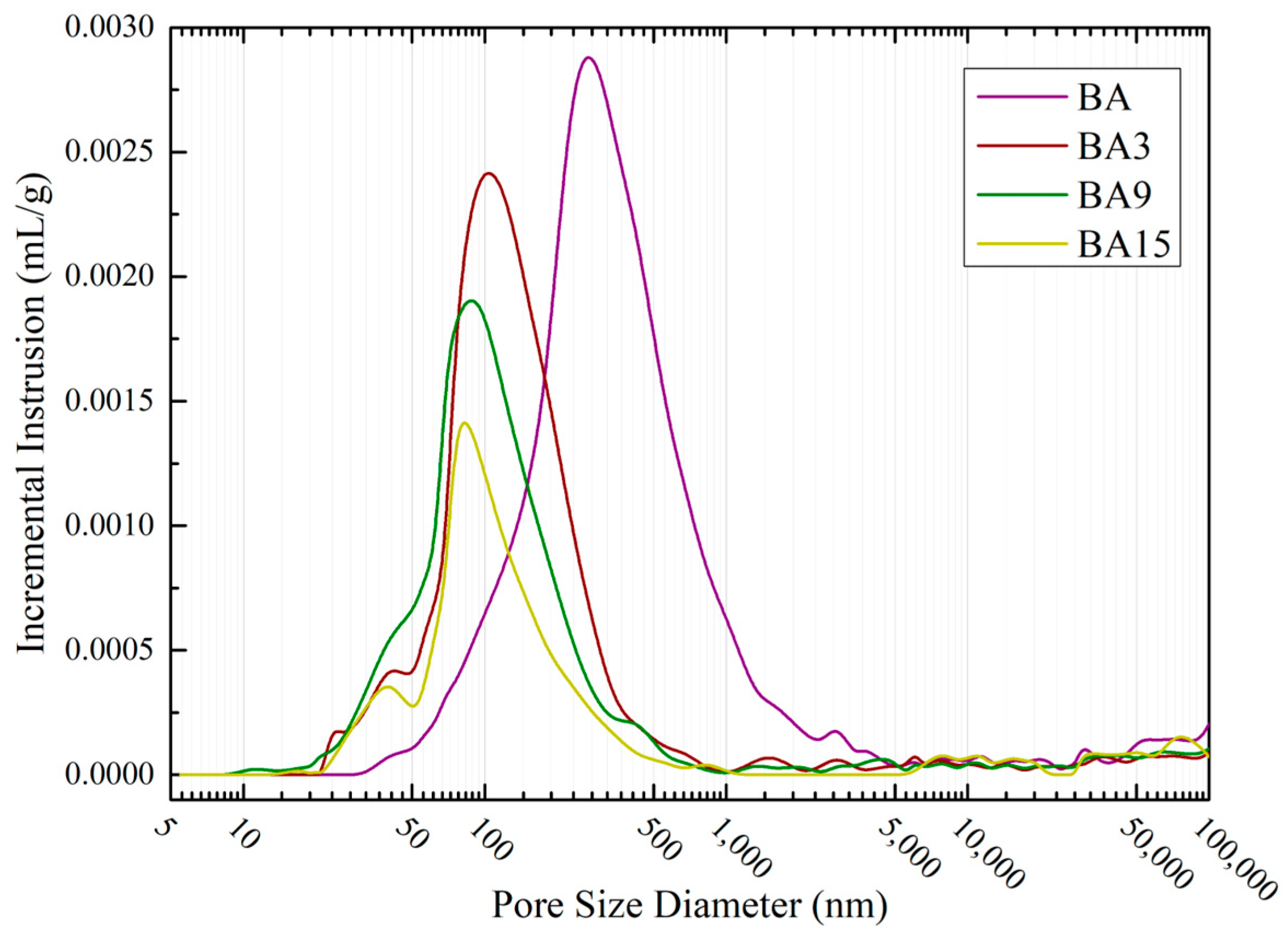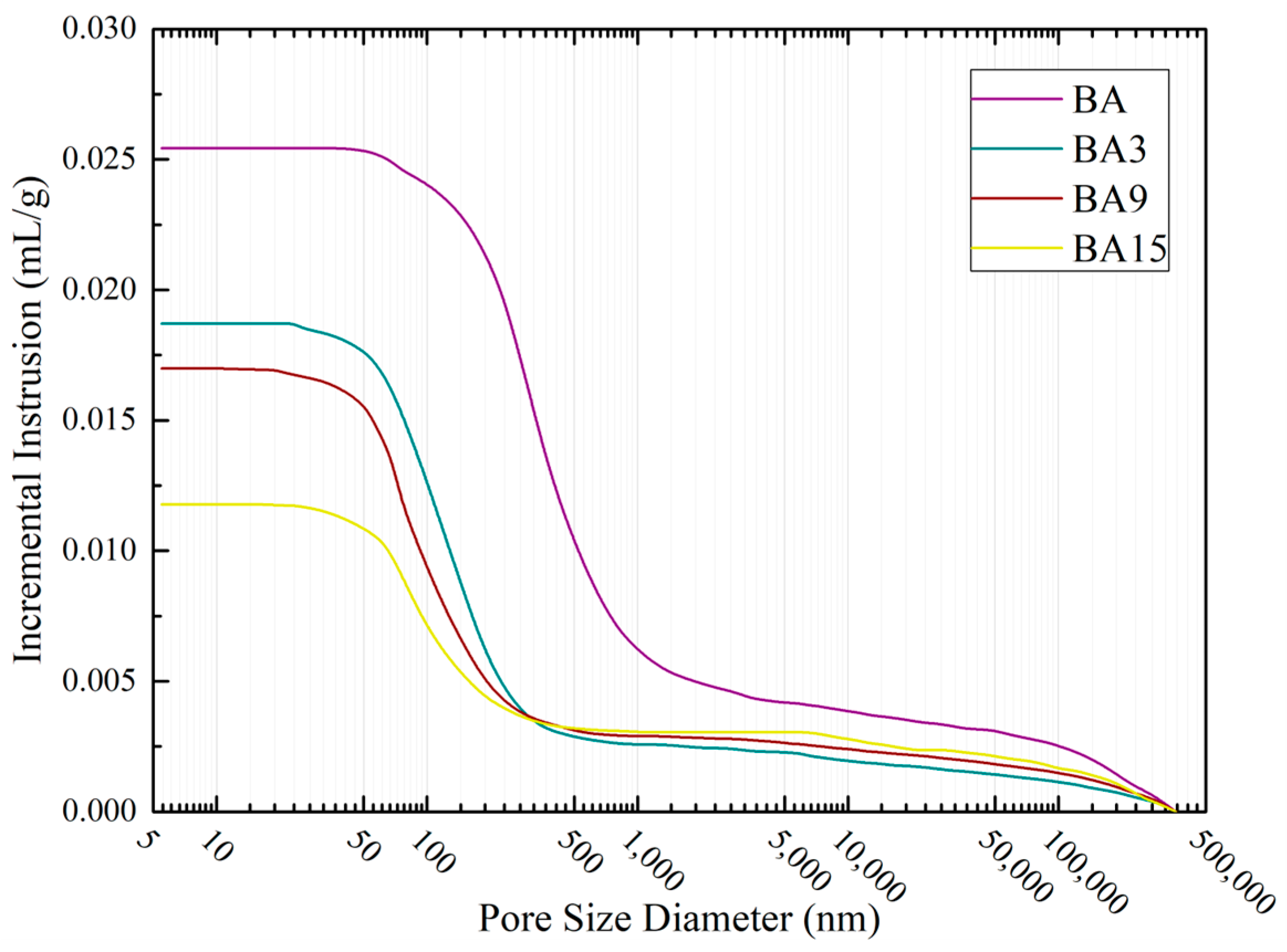 - Crystalline silica formed by dehydration and hardening within the flawed excavated-mass aggregates after impregnation with the strengthening slurry densifies the pore structure, reducing its total porosity. Higher concentrations of the strengthening slurry result in lower total porosity. Simultaneously, the pore structure of the flawed excavated-mass aggregates is refined, the pore size distribution curve is optimized, and the average pore size and the most probable pore size are reduced.