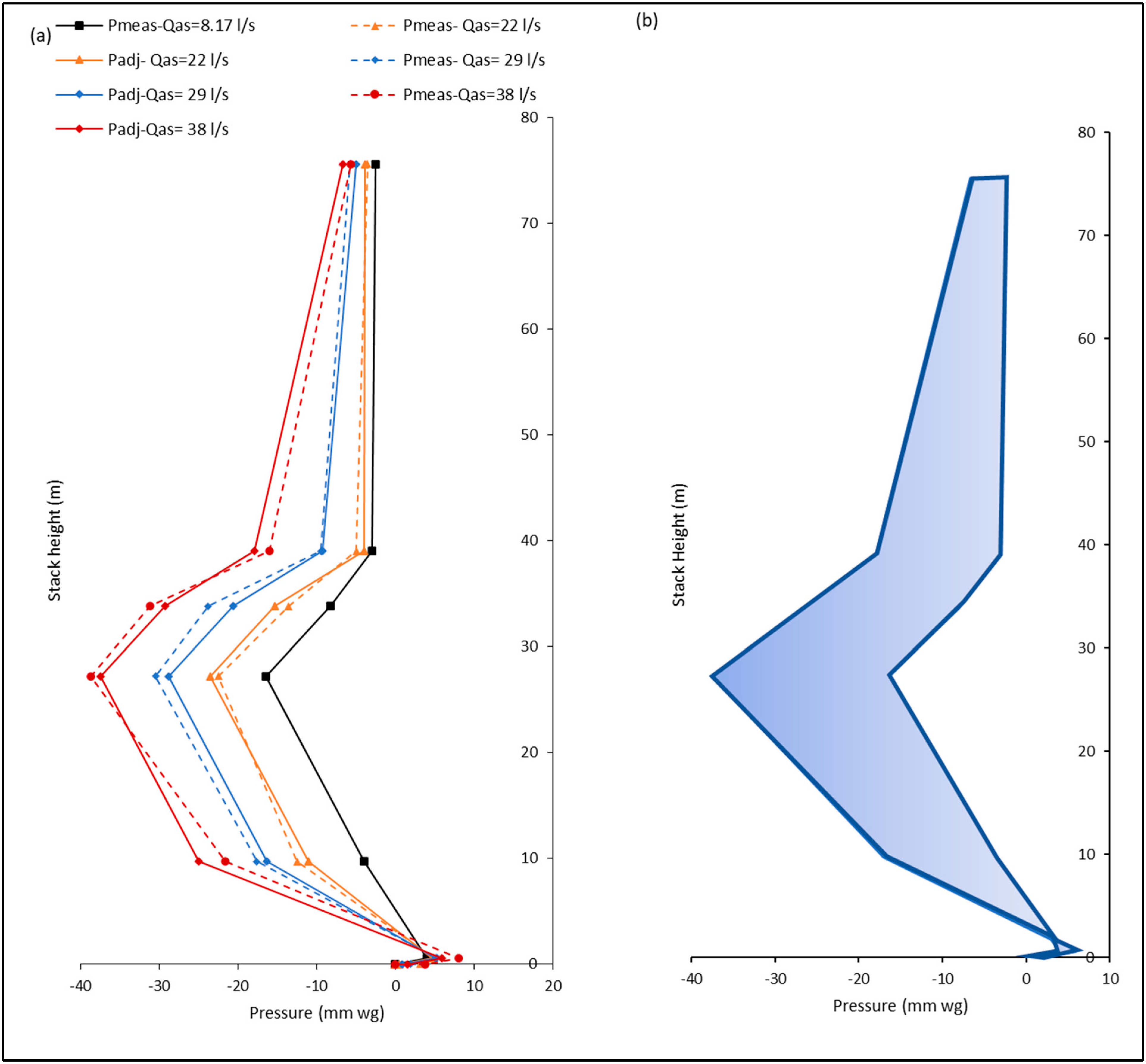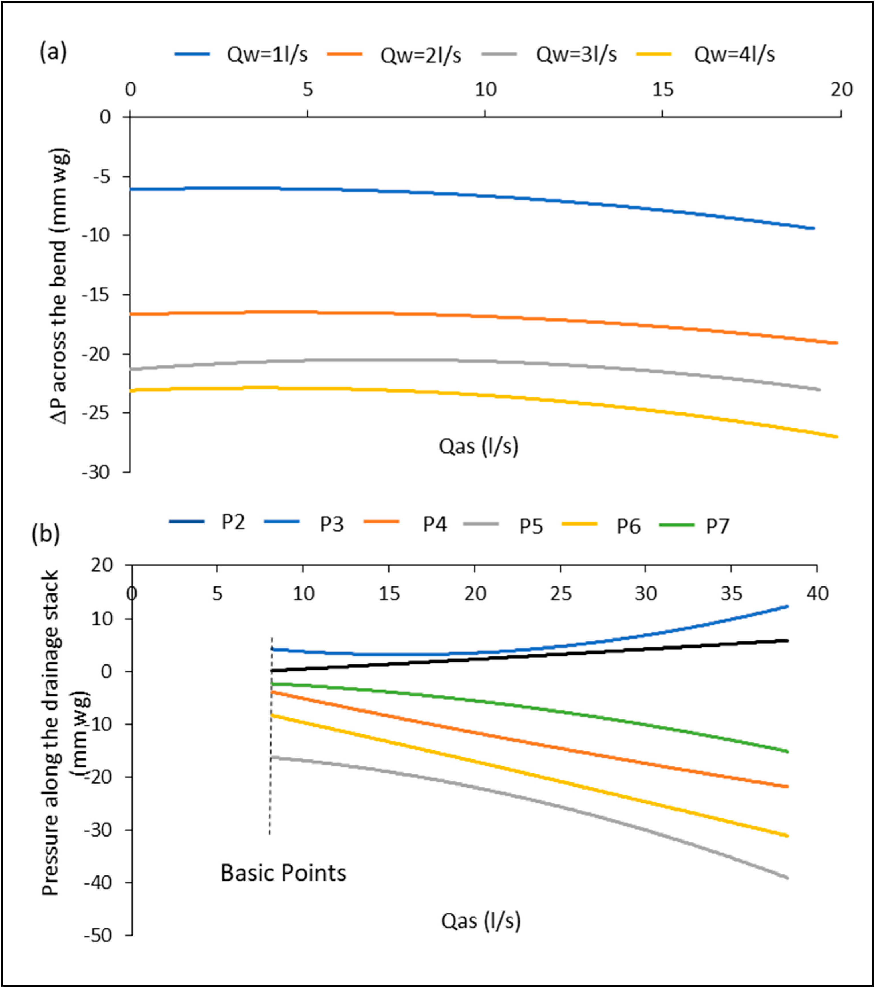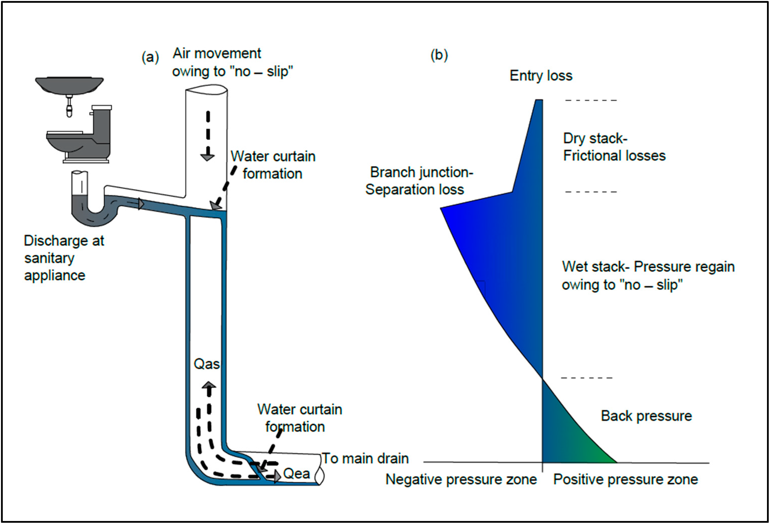 - How a single water flow event results in a range of pressure changes along the drainage stack under varying updraft airflow conditions.