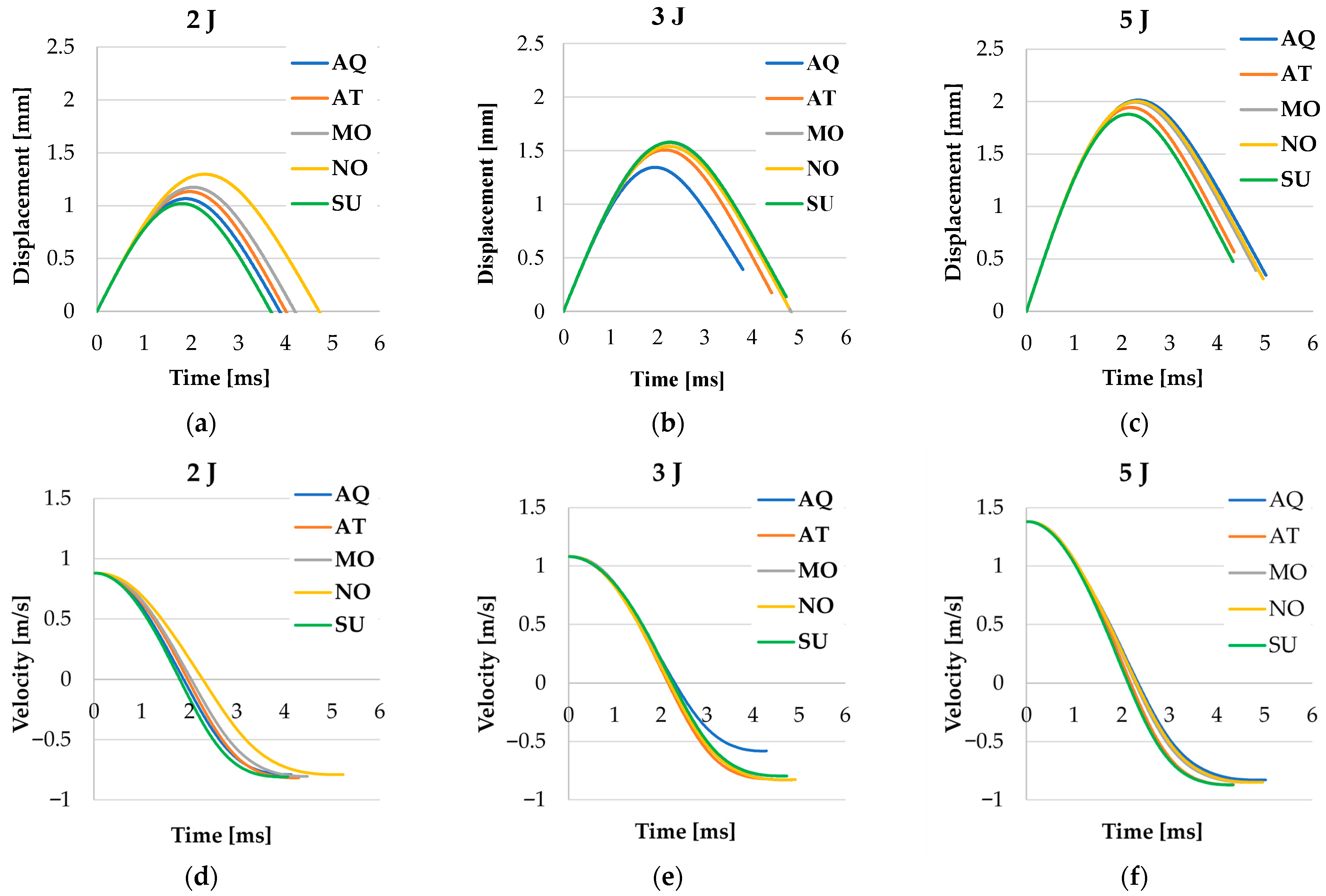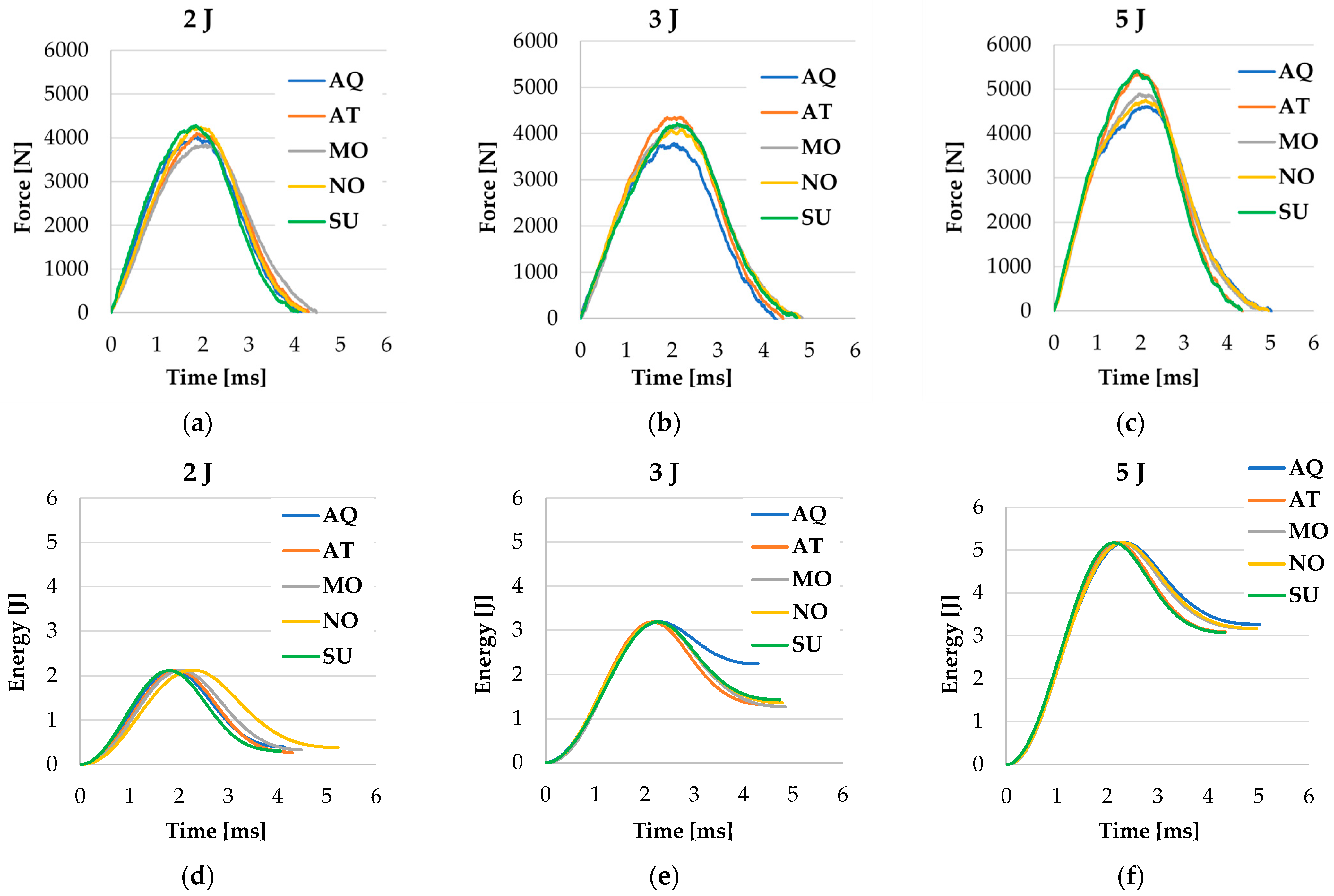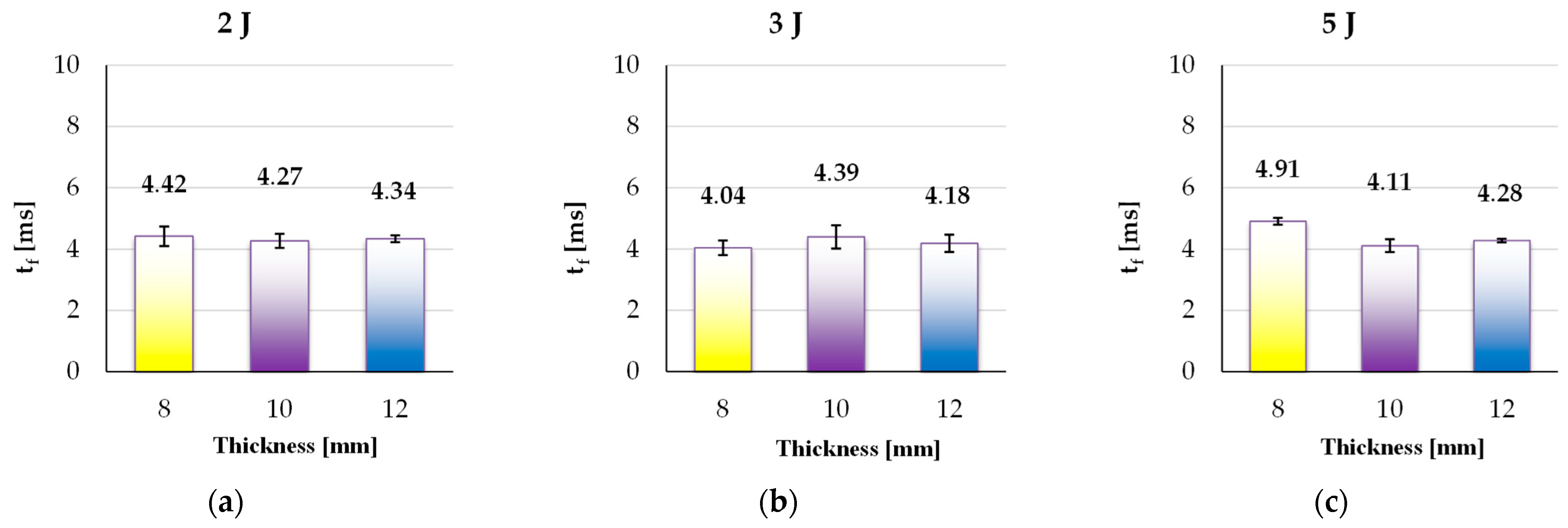 - Impact duration, tf—Small variations in the 2–5 J range,