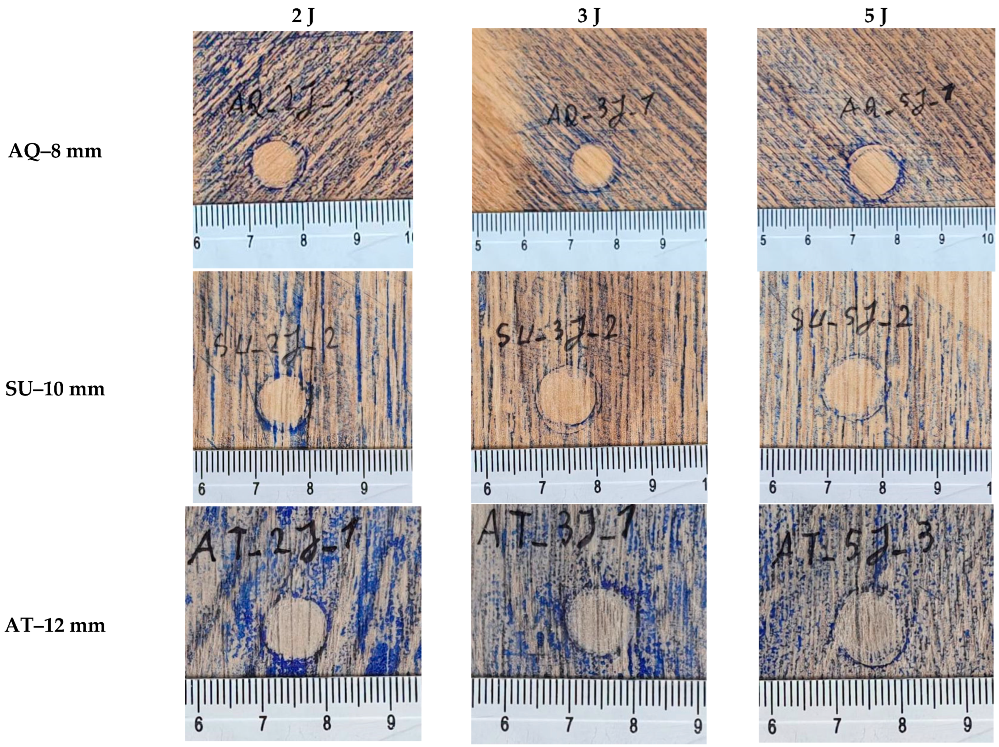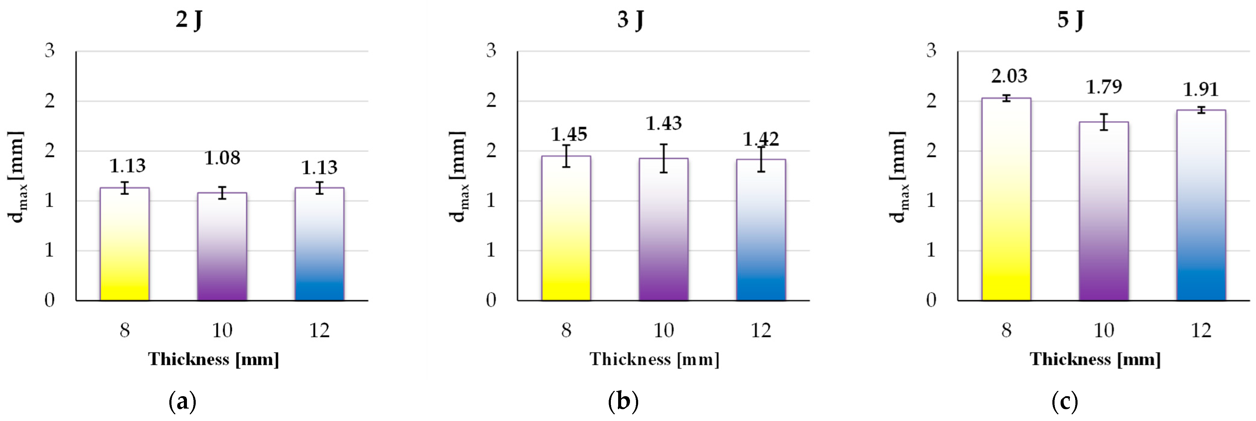 - The diameter of the indentation decreases with increasing thickness, indicating better resistance to local deformation for the tested samples—the percentage differences were the greatest at 5 J (over 9%).