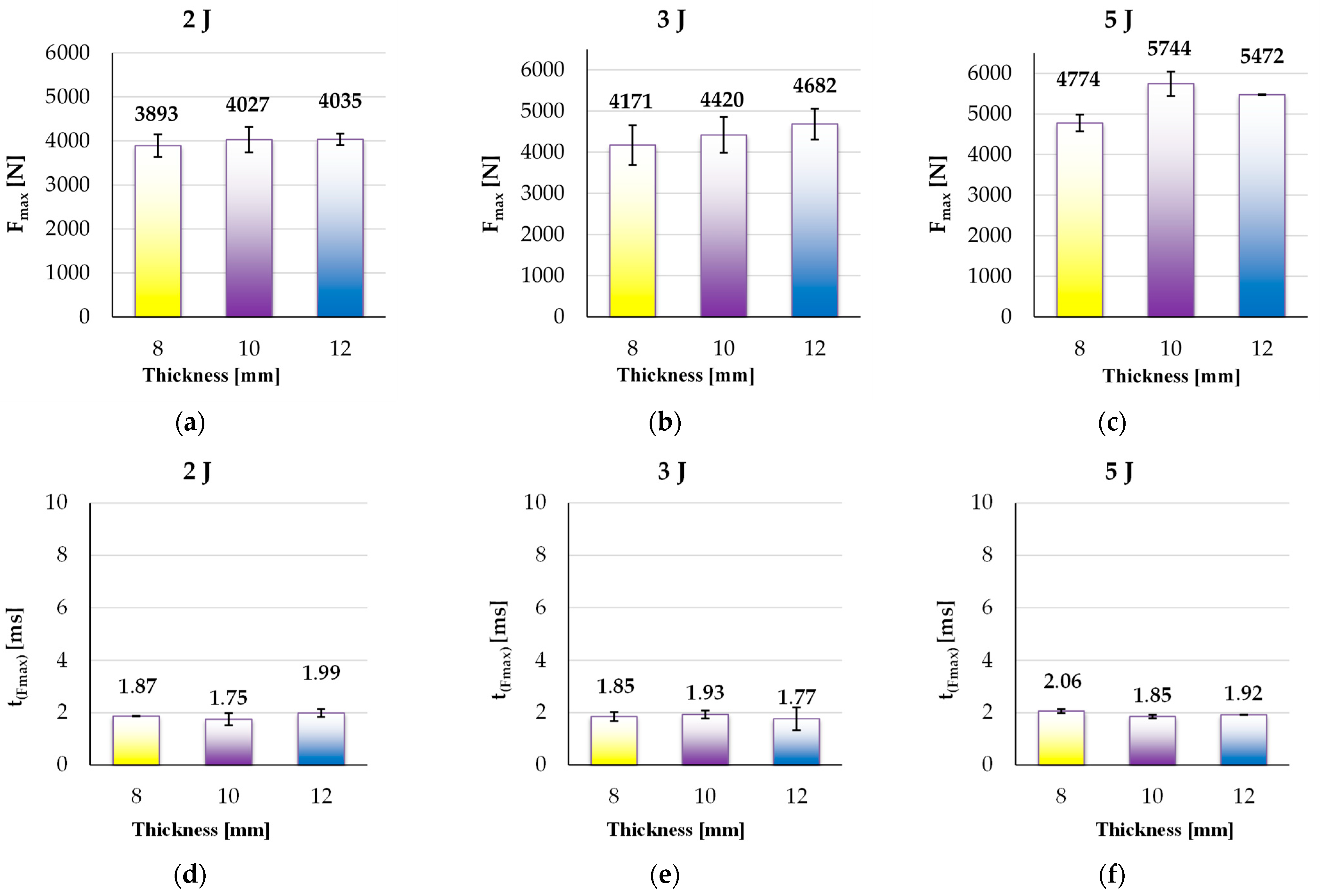 | Fmax [N] | 4774.20 | 5743.60 | 5472.00 | Increase with thickness, but with small local variations |