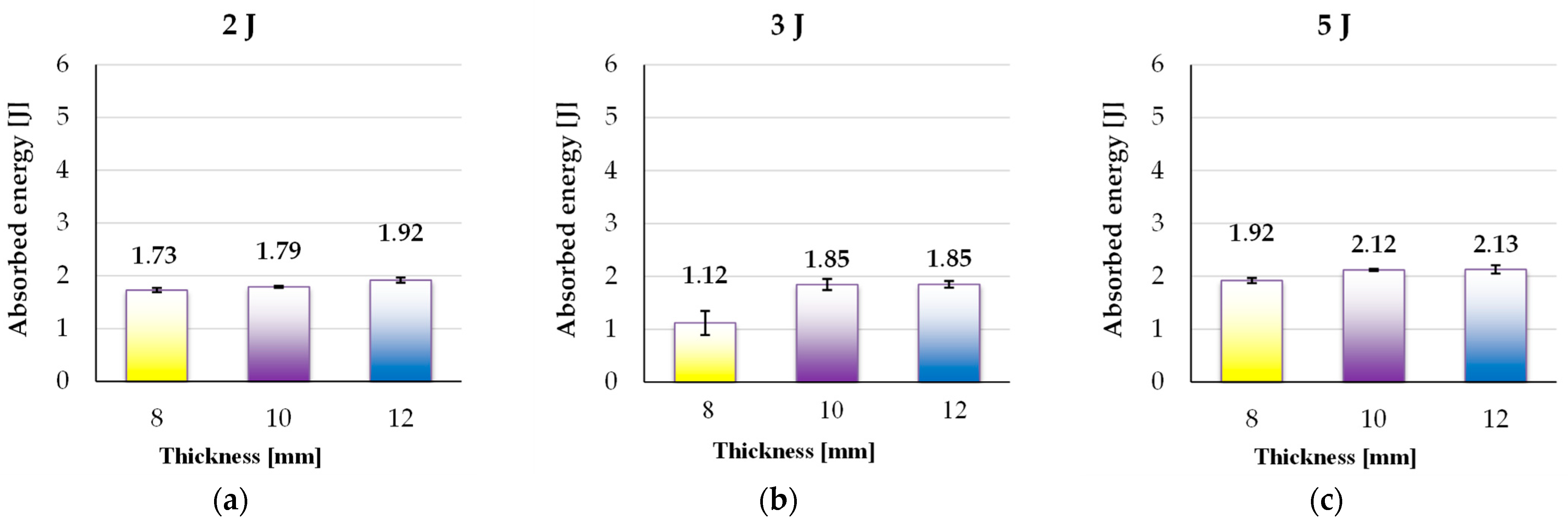 - The absorbed energy increases slightly with thickness (up to ~41% for 10–12 mm plates, at 5 J), confirming a slightly improved energy-dissipation ability within the tested thickness range.