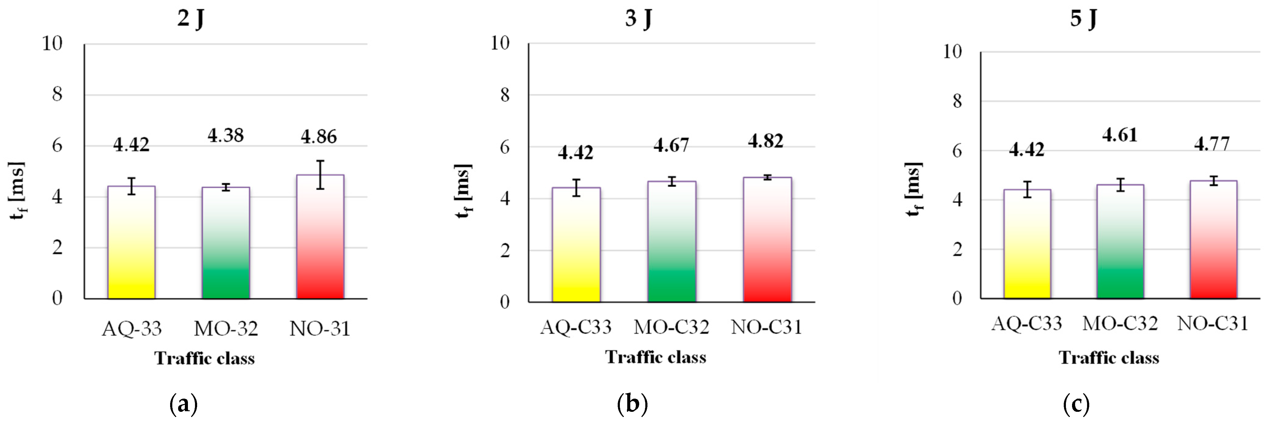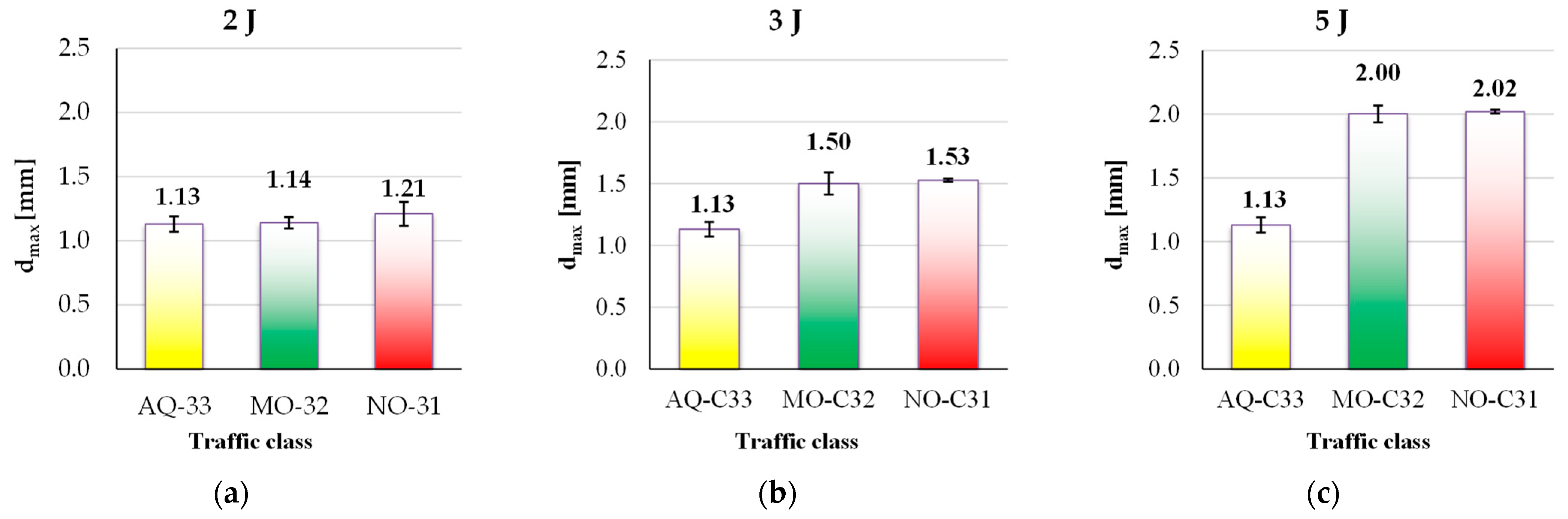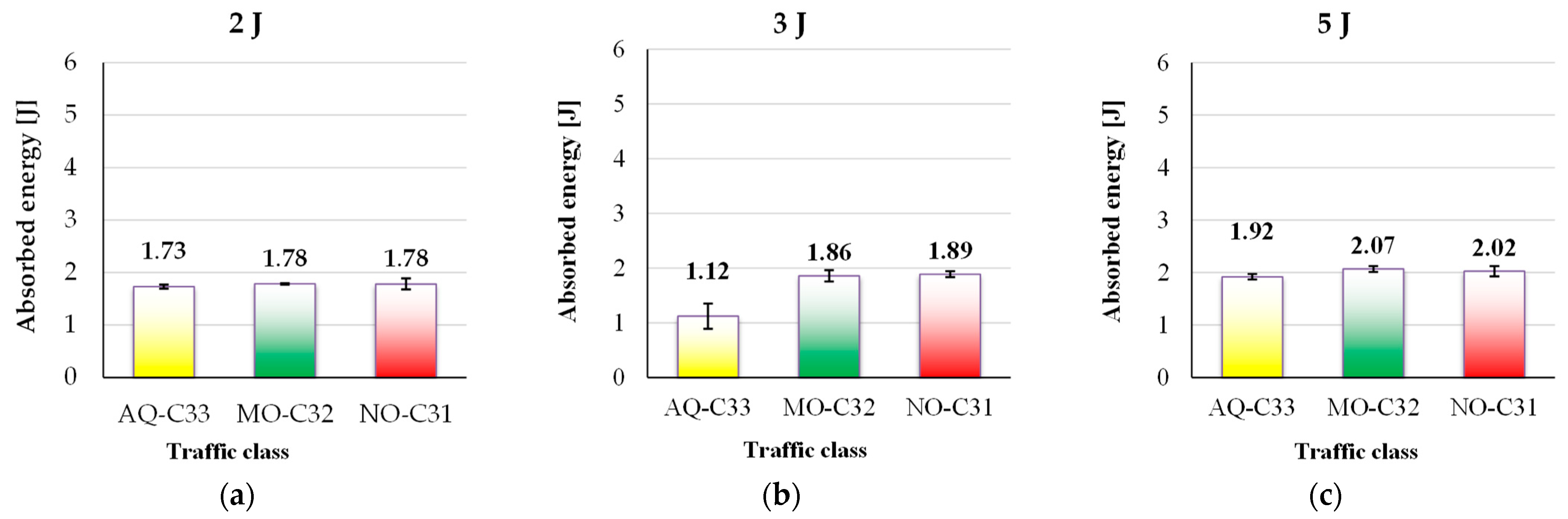 - At the low impact energy level of 2 J, the differences between the traffic classes are minimal or even negligible. However, at impact energy levels of 3 J and 5 J, a slight increasing trend in the maximum impact force can be observed, from the higher class (C33) toward the lower class (C31).