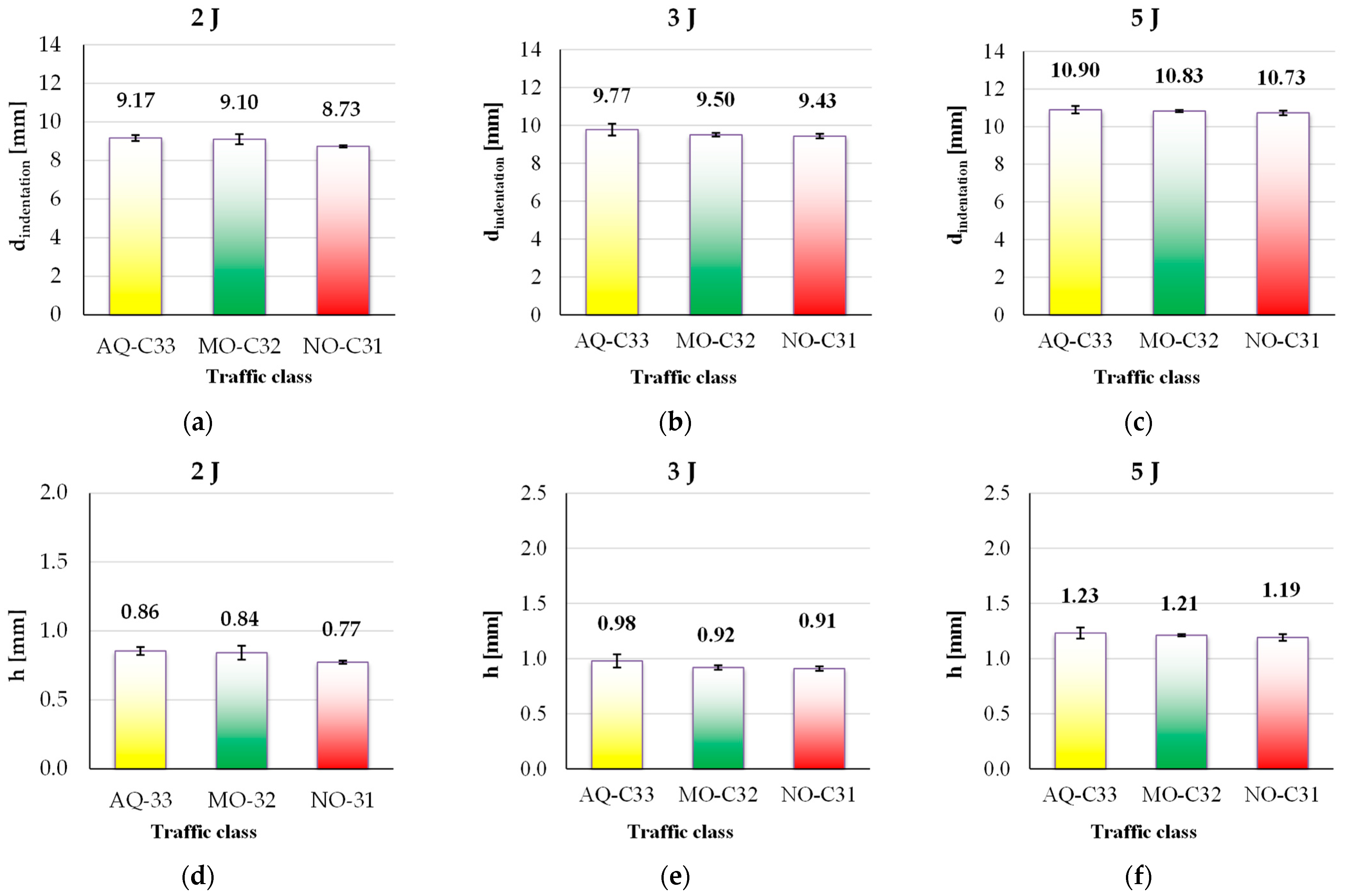 - The difference in indentation diameter, from the impact energy 2 J to 5 J, is 1.73 mm for C33 and C32 brands and 2.00 mm for the class C31, meaning that the selection should include other parameters required by the particular aspects of usage. Although C33 is designed for heavy-duty traffic, under impact loading it exhibited larger indentations compared with C31 and C32. This finding indicates that impact resistance does not depend only on the declared traffic class, but also on brand-specific multilayer construction. The influence of impact energy level on tested brand for class traffic pointed out that the absorbed energy differs very low among classes (maximum 7–8% at 5 J, between C33 and C31), suggesting a very similar quality level for the designated traffic classes, likely influenced by the formulation of the upper protective layer.