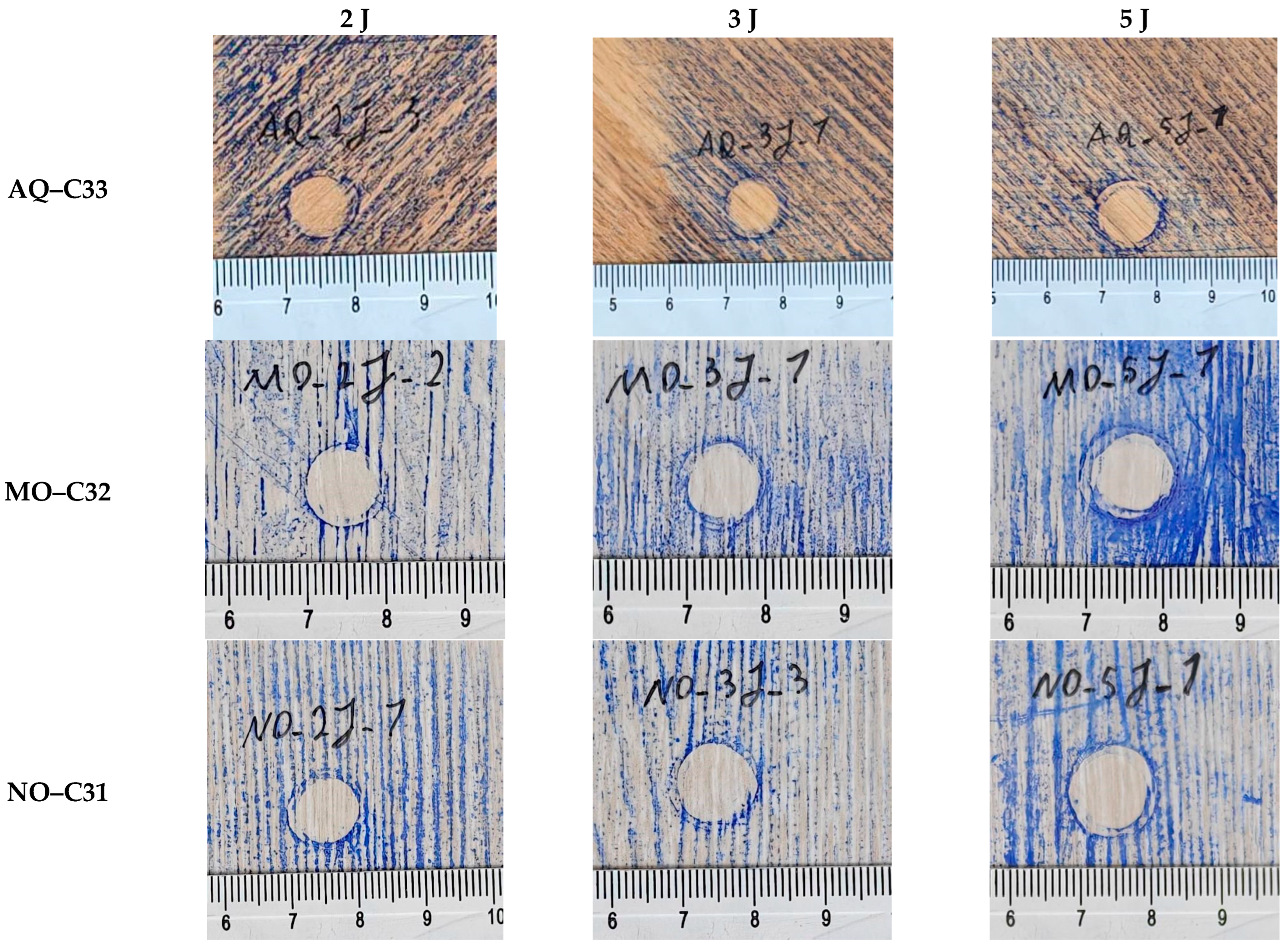 - The indentation diameter proved to be the most sensitive indicator; nevertheless, the differences among the classes (C33, C32, C31) were small, reflecting a comparable performance level among the tested brands. This similarity is likely attributable to similarities in the protective top layer used by the analyzed brands, whose formulation is legally protected.