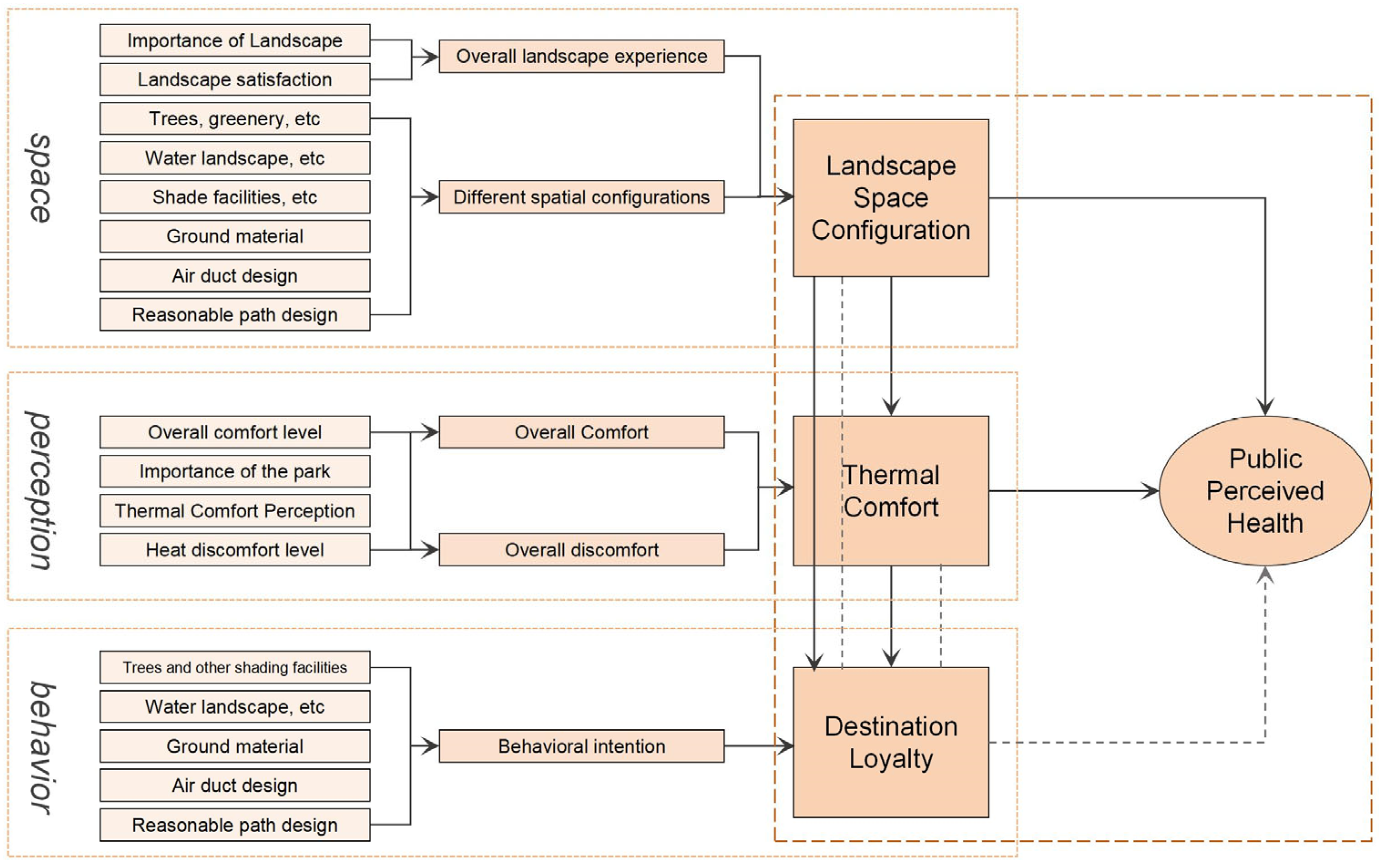 73], often overlooking pedestrians’ psychological perceptions as a precursor to such data collection. This study addresses this gap by analyzing factors from the pedestrian’s perspective. Through an examination of the psychological perception of landscape spaces, it identifies thermal comfort and destination loyalty as key factors and explores their relationship with public perceived health. This research is the first to connect these four factors, confirming both the direct and indirect influences of landscape spatial configuration, thermal comfort, and destination loyalty on public perceived health. It provides a theoretical framework grounded in pedestrian psychological perception that precedes physical data collection and simulation, offering valuable insights for subsequent research on physical factors and the design of urban parks.