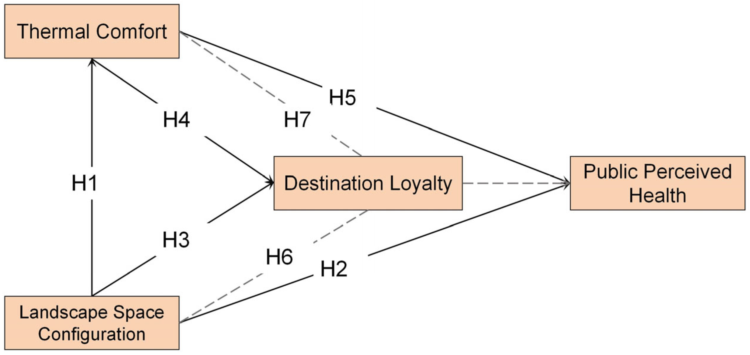 17]. Although numerous studies demonstrate the independent impact of green spaces on public perceived health, the potential interactions among mediating variables have been less explored. Notably, the roles of destination loyalty and thermal comfort in influencing public perceived health have been largely overlooked [