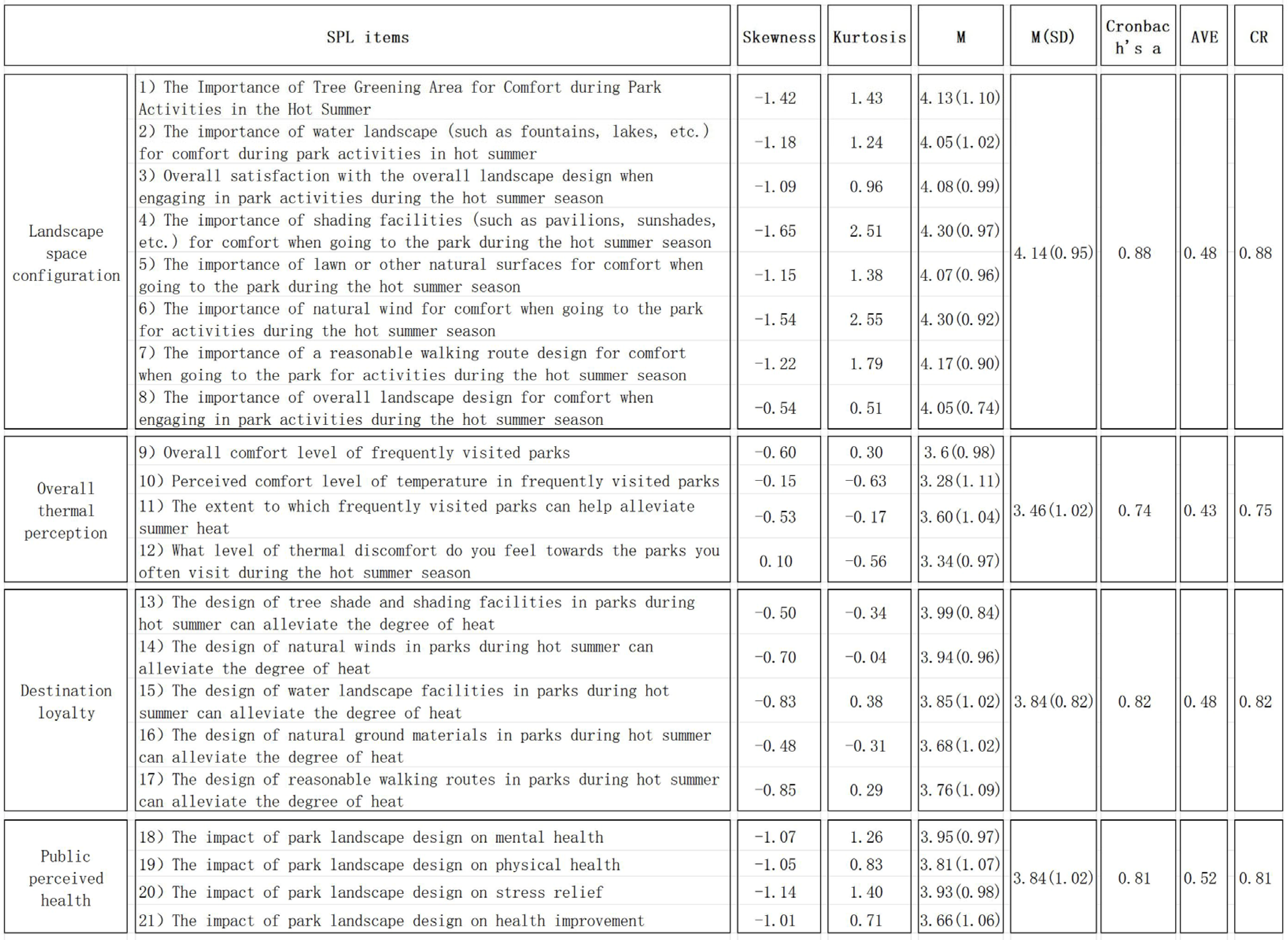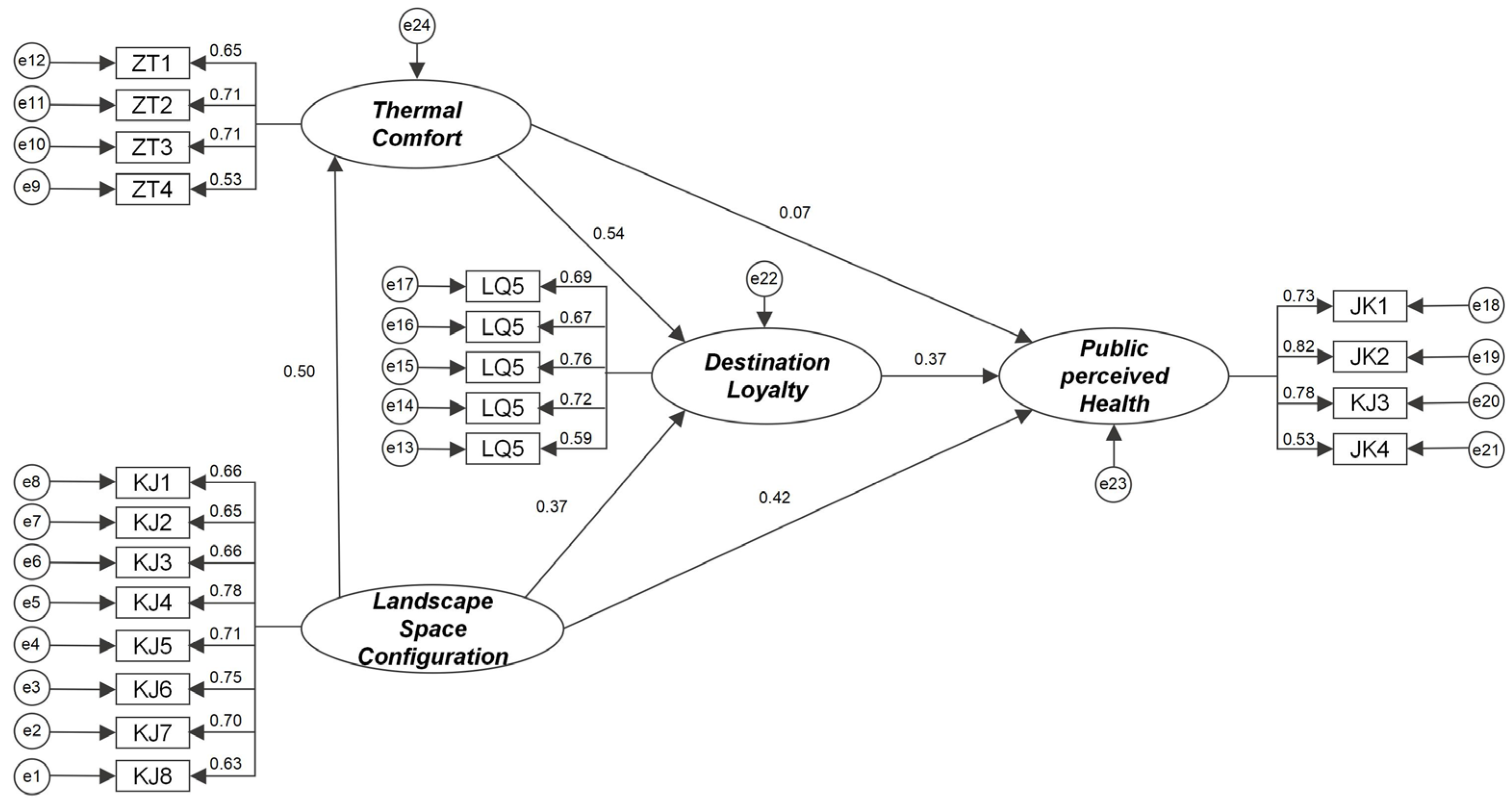 This study investigated the relationships among landscape spatial configuration, thermal comfort, destination loyalty, and public perceived health among pedestrians in urban parks during summer heat. The findings provide valuable insights for incorporating health-oriented landscape design considerations into urban park planning.