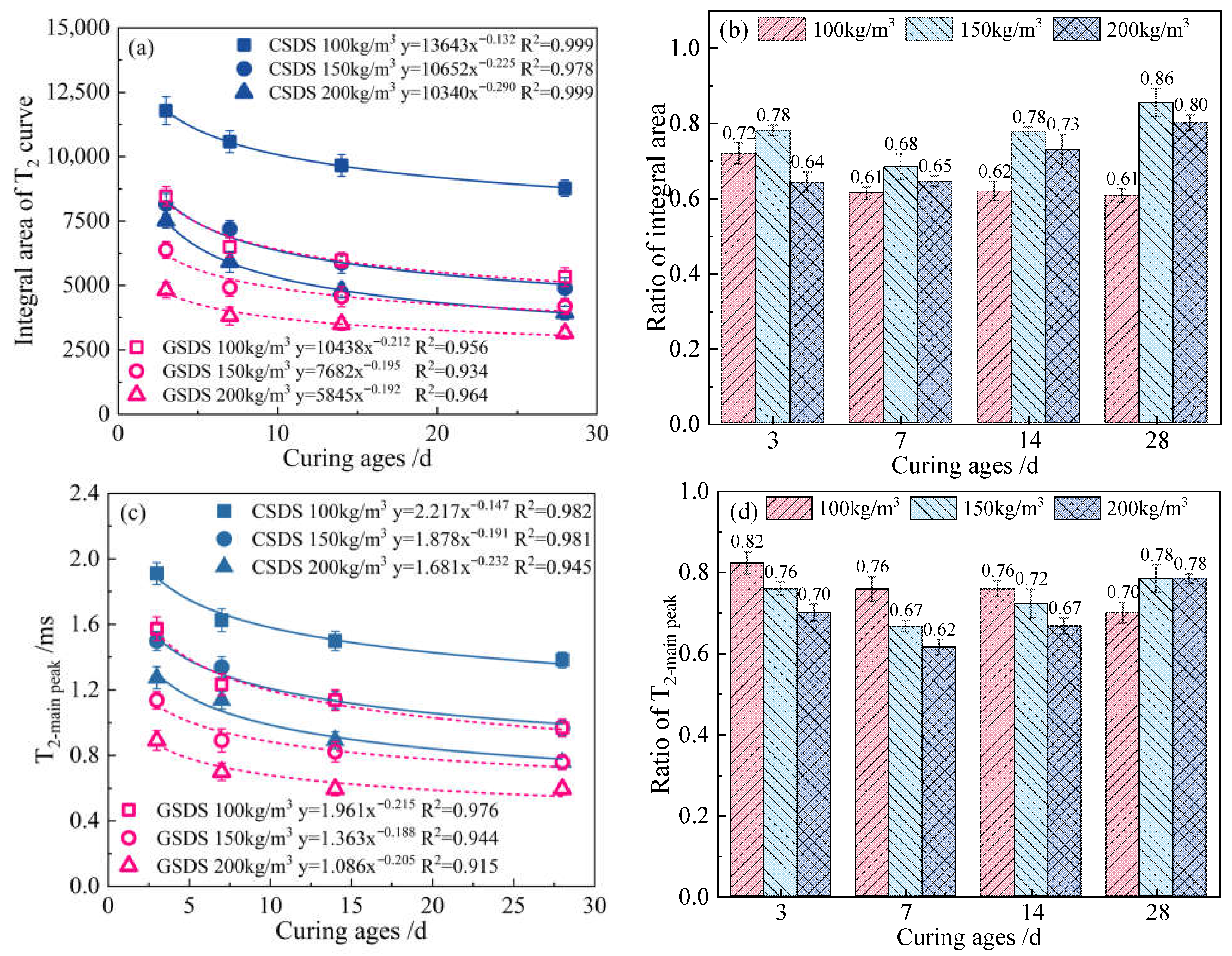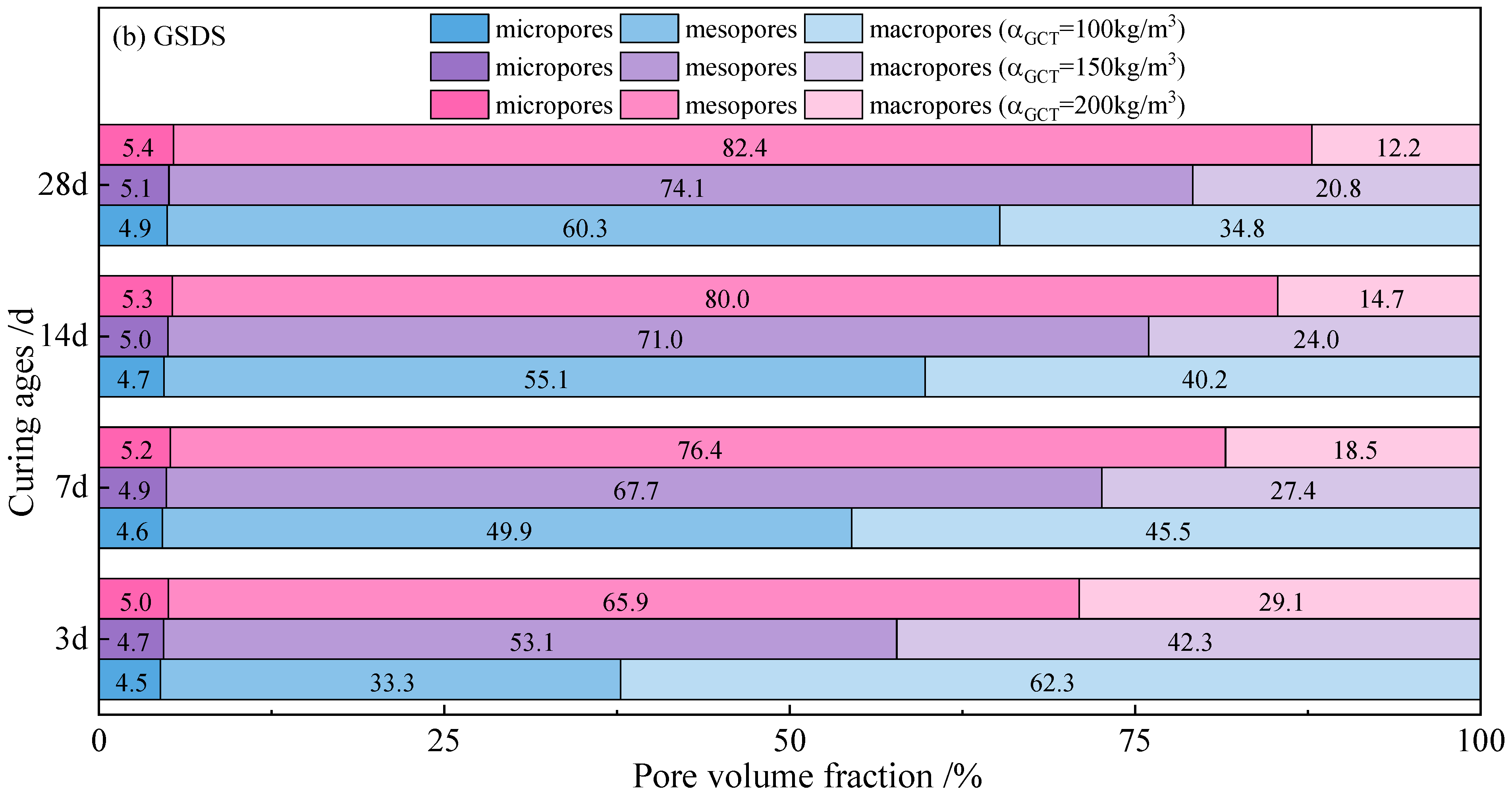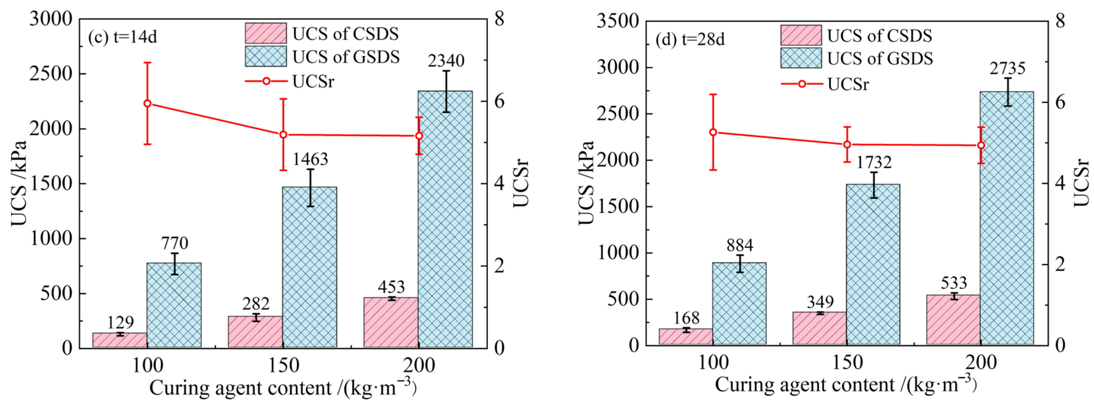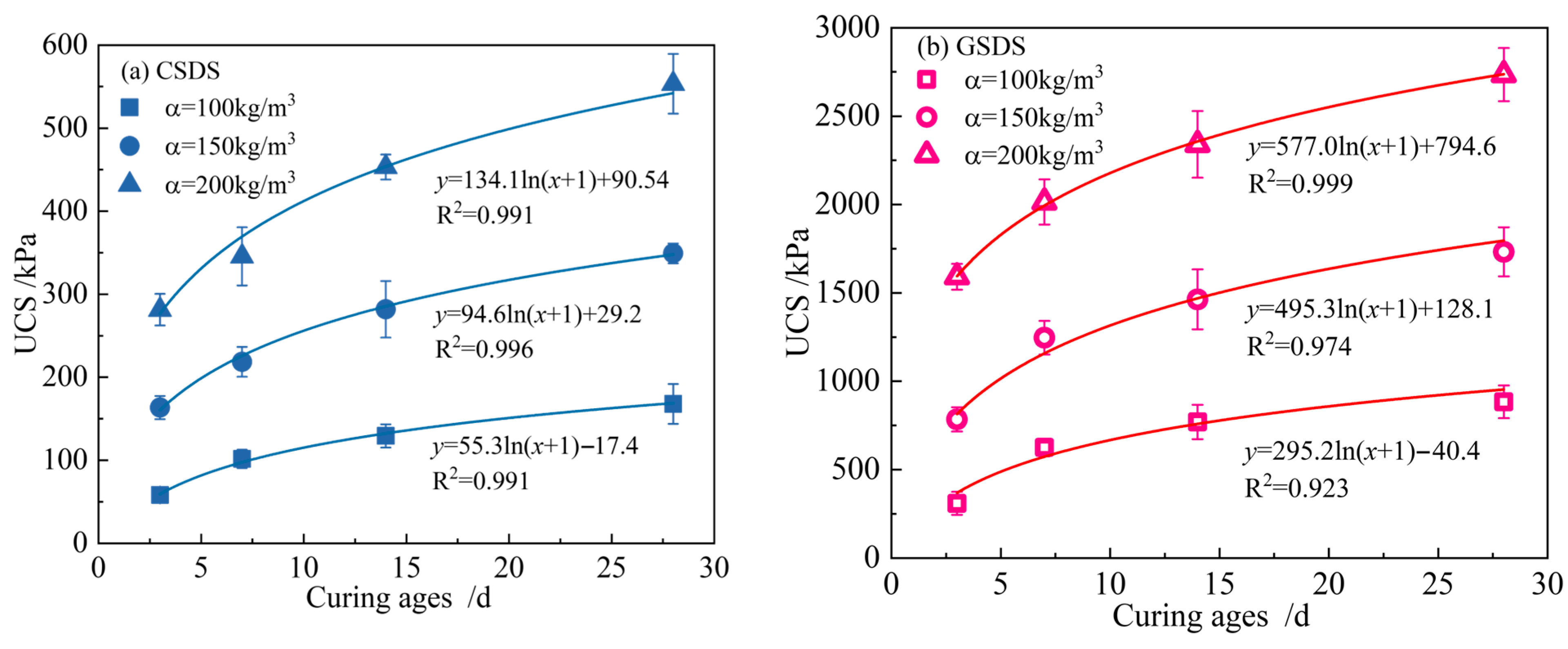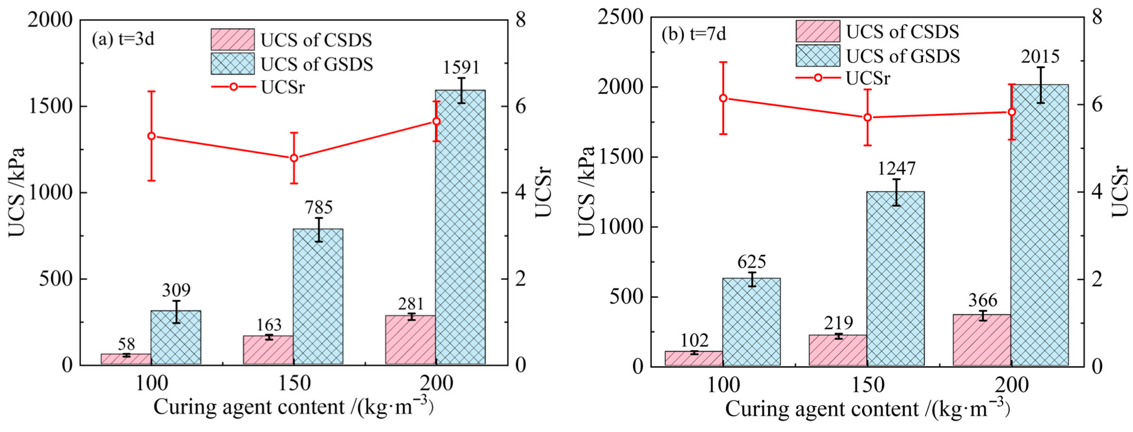 - For both CSDS and GSDS, UCS and mesopore volume fraction exhibit logarithmic growth with increasing curing age. In contrast, the total pore volume and the most probable pore size decrease following a power-law relationship. The decline in pore volume primarily results from the transformation of macropores into mesopores, while the micropore volume fraction remains relatively stable at approximately 3~5%, showing minimal variation with changes in curing age and curing agent content. Compared to CSDS, the UCS of GSDS is approximately 5~6 times higher under comparable conditions, along with significantly enhanced deformation resistance. In addition, GSDS exhibits significantly greater early strength development and a more rapid decrease in pore volume within the first 7 days, with its 7-day UCS reaching approximately 70% of the 28-day value. Furthermore, GSDS presents a markedly higher mesopore volume fraction than CSDS, demonstrating superior structural integrity and overall strength development.