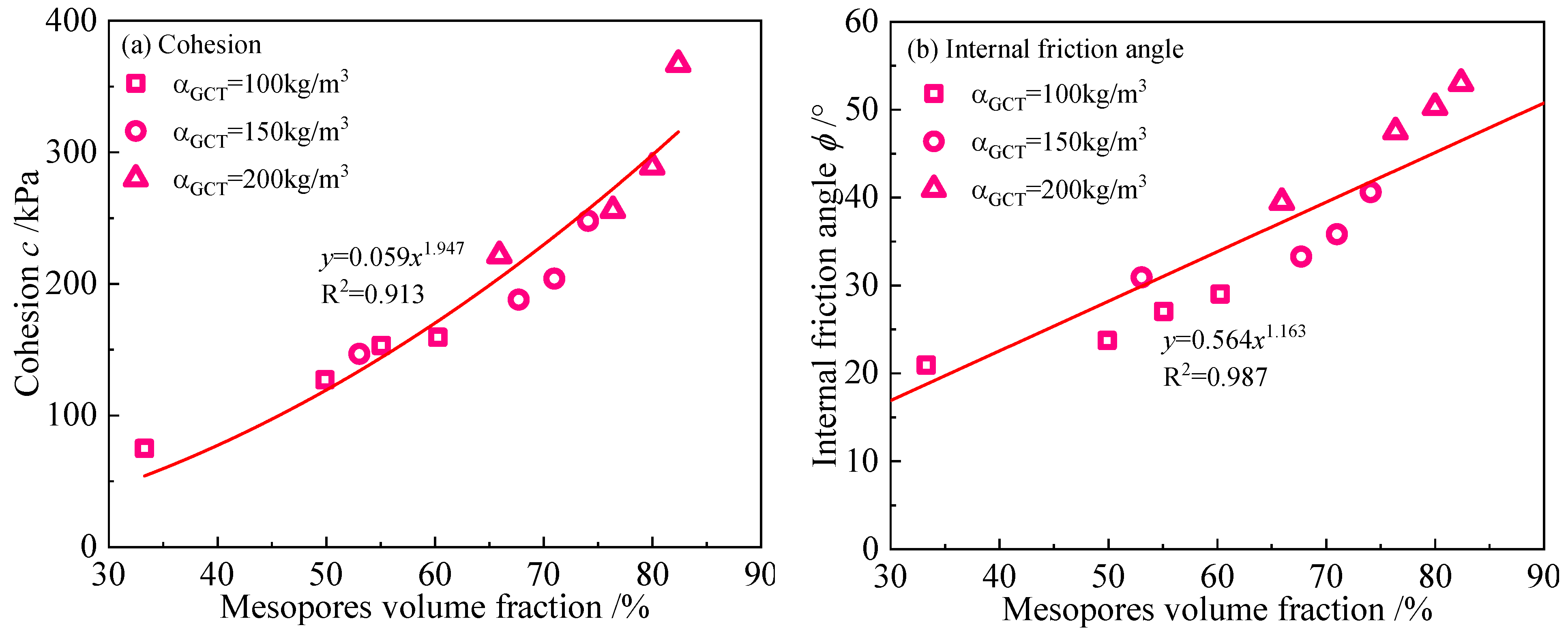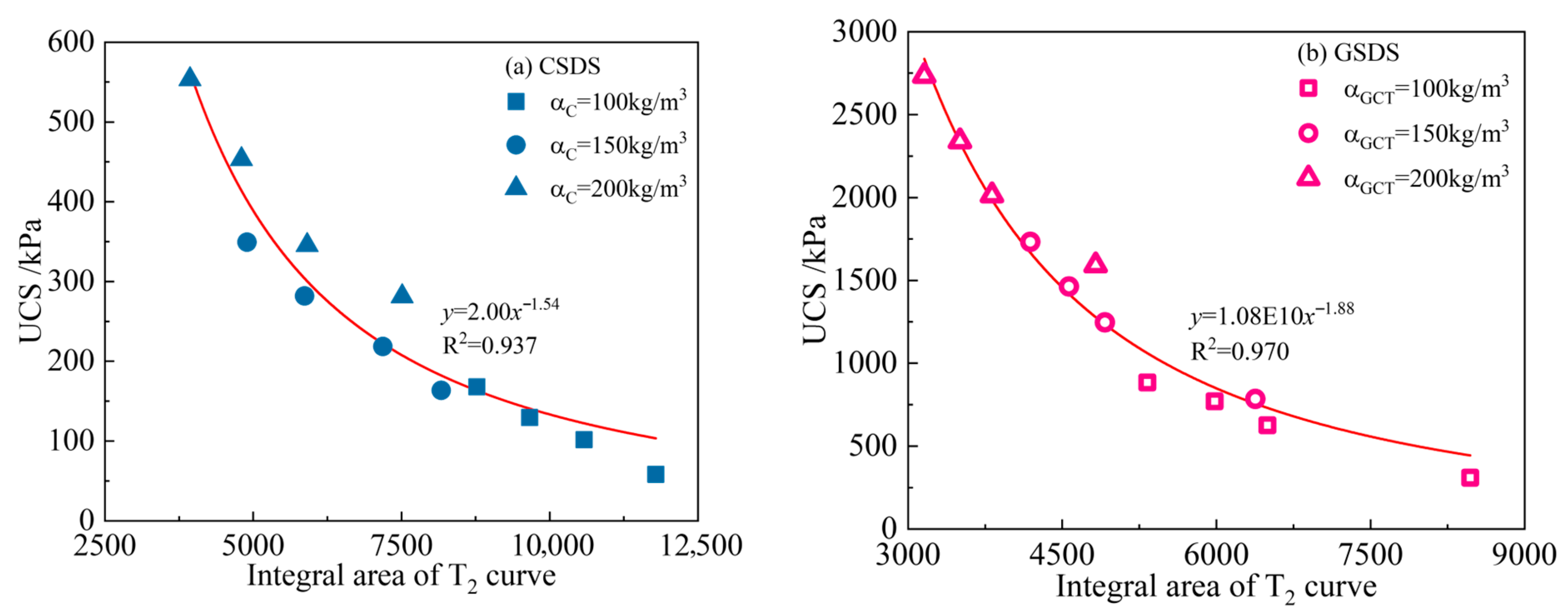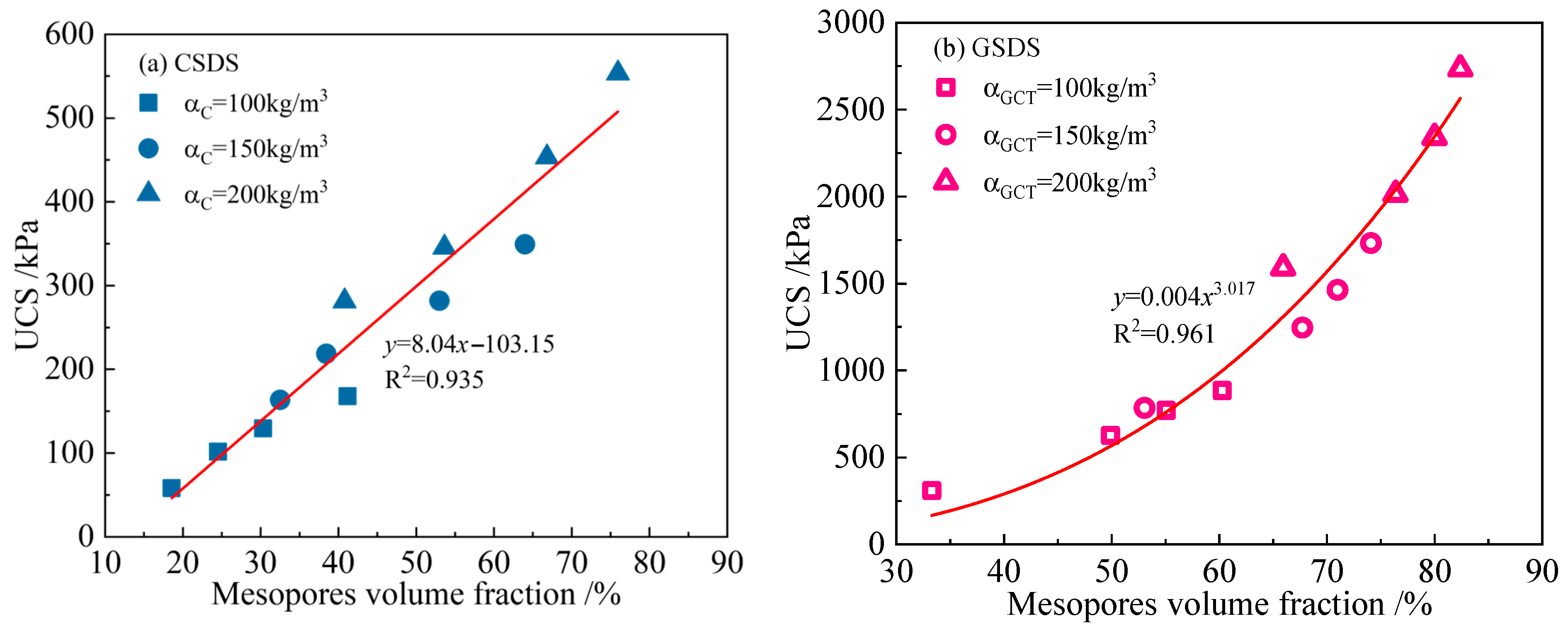 - Both CSDS and GSDS exhibit a power-law decline in UCS with increasing total pore volume. Regarding mesopore volume fraction, UCS in GSDS increases following a power-law trend, while a linear increase is observed in CSDS. Additionally, in GSDS, both c and φ increase logarithmically with curing age. A strong linear correlation exists between c and UCS, whereas φ exhibits a power-law increase with UCS. Furthermore, both c and φ decrease with increasing total pore volume according to power-law relationships. As mesopore volume fraction increases, c increases in a power-law manner, whereas φ increases linearly. Macroscopic mechanical performance is strongly correlated with the evolution of microscopic pore structure.