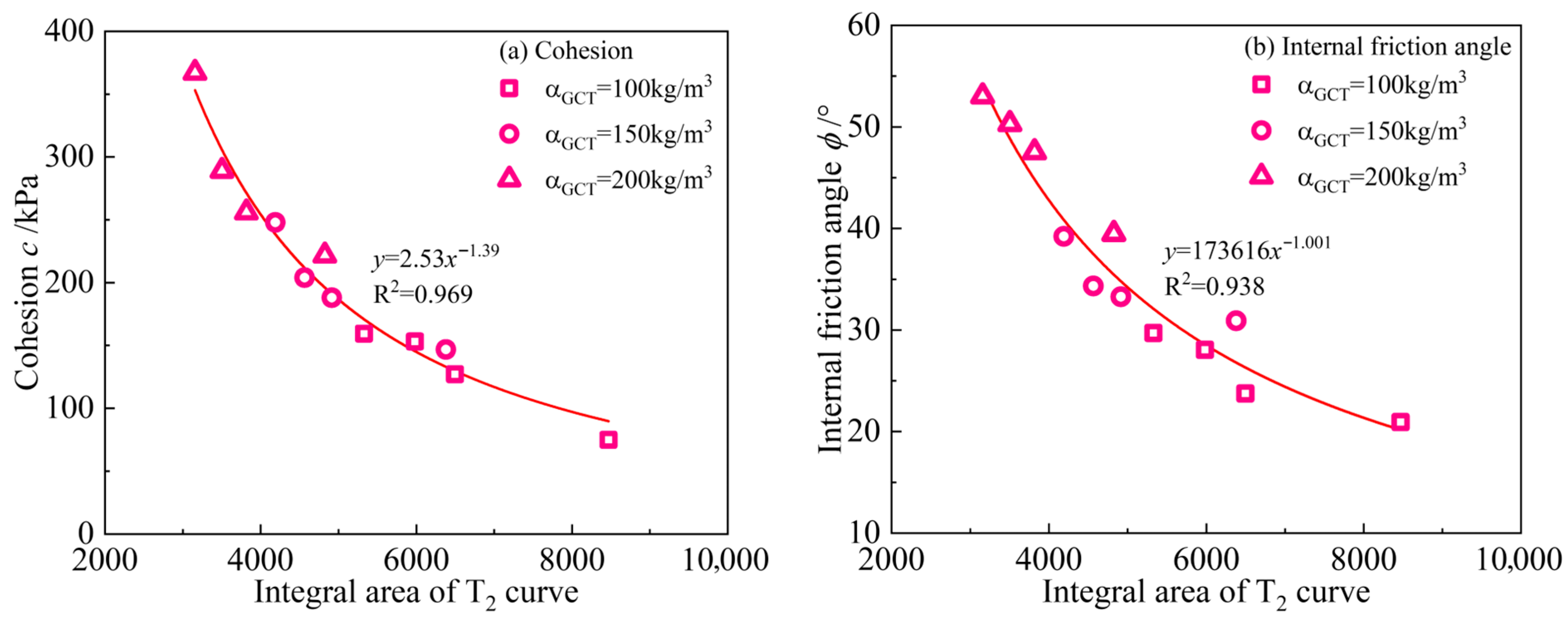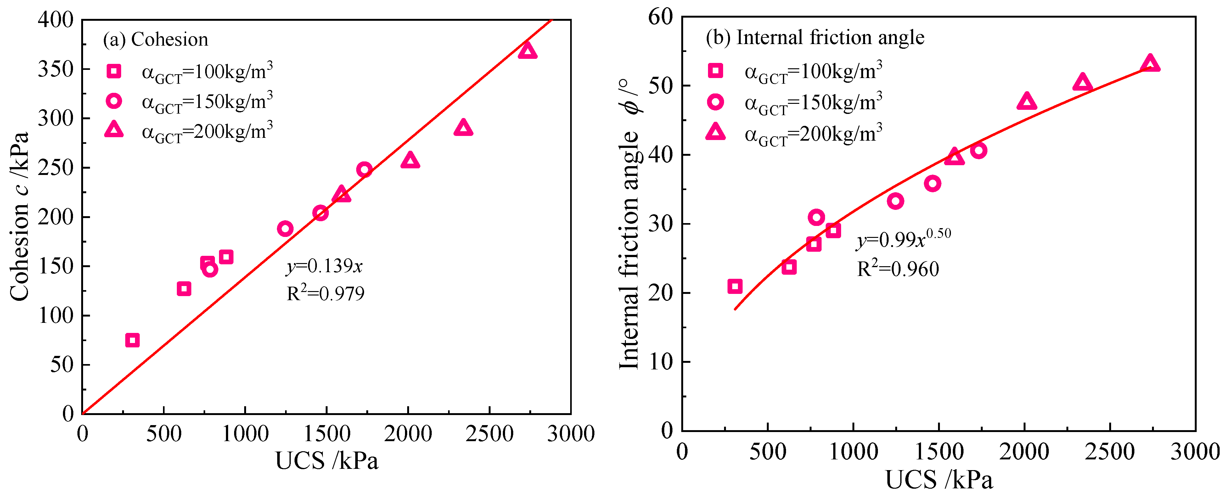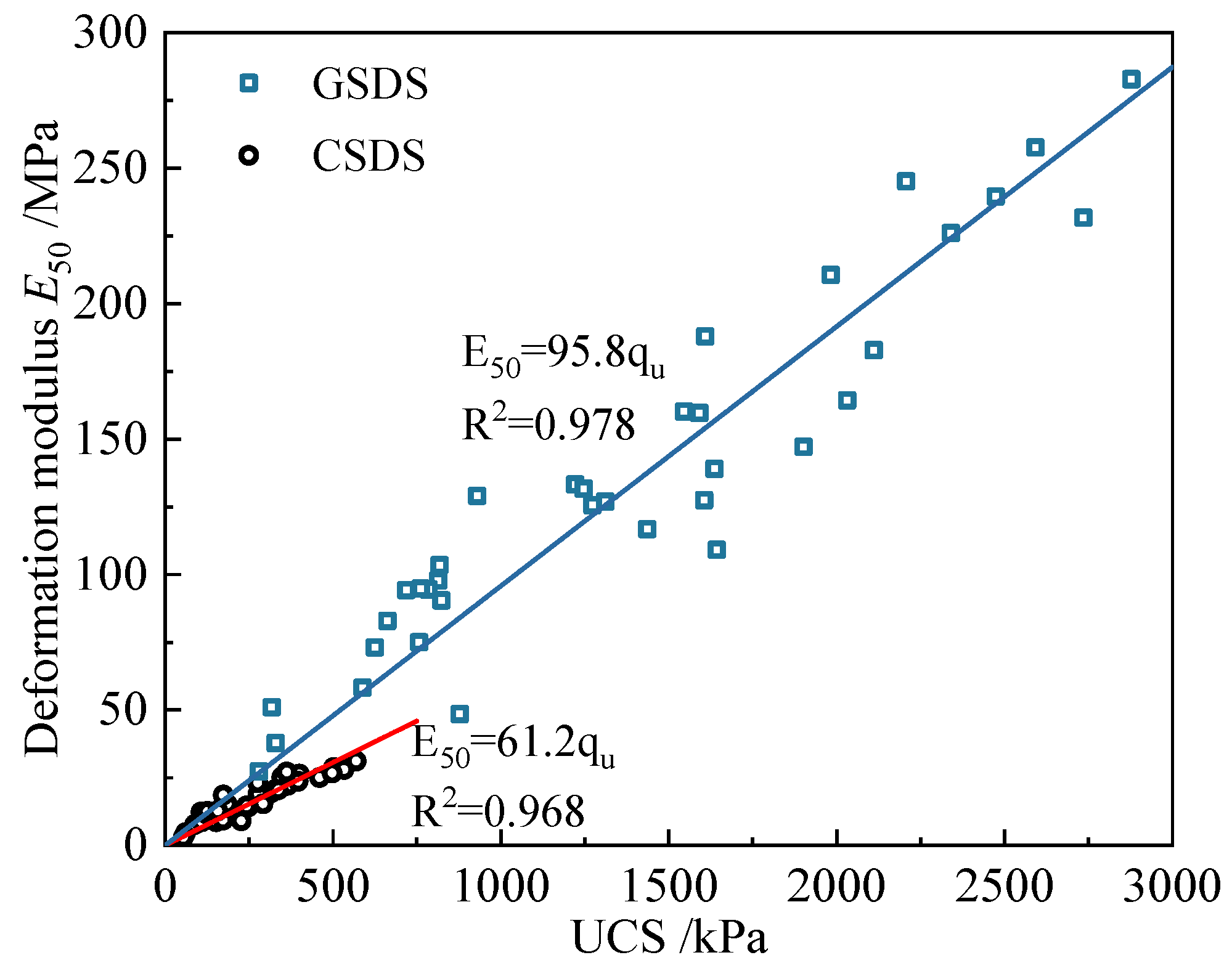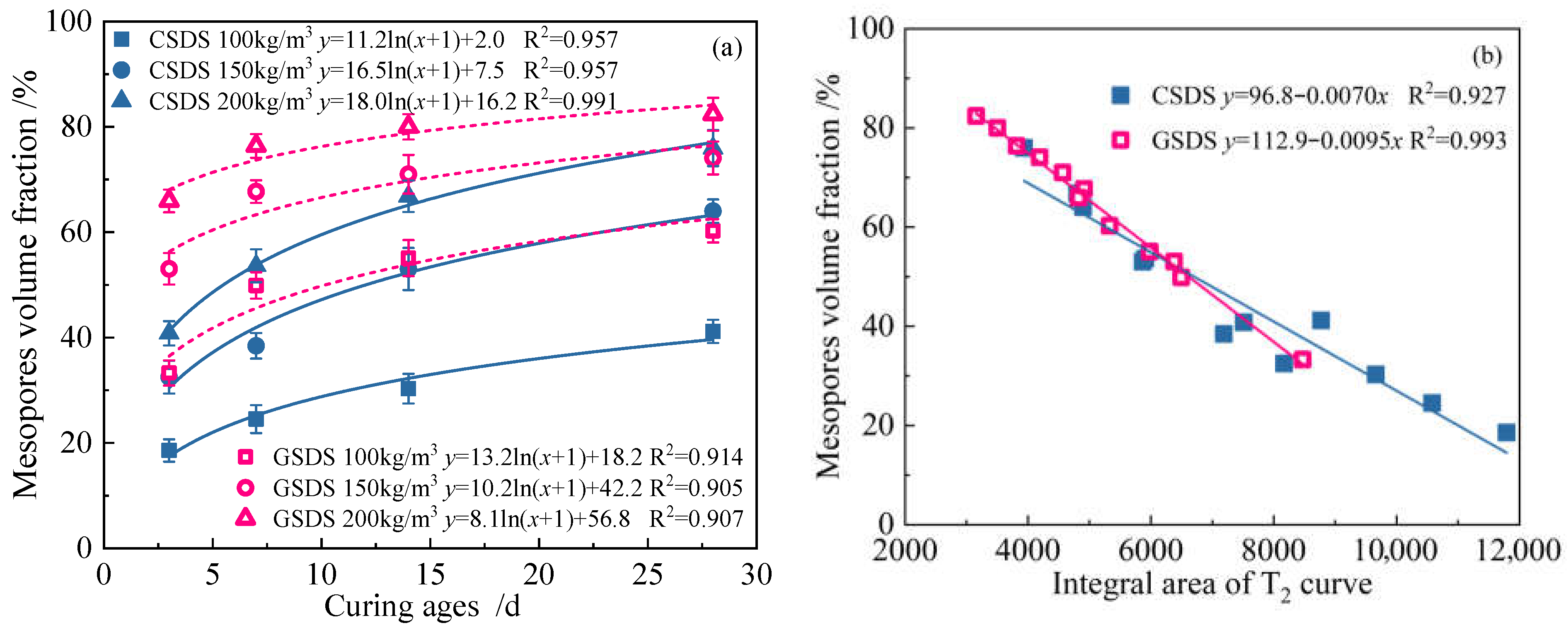 - Both CSDS and GSDS exhibit a power-law decline in UCS with increasing total pore volume. Regarding mesopore volume fraction, UCS in GSDS increases following a power-law trend, while a linear increase is observed in CSDS. Additionally, in GSDS, both c and φ increase logarithmically with curing age. A strong linear correlation exists between c and UCS, whereas φ exhibits a power-law increase with UCS. Furthermore, both c and φ decrease with increasing total pore volume according to power-law relationships. As mesopore volume fraction increases, c increases in a power-law manner, whereas φ increases linearly. Macroscopic mechanical performance is strongly correlated with the evolution of microscopic pore structure.