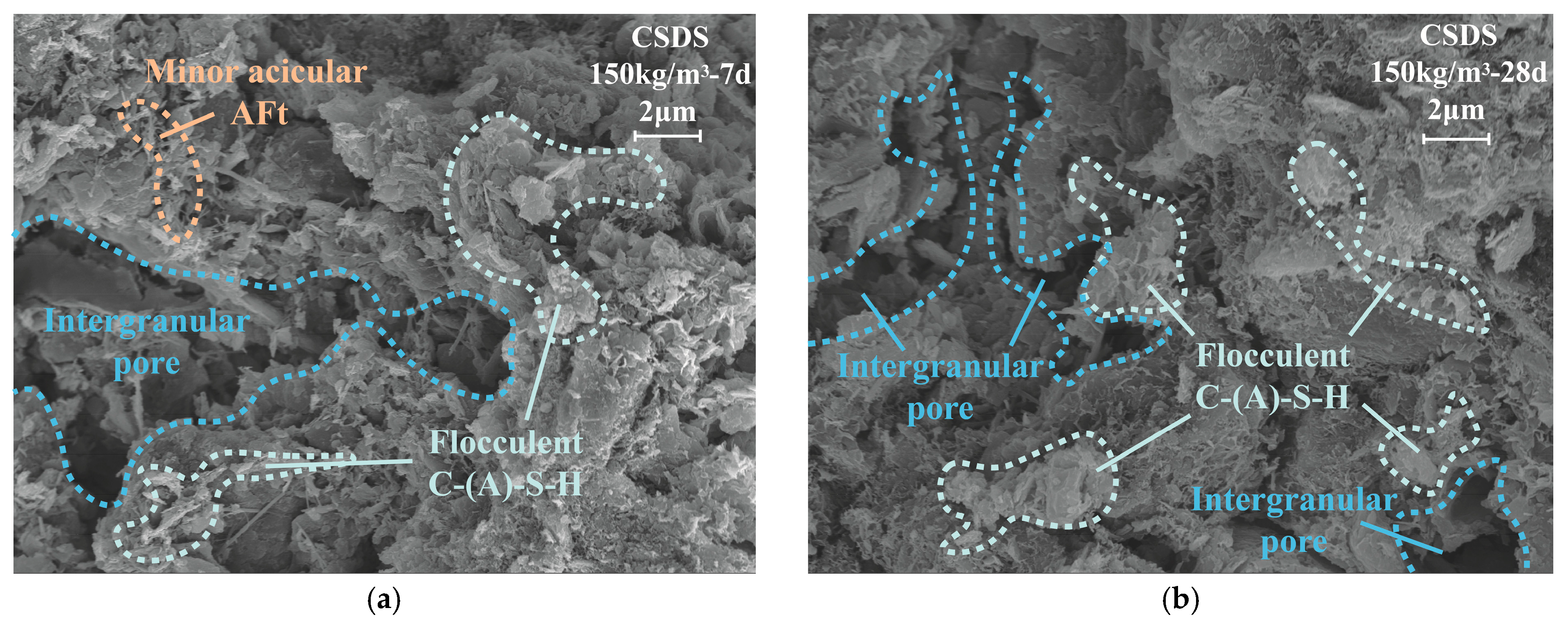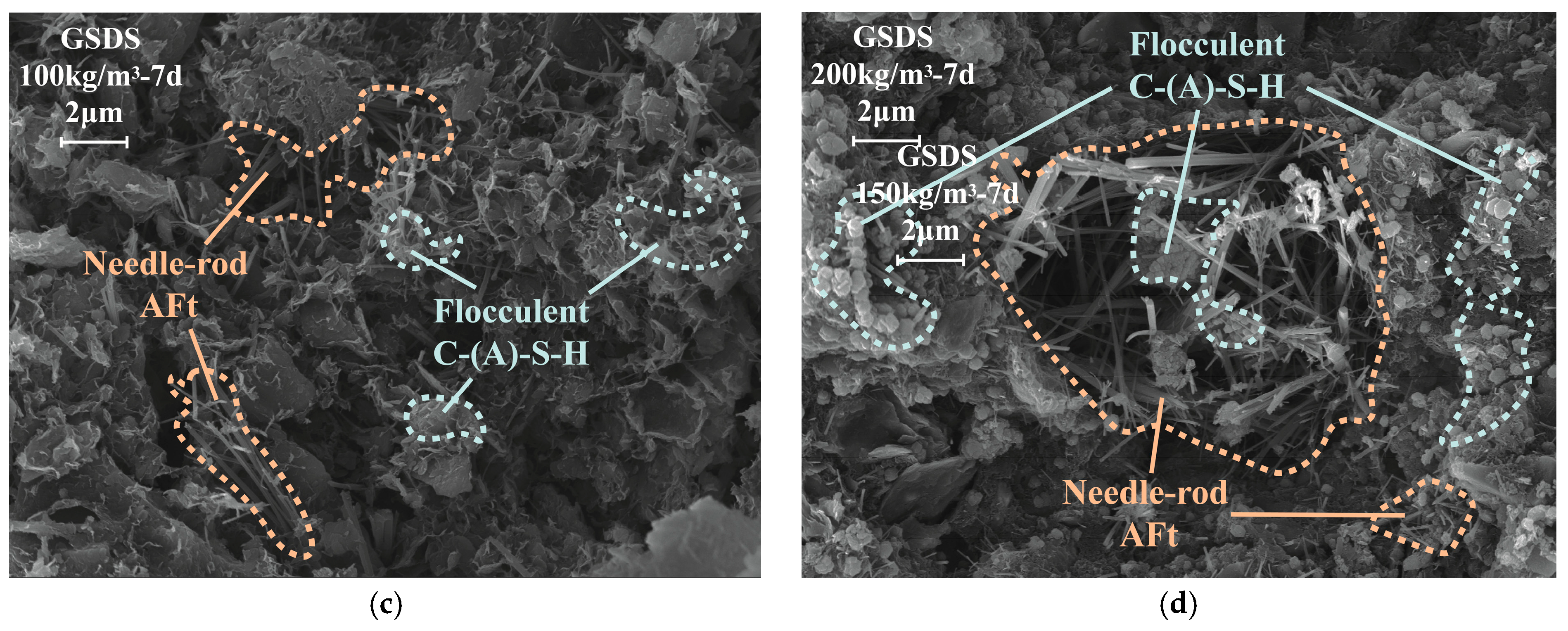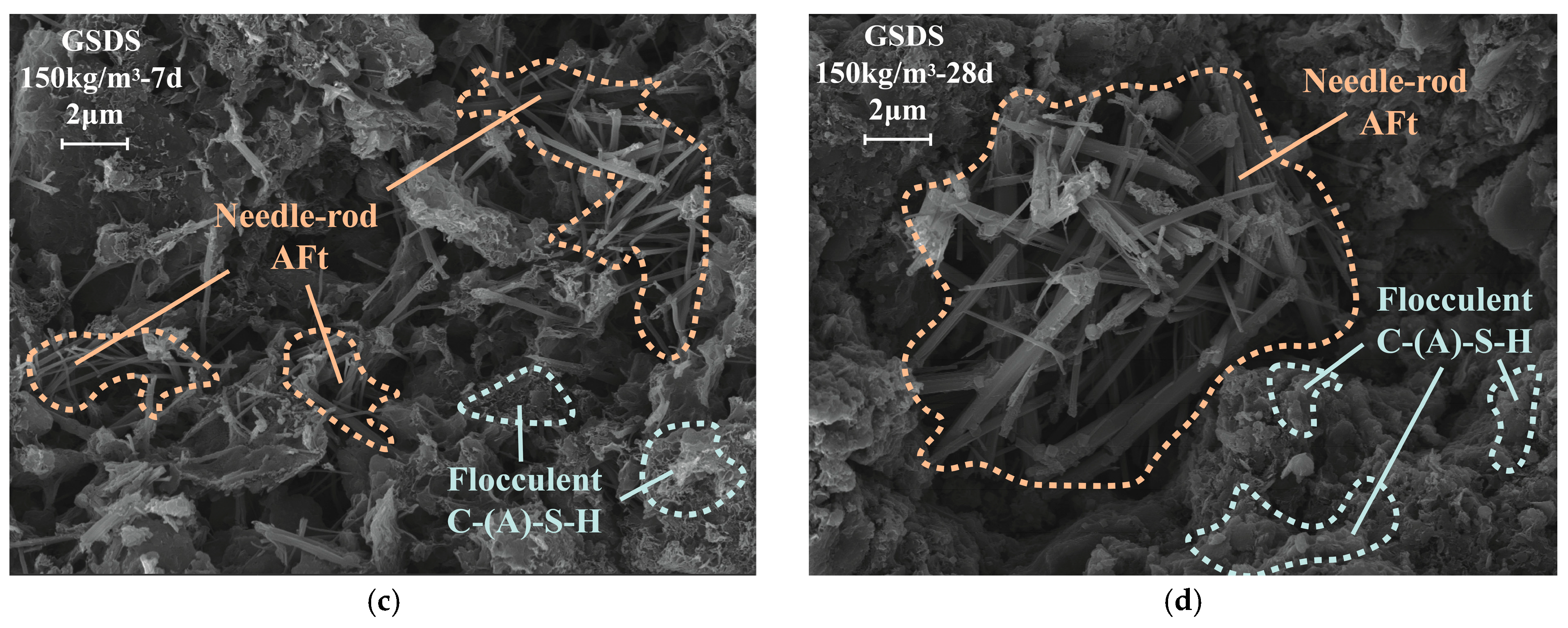 - In CSDS, soil particle surfaces are encapsulated by flocculent C-(A)-S-H gels, while substantial inter-aggregate pores remain unfilled. Strength development and pore structure refinement in CSDS primarily result from the envelopment and aggregation effects of C-(A)-S-H gels. In GSDS, GGBS is effectively activated under the combined action of CS and TG, leading to the formation of C-(A)-S-H gels and abundant expansive AFt crystals that immobilize substantial amounts of free water. The synergistic solidification mechanism in GSDS involves ion exchange, cementitious bonding, and pore filling, which effectively enhance particle aggregation, strengthen interparticle bonding, and refine the pore structure, thereby significantly improving the structural integrity and macroscopic strength of GSDS.