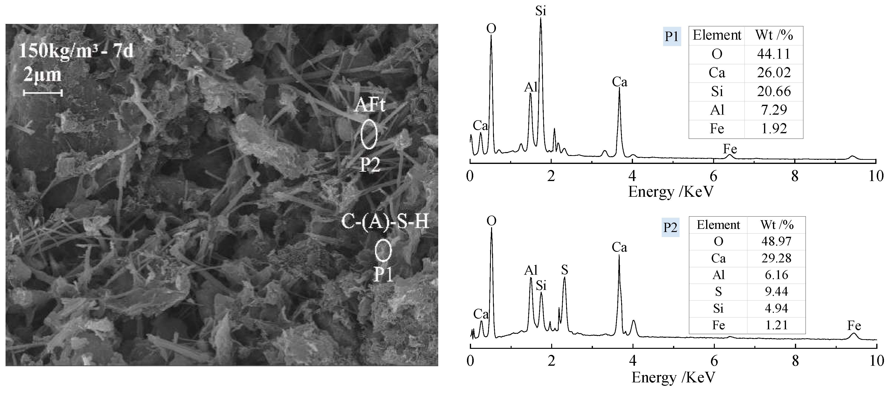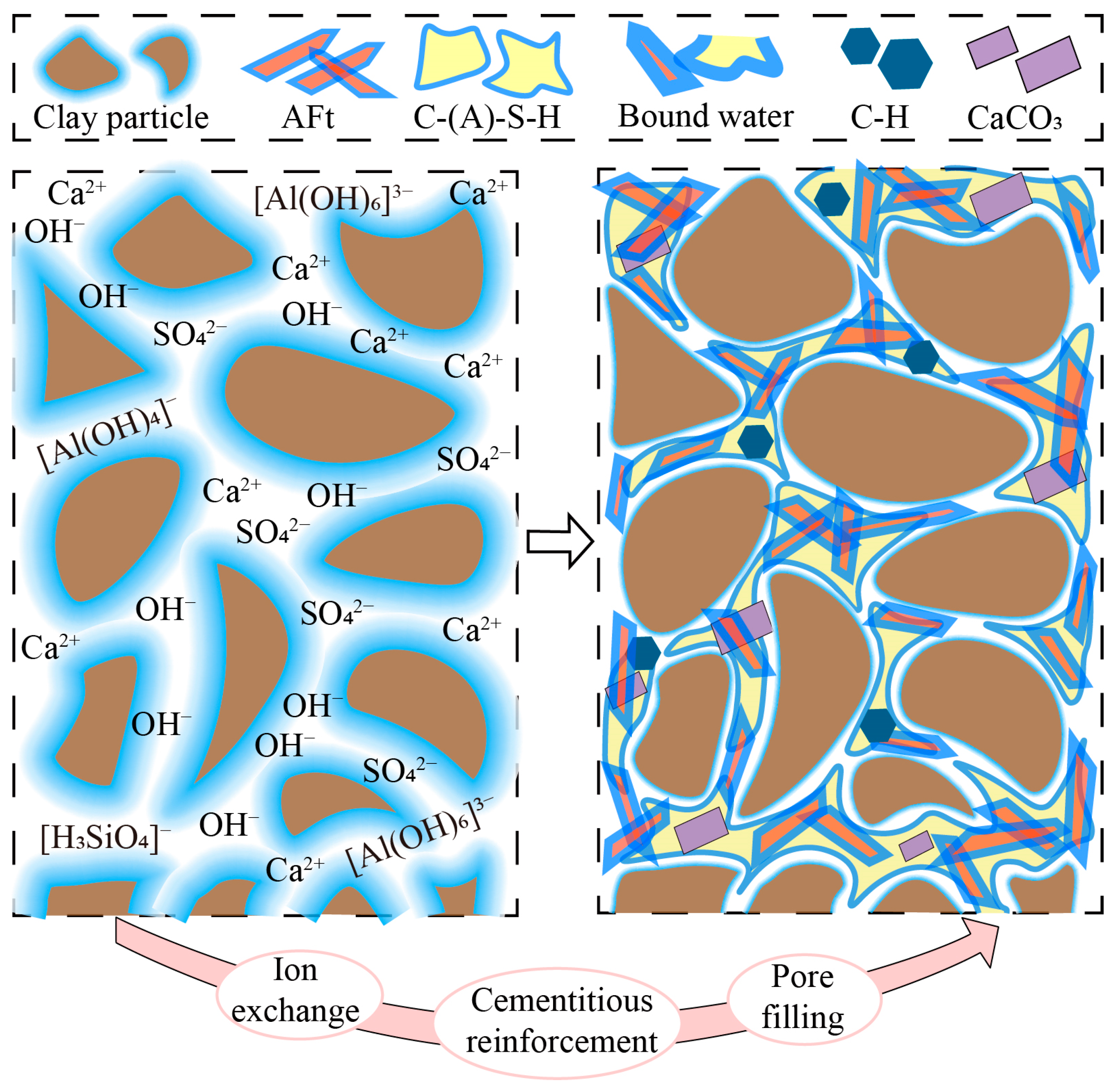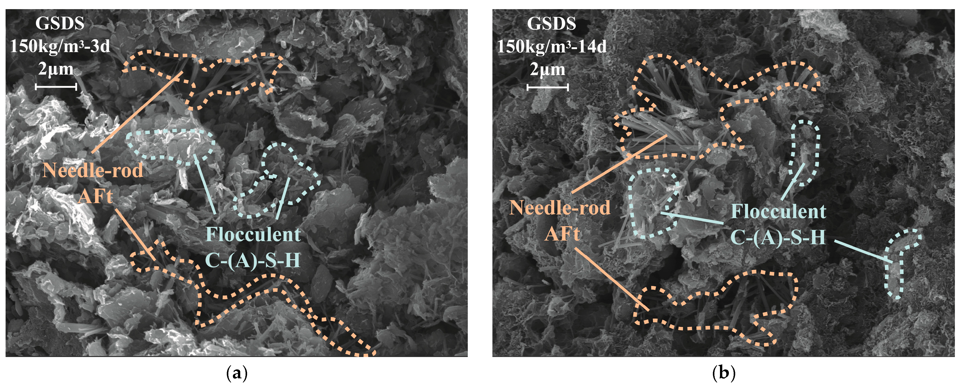 - In CSDS, soil particle surfaces are encapsulated by flocculent C-(A)-S-H gels, while substantial inter-aggregate pores remain unfilled. Strength development and pore structure refinement in CSDS primarily result from the envelopment and aggregation effects of C-(A)-S-H gels. In GSDS, GGBS is effectively activated under the combined action of CS and TG, leading to the formation of C-(A)-S-H gels and abundant expansive AFt crystals that immobilize substantial amounts of free water. The synergistic solidification mechanism in GSDS involves ion exchange, cementitious bonding, and pore filling, which effectively enhance particle aggregation, strengthen interparticle bonding, and refine the pore structure, thereby significantly improving the structural integrity and macroscopic strength of GSDS.