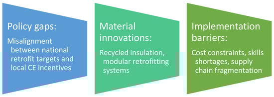 Our review suggests that the social aspects of implementing CE in retrofitting appear to represent the most significant knowledge gap. Homeowner perceptions regarding reused materials in retrofit projects appear to be under-explored [28]. Although extensive research on consumer acceptance of energy-efficiency measures exists, similar research examining attitudes toward material circularity in home renovations is non-existent [31]. Additionally, the challenges posed by the gap in construction professionals’ skills regarding circular retrofitting techniques are real [22]. The required competencies for the successful implementation of circular approaches in retrofitting contrast with conventional renovation methods, yet training programmes and educational frameworks addressing these differences remain underdeveloped [18].