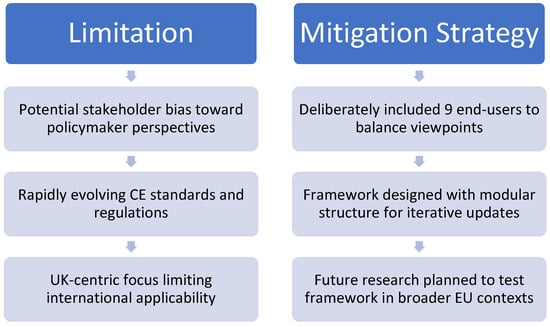 While rigorous, the study acknowledges certain limitations. A potential stakeholder bias toward policymaker perspectives was mitigated by deliberately including nine end-users to balance viewpoints. The challenge of rapidly evolving circular economy (CE) standards and regulations was addressed by designing the framework with a modular structure to allow for iterative updates. Lastly, while the research has a UK-centric focus, limiting its immediate international applicability, future research is planned to test the framework in broader EU contexts (see Figure 3).