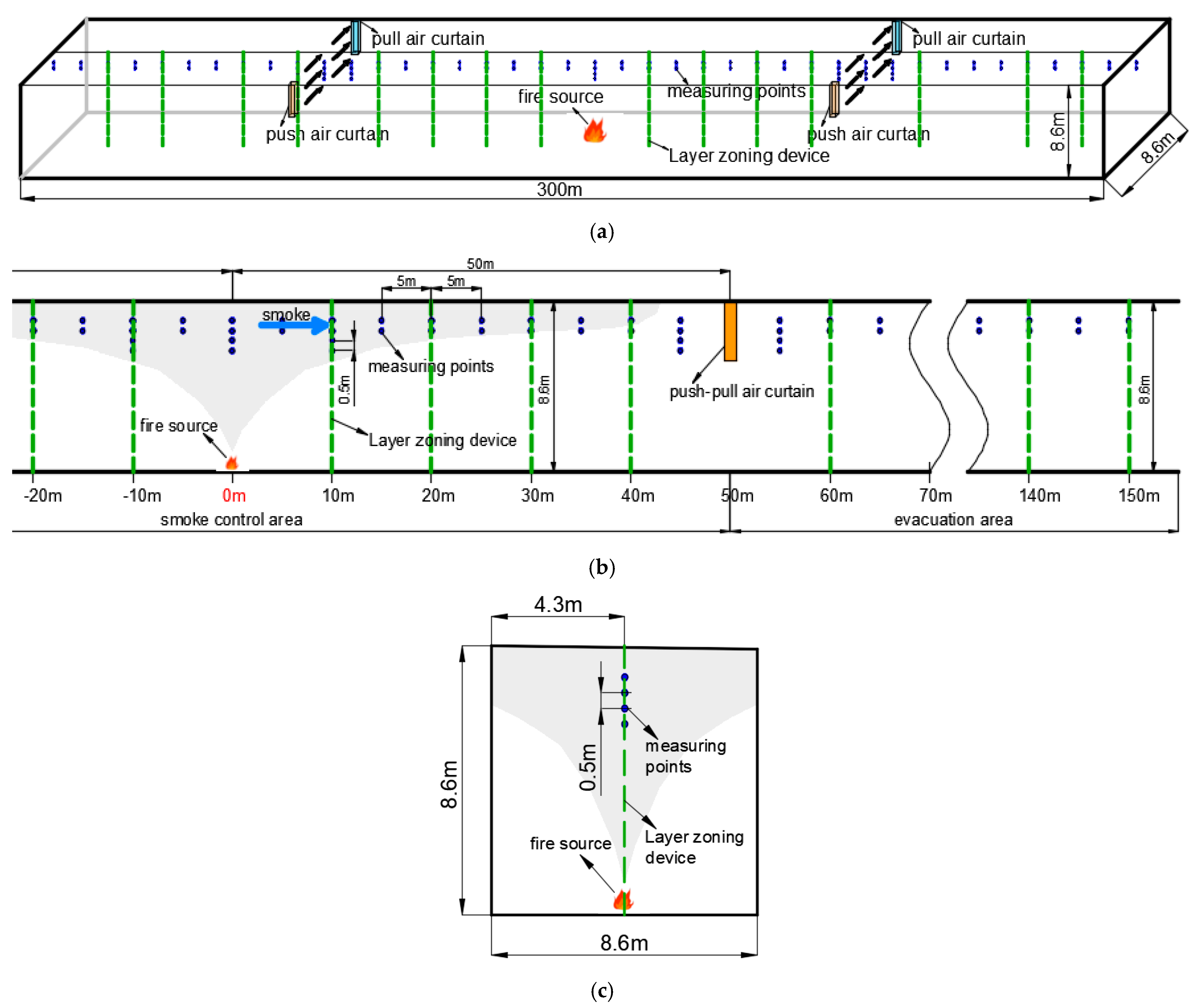 32]. Consequently, efforts have been made to analyze tunnel fire smoke dynamics with air curtains, aiming to optimize ventilation efficiency [