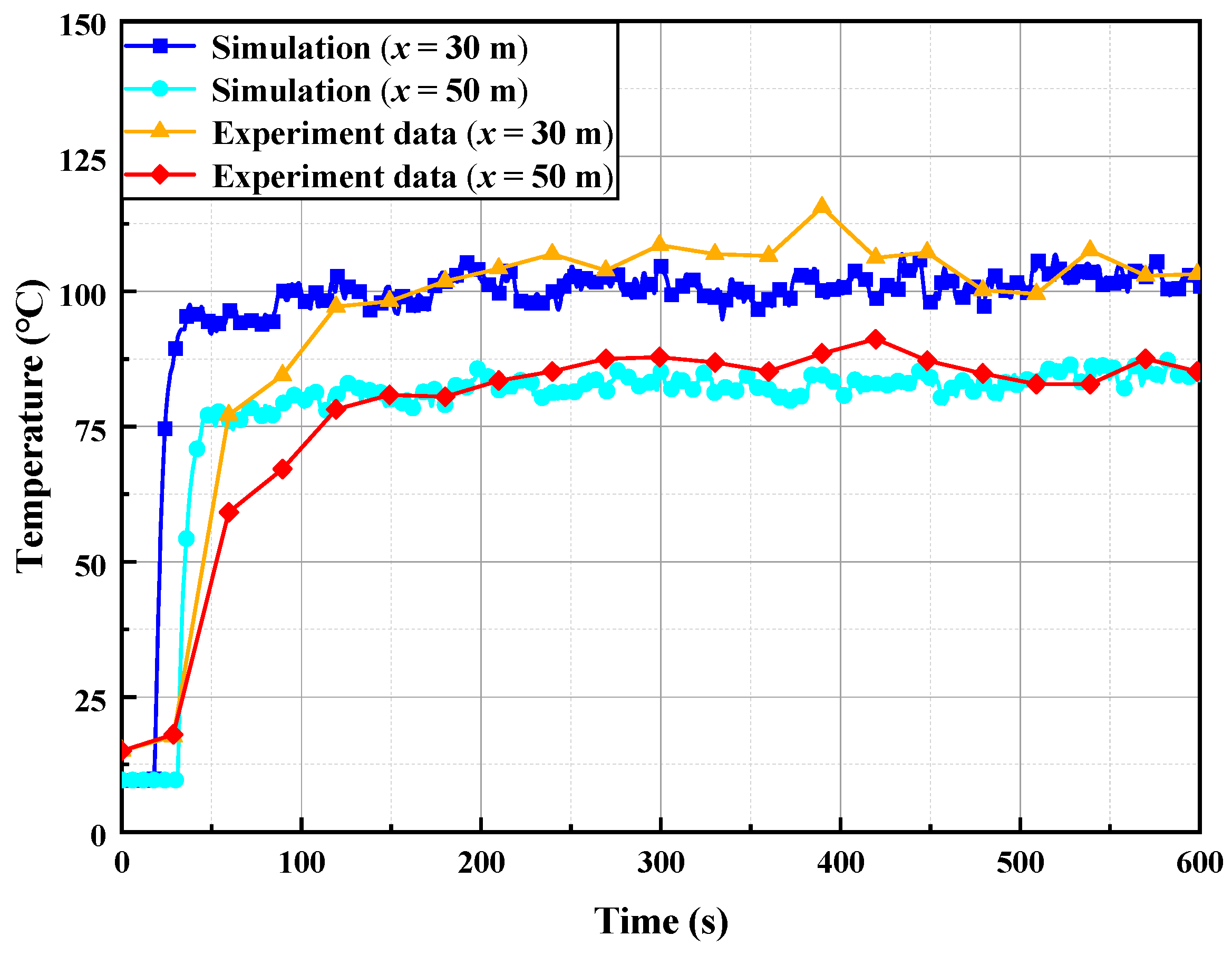 2 combustion area under ambient conditions of 9.6 °C and 0.45 m/s longitudinal airflow. Based on this full-scale tunnel fire experiment, temperature data measured 30 m and 50 m downstream of the fire source were selected for comparison with simulation results which were performed using environmental parameters and boundary conditions exactly identical to those in the experiment, including tunnel geometry, ambient temperature, longitudinal ventilation velocity, fire HRR, and combustion area (