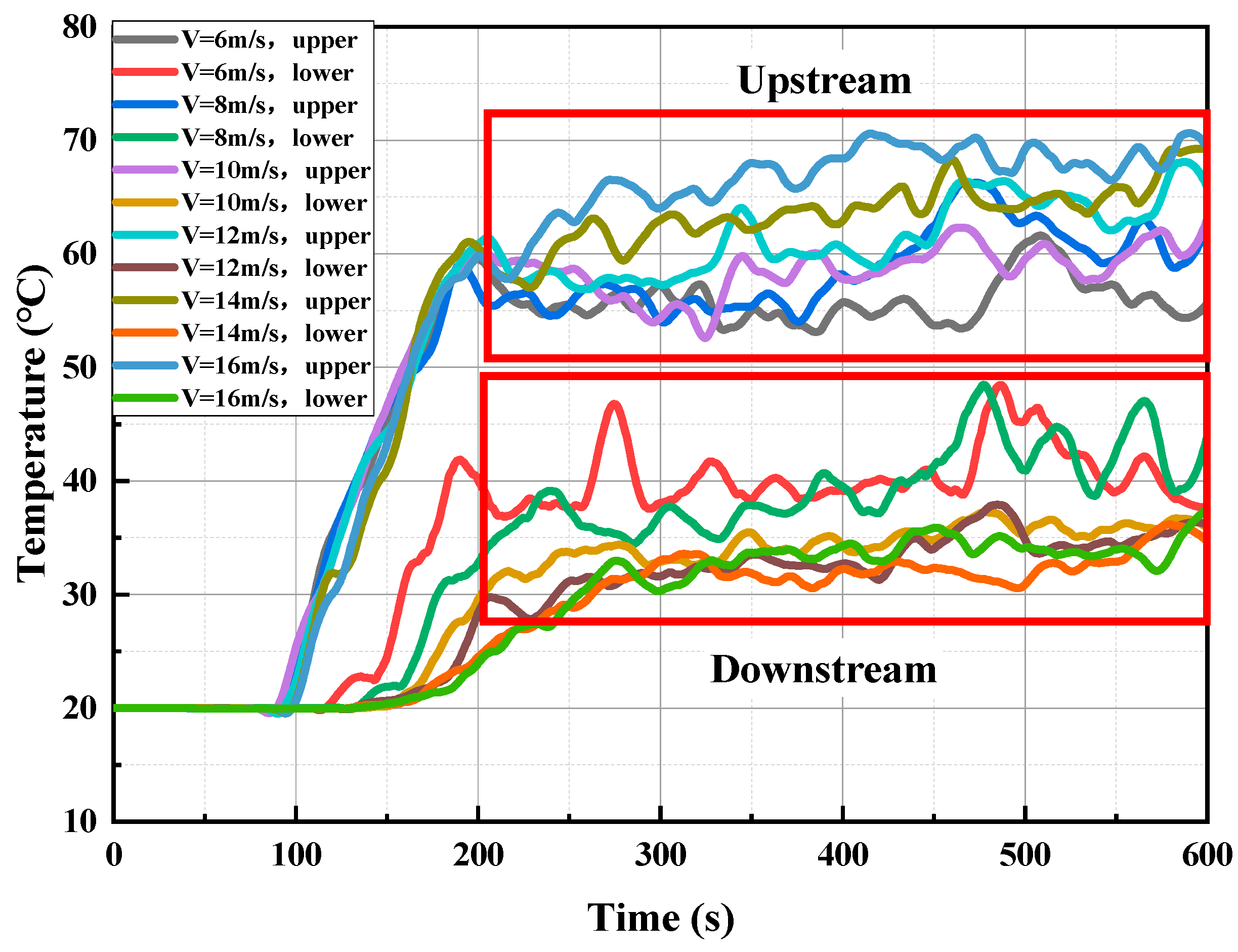 Figure 6 illustrates the effect of the lateral air curtain on the tunnel ceiling’s flue gas temperature at upstream and downstream locations (5 m from the air curtain) under various supply speeds. The temperature variation trends are clearly delineated, thereby simplifying the analysis of the overall temperature profile at the ceiling. Analysis reveals the air curtain induces distinct thermal stratification, demarcating the tunnel into upstream high-temperature and downstream low-temperature domains. With incremental airflow augmentation, the steady-state temperature in the upstream zone rises while that in the downstream zone decreases.