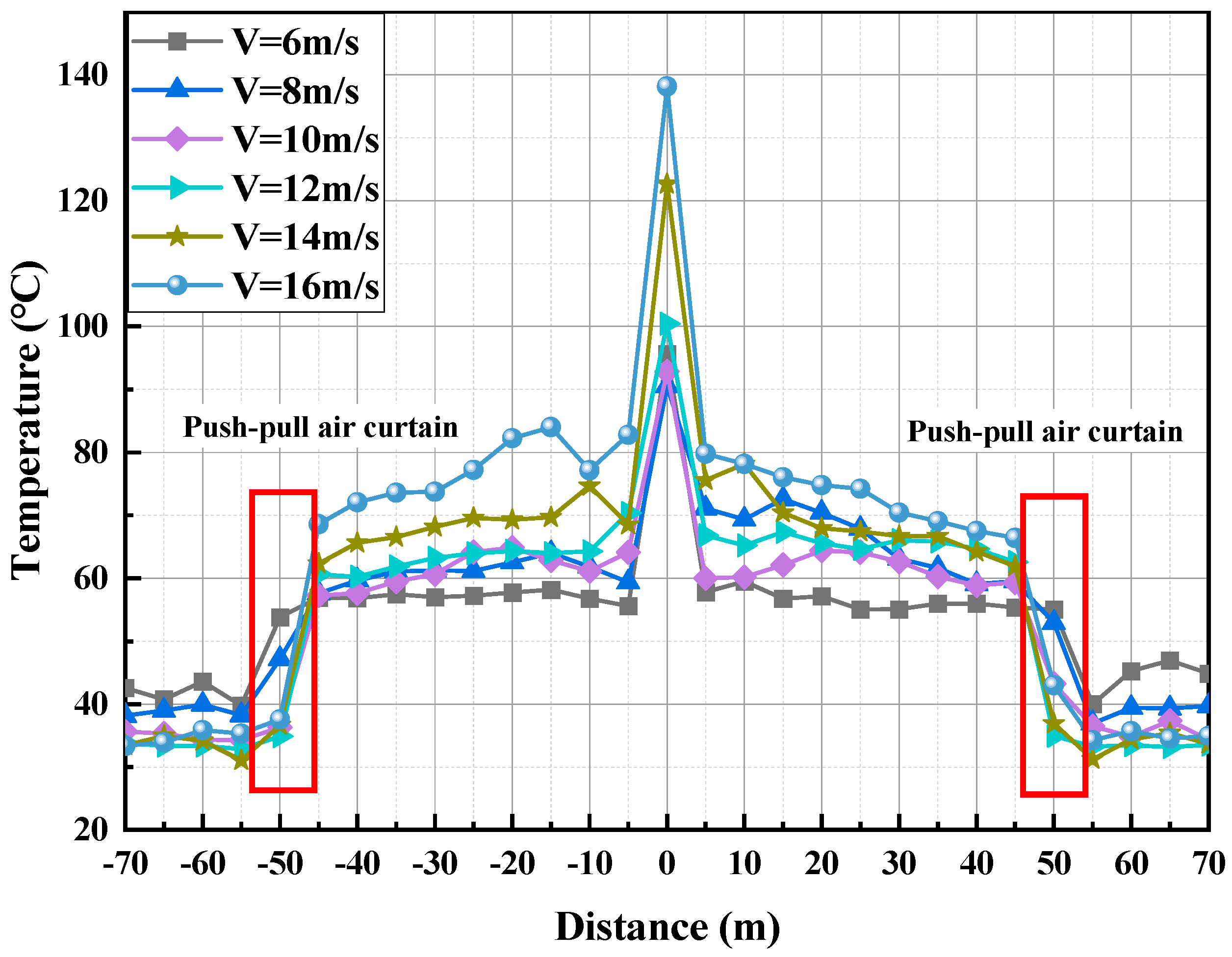 Figure 7). Results indicate that increasing the air supply velocity from 6 to 16 m/s markedly enhances the air curtain’s effect, effectively reducing downstream temperatures and establishing distinct upstream high-temperature and downstream low-temperature zones. Localized analysis in the 40–60 m region from the fire source reveals a temperature difference exceeding 20 °C between the smoke control and evacuation zones, mitigating high-temperature smoke damage to the tunnel structure. Specifically, at 6 m/s, upstream and downstream temperatures are 55.4 °C (±0.5 °C) and 36.9 °C (±0.5 °C) (ΔT = 18.4 °C), respectively; at 16 m/s, they shift to 67.5 °C (±0.5 °C) and 34.3 °C (±0.5 °C) (ΔT = 33.2 °C).