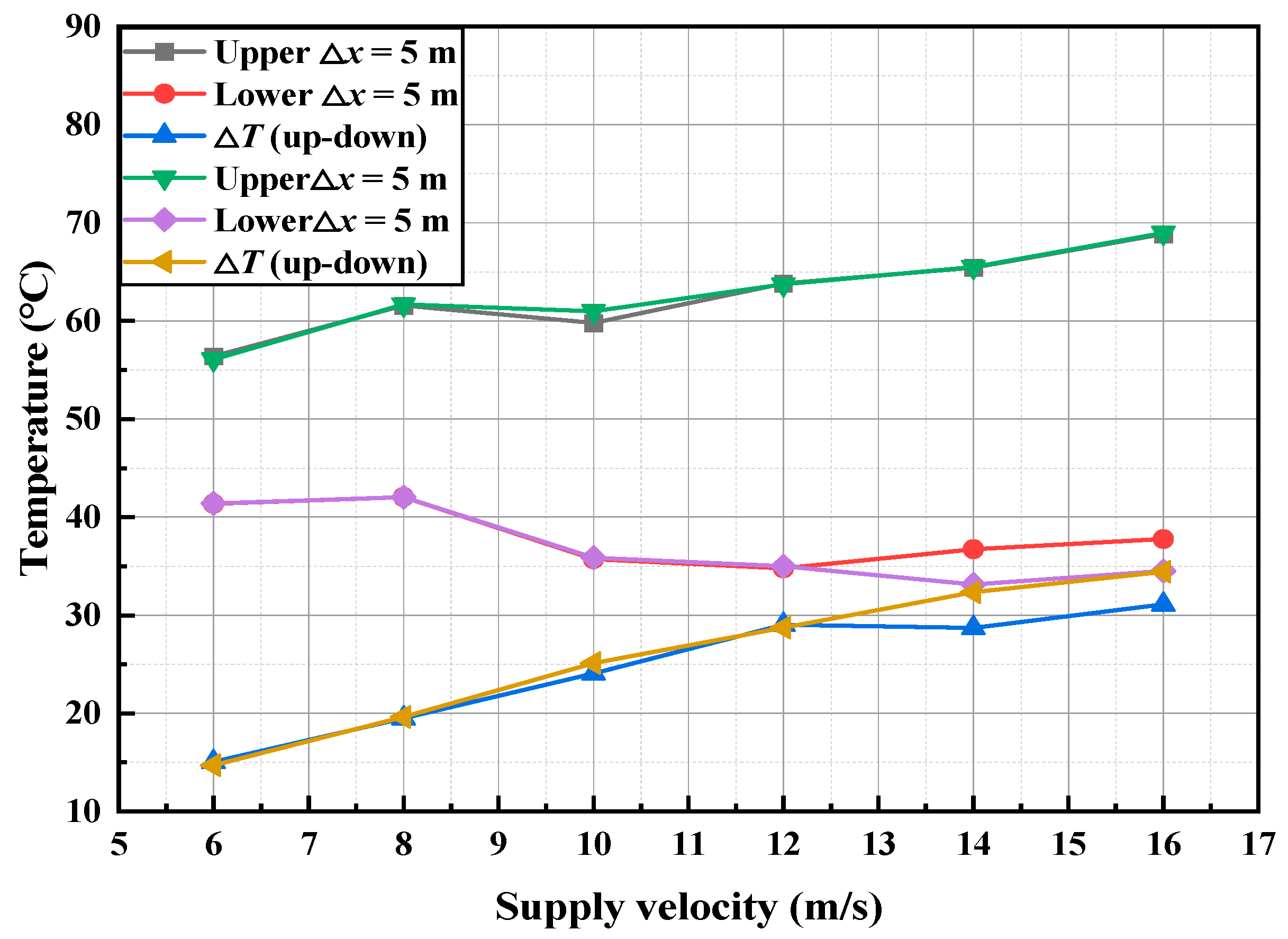 3.1. Effect of Air Curtain Velocity on Tunnel Temperature Distribution