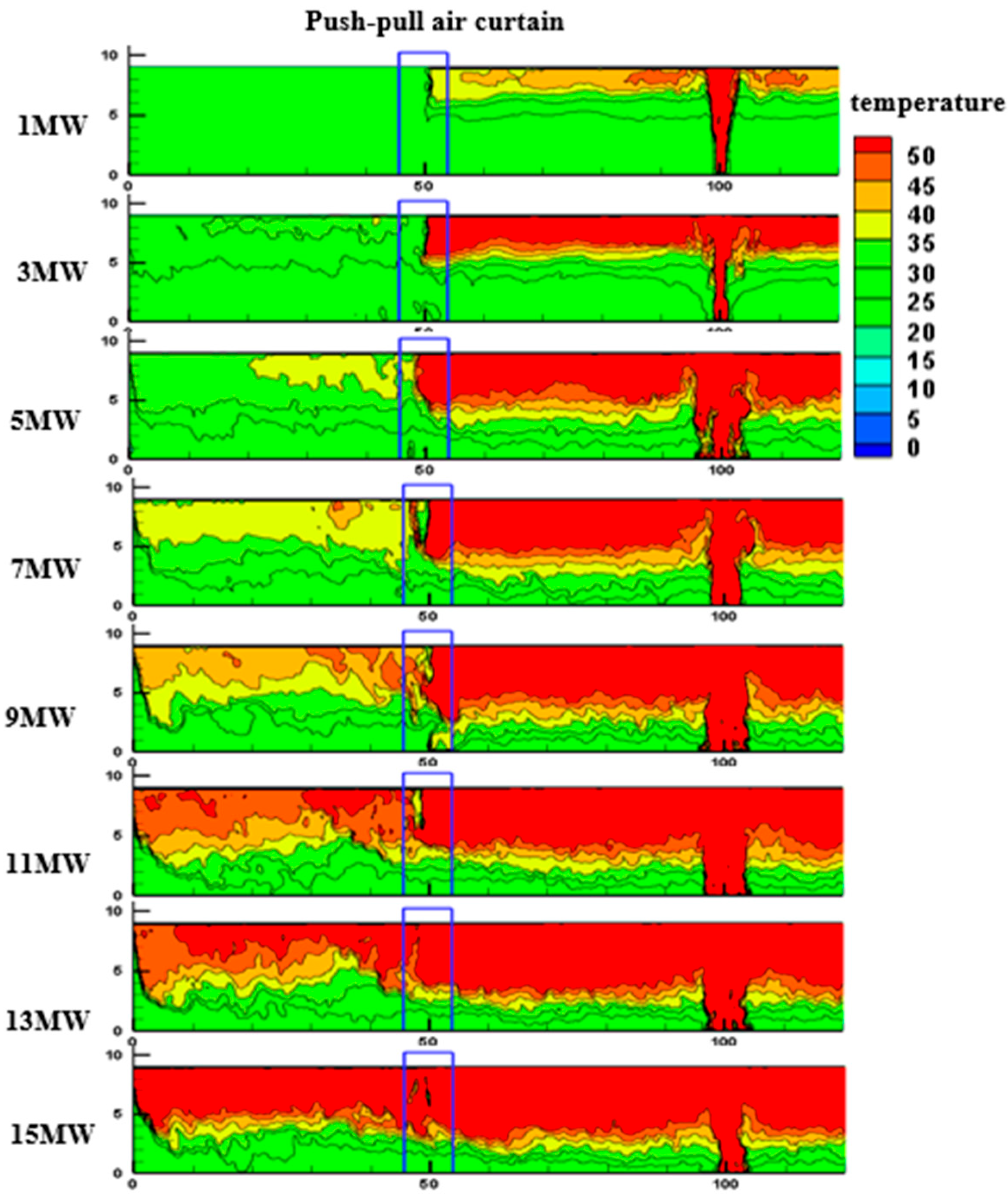 When the fire source is close to the air curtain, the temperature on the side closest to the fire source gradually increases, while the side farther from the fire source is less affected. Reduced separation distances between the air curtain and fire source amplify upstream–downstream thermal gradients. When the fire source is within 10 m, there is a sharp increase in overall temperature. This phenomenon is due to the intense entrainment and impact of the high-temperature smoke near the fire source. High-temperature, high-momentum smoke strikes the air curtain, making it easier for the smoke to penetrate the air curtain. Therefore, when the fire source is too close, it reaches a critical point that disrupts the effect of the air curtain.