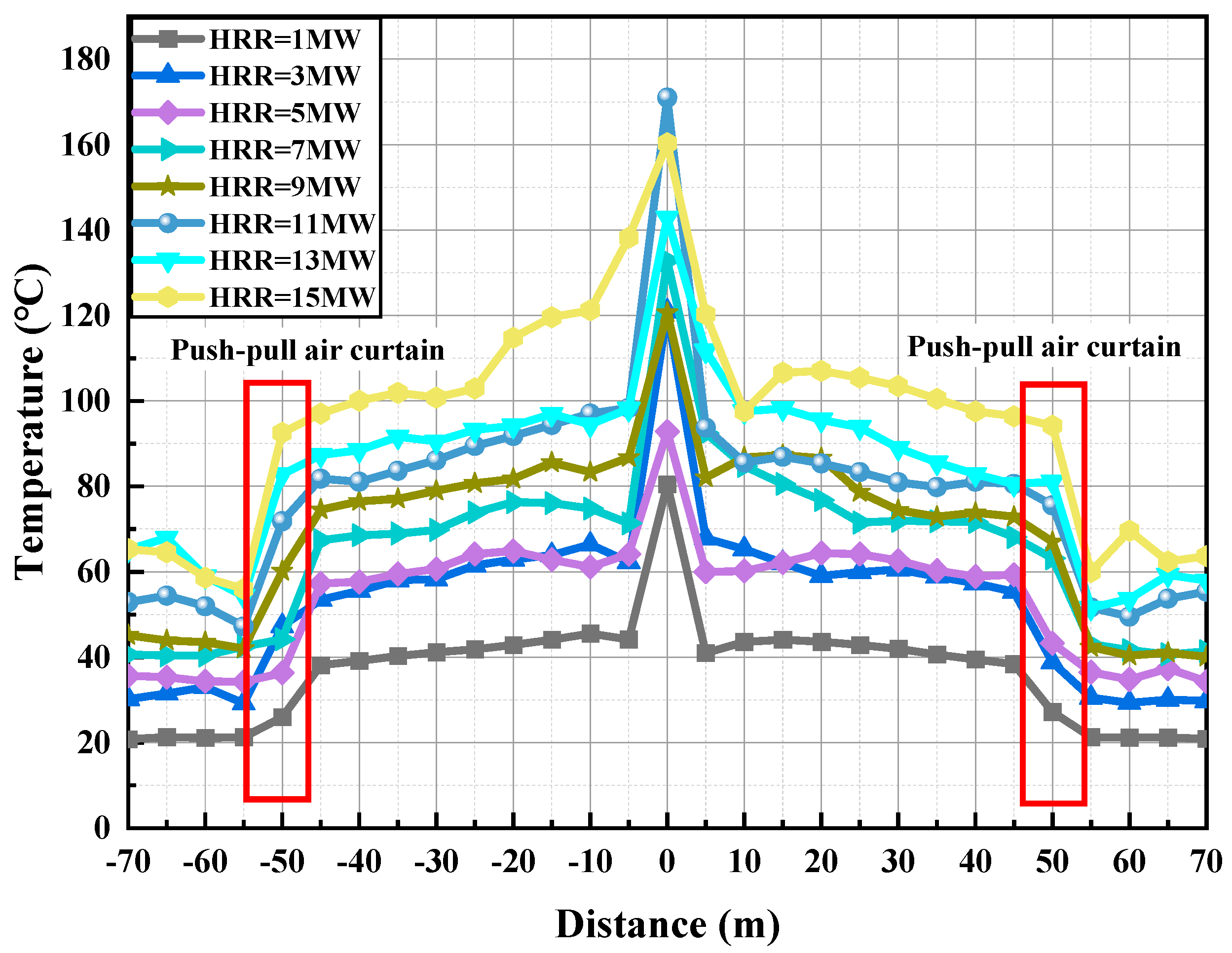 Figure 11). The results indicate that the ceiling temperature rises with higher HRR, and the transverse air curtain effectively reduces downstream smoke temperature and concentration. The air curtain significantly reduces hot smoke temperature, increasing the temperature difference between areas before and after its operation, especially with rising HRR.
