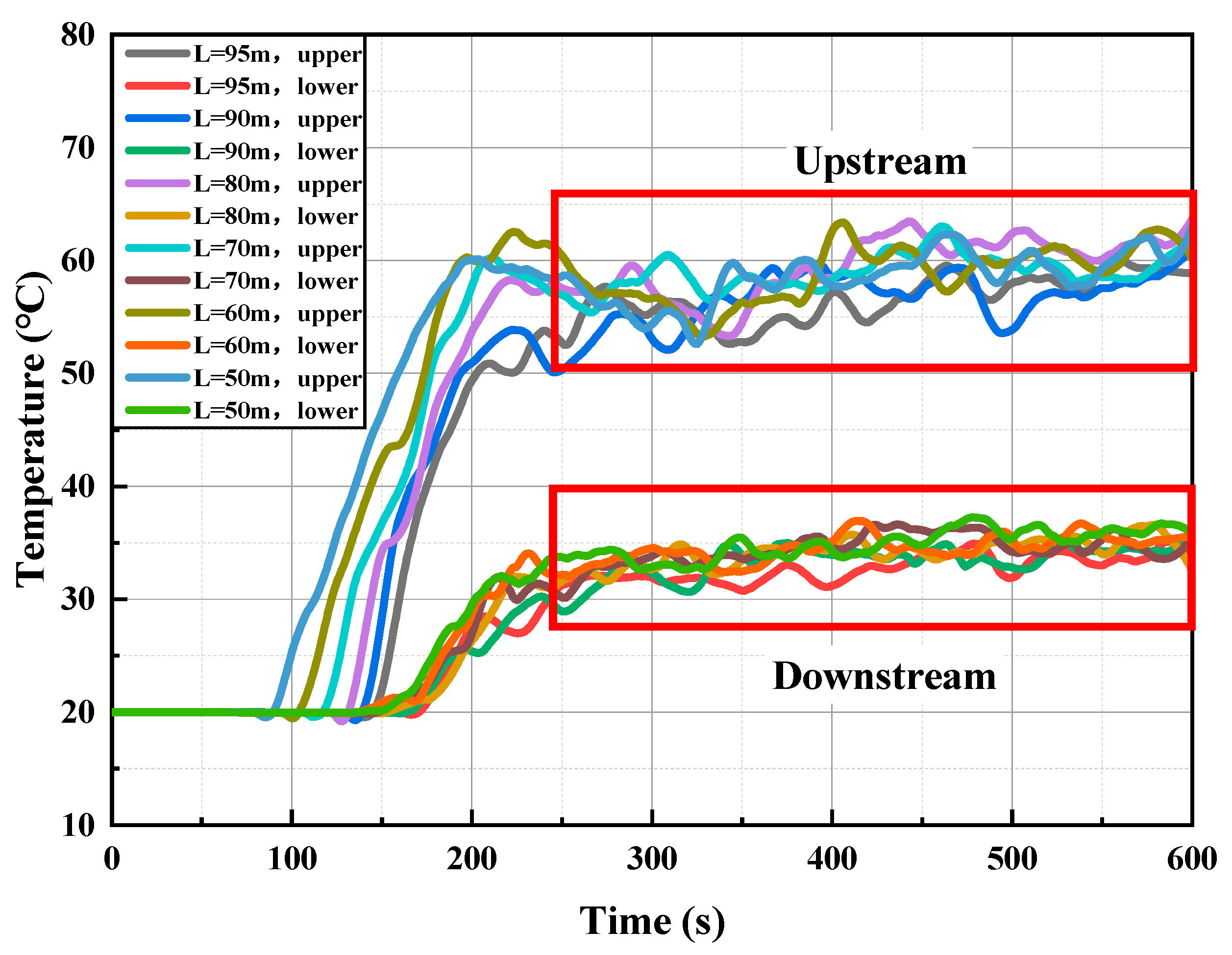 Figure 13 illustrates the impact of transverse air curtains on ceiling smoke temperature distribution at varying fire source distances. The data is simplified to highlight temperature trends. The results indicate that the air curtain creates a high-temperature region upstream and a low-temperature region downstream. Increasing the fire source distance from 50 m to 95 m does not significantly affect upstream and downstream temperatures but delays the time for smoke to reach the upstream measurement point. Specifically, with the fire source 50 m from the air curtain, smoke reaches the upstream measurement point in approximately 95 s and stabilizes after 200 s. At a 95 m distance, the arrival time extends to 150 s. Despite these delays, the air curtain effectively maintains a temperature difference exceeding 20 °C between upstream and downstream regions.